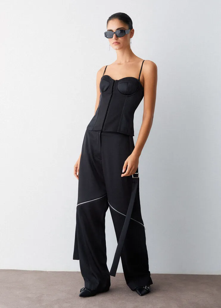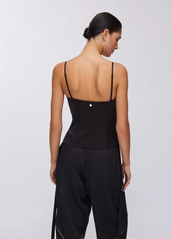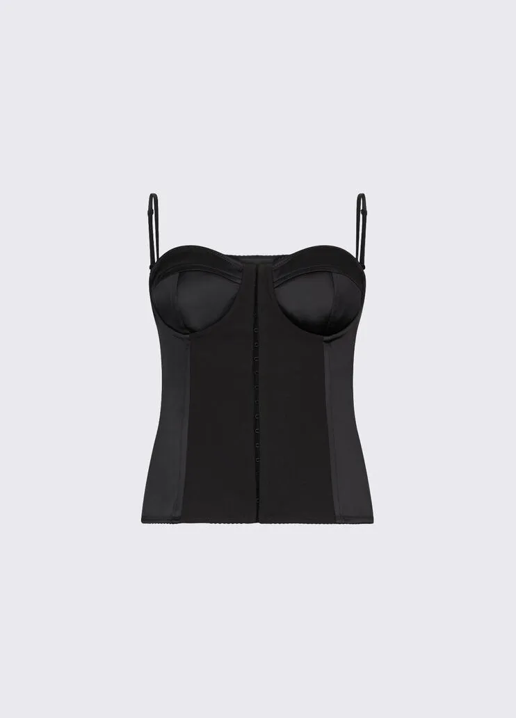 - ChiuIl tocco fluido del raso incontra il taglio bustier di questo top nero. Perfetto di giorno, irresistibile di serasura con gancetti nascosti sul davanti