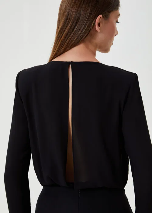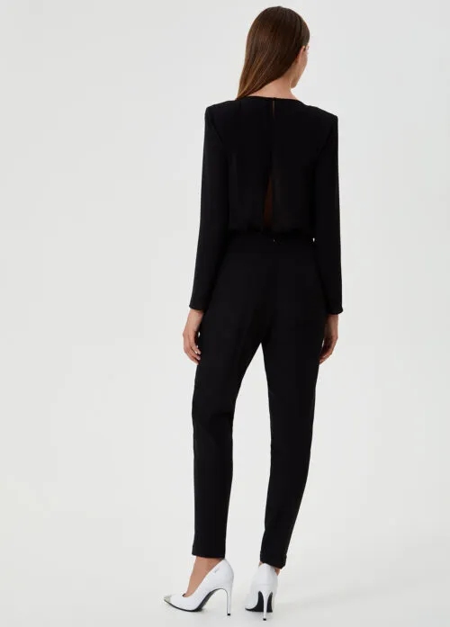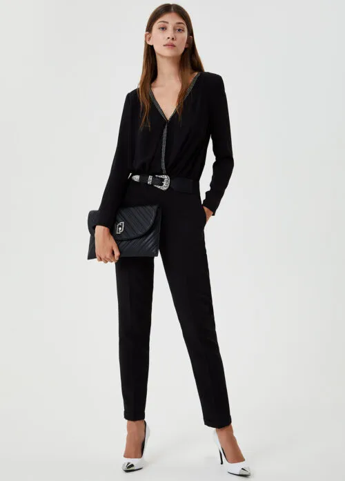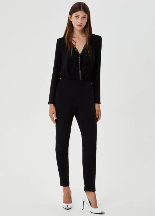 - LIUJO TUTA ELEGANTE CF0189 Tuta elegante realizzata in un tessuto stretch con top in georgette dal profondo scollo a V impreziosito da strass, spalline imbottite e un ampio cut out sul dietro. Il modello si chiude con una zip invisibile sul dietro e un piccolo bottone dietro al collo.