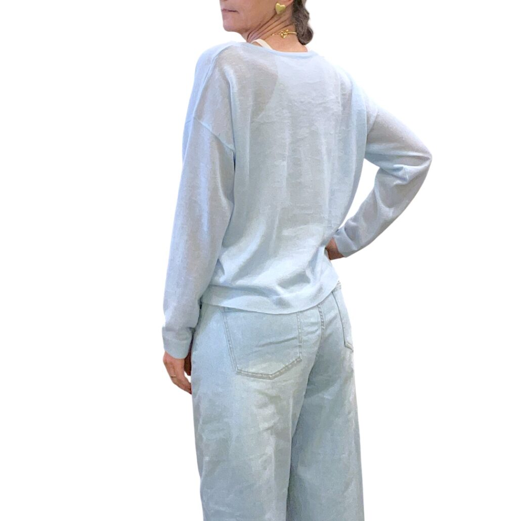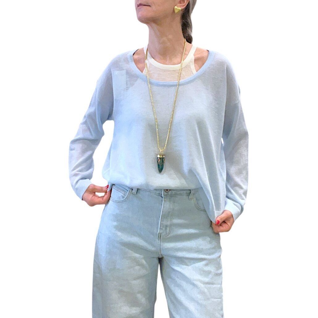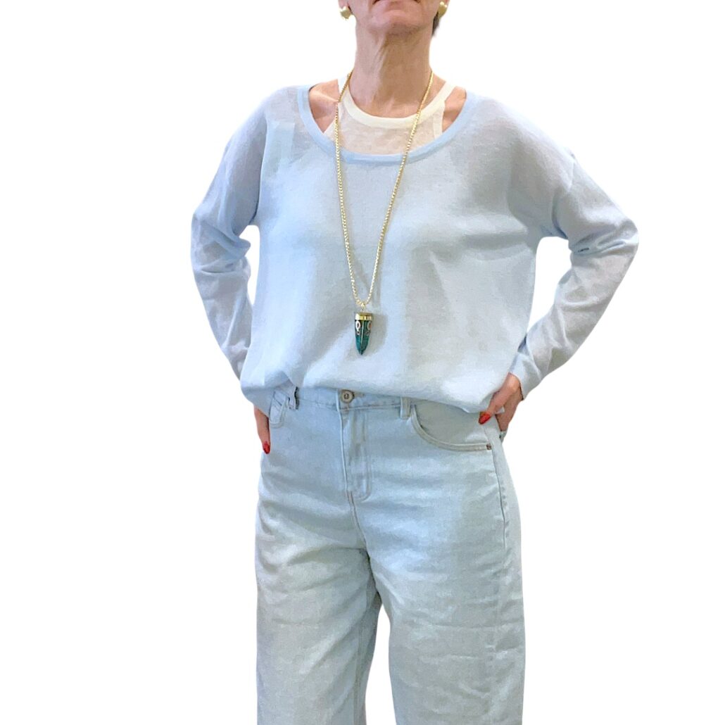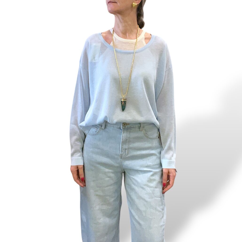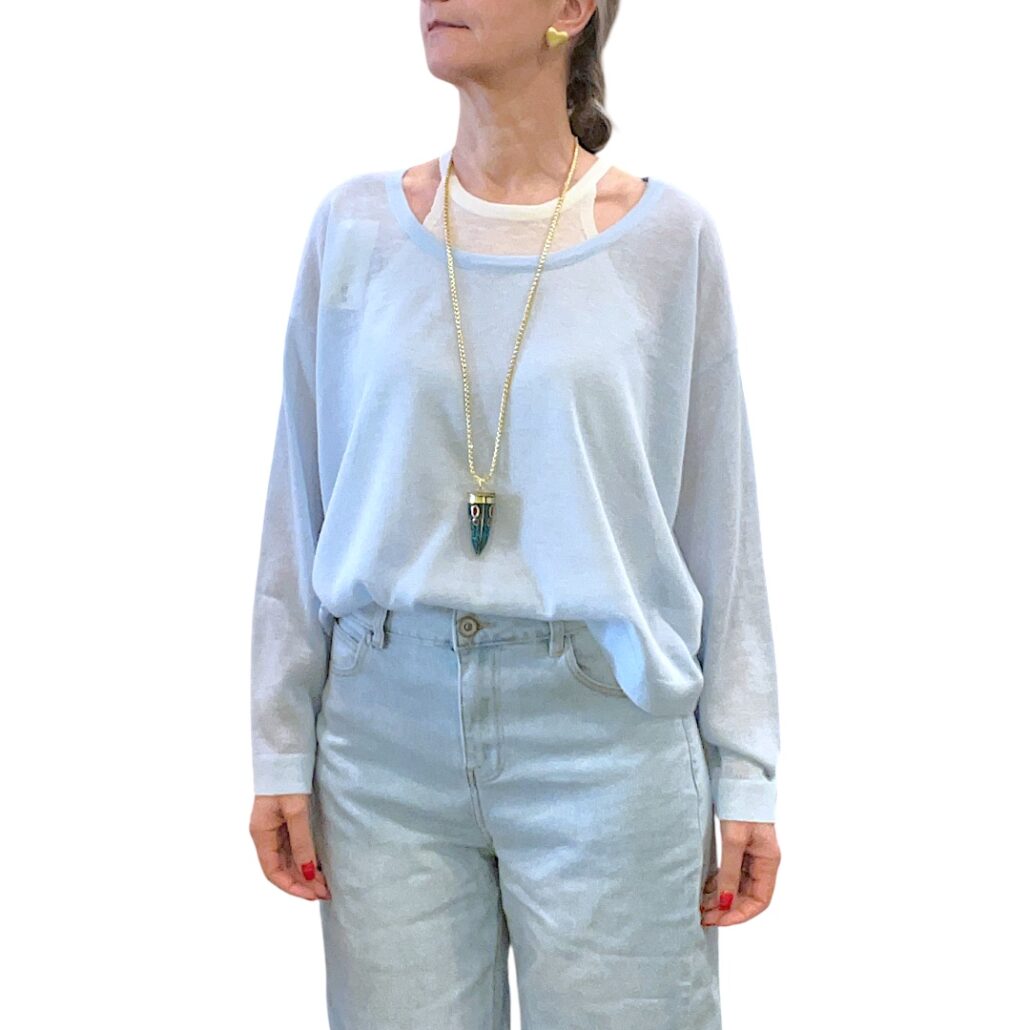 Maglia in filo azzurra. Manca lunga. Scollo a barchetta. Taglio a scatoletta. Abbinata canotta stretch color panna. Misto viscosa. Giro petto 126 cm – Lunghezza 54 cm