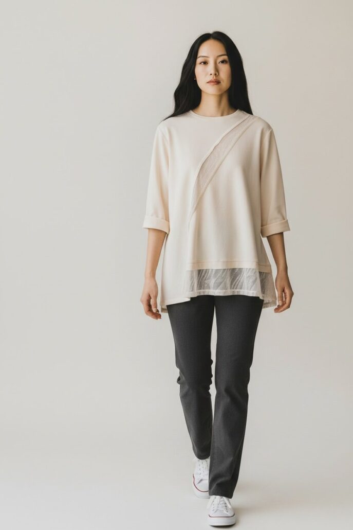 Misto cotone caldo elasticizzato color burro. Taglio svasato. Inserti in diagonale in maglia. Maniche con risvolto. Collo ampio. Color burro Giro petto 105 cm – Lunghezza 67 cm