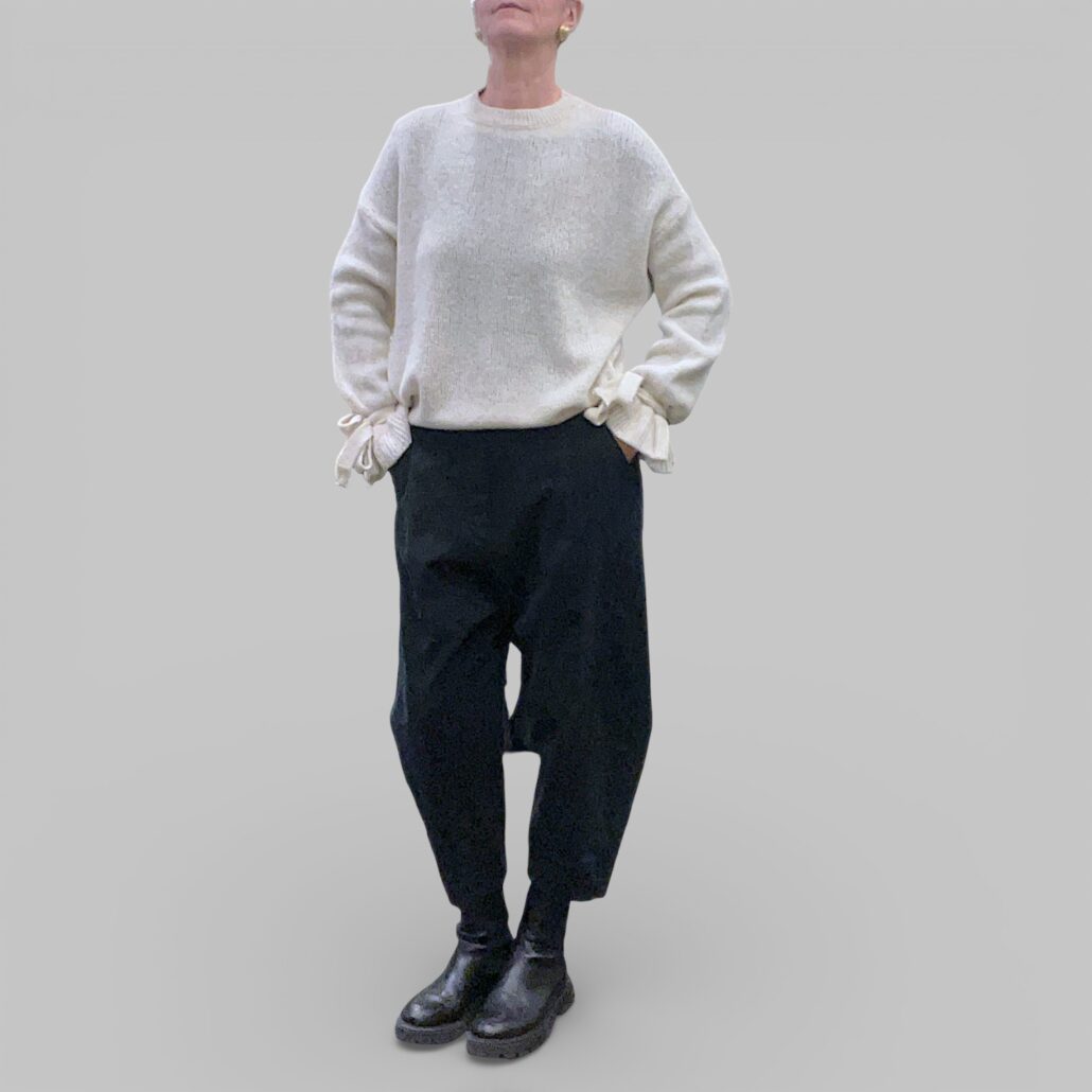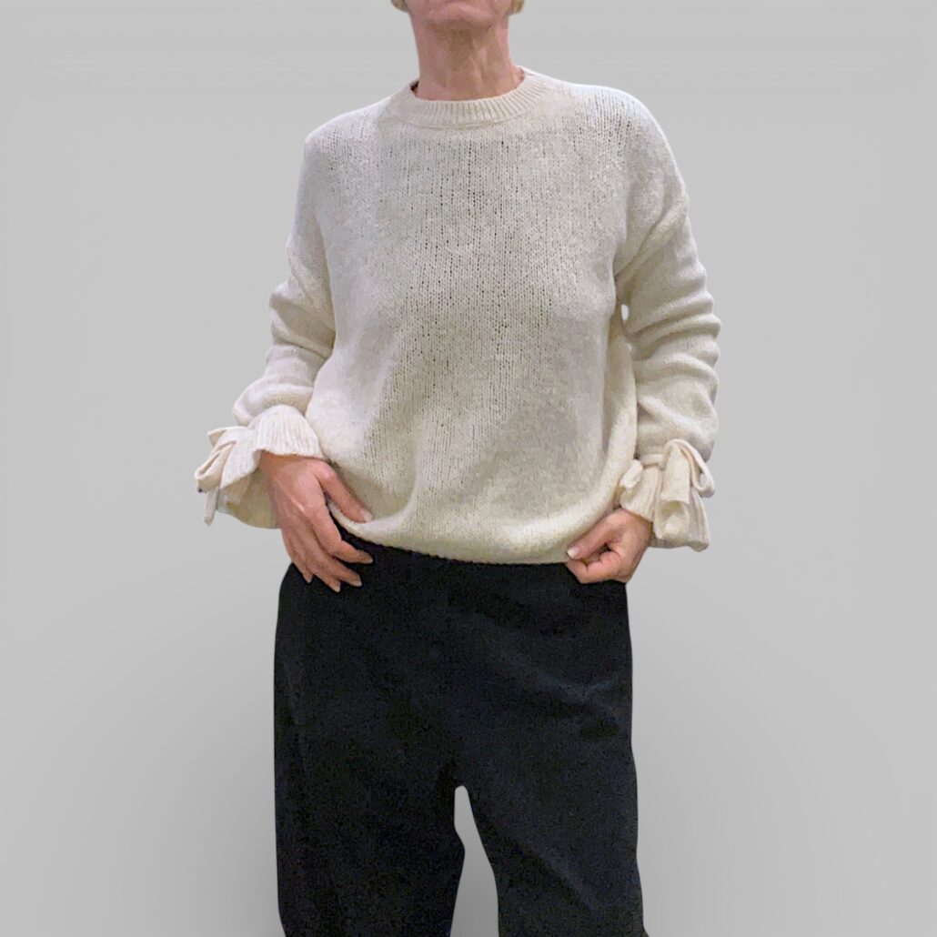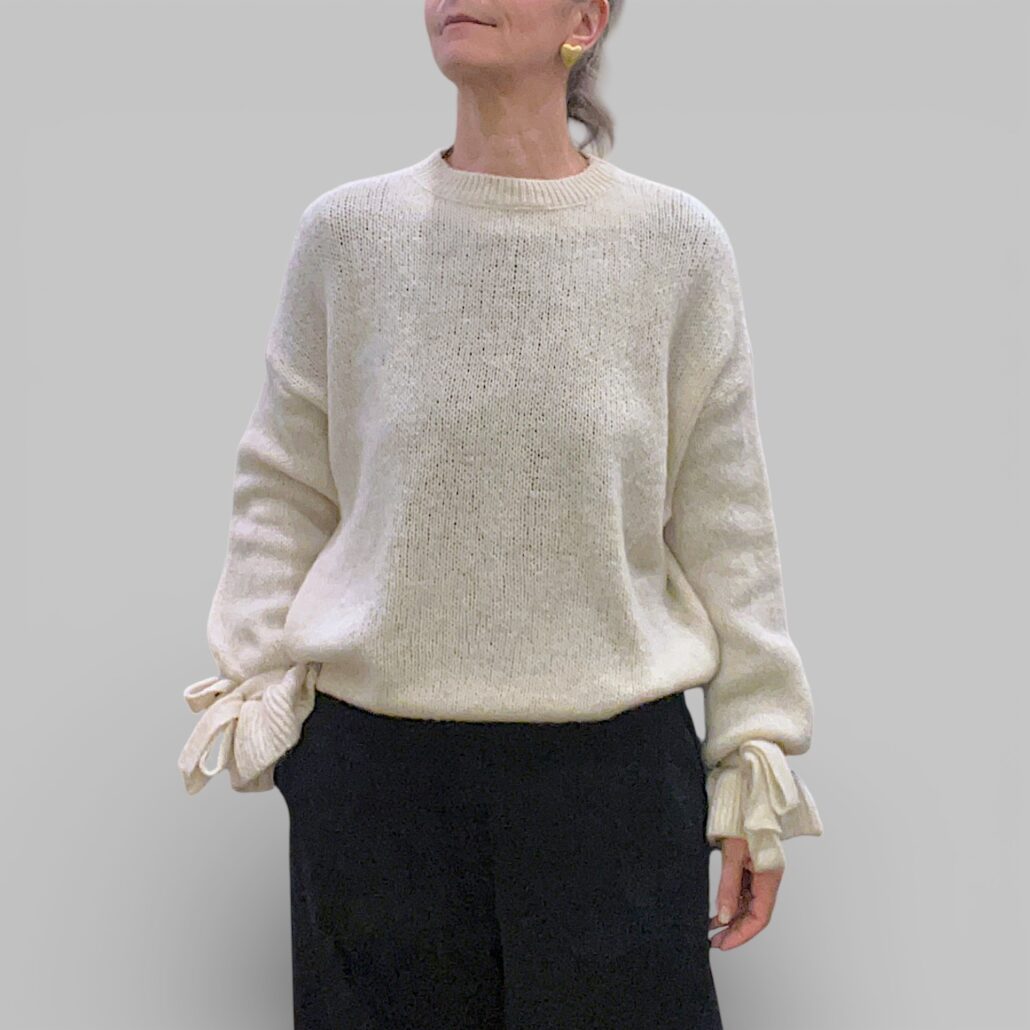 Maglia in misto lana, morbida. Spalle scese. Maniche lunghe con laccio avvolto attorno ai polsi. Taglio a scatola. Lunghezza 60 cm Giro petto 120 cm