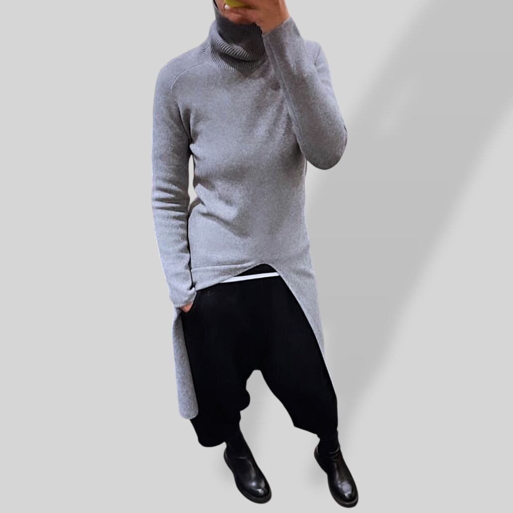 Maglia lunga con collo alto grigio in misto viscosa elasticizzata. Spacco frontale. Maniche lunghe. Made in Italy. Taglia unica – vestibilità dalla Tg. 40 alla Tg. 44 – (La persona in foto è una taglia 44)
