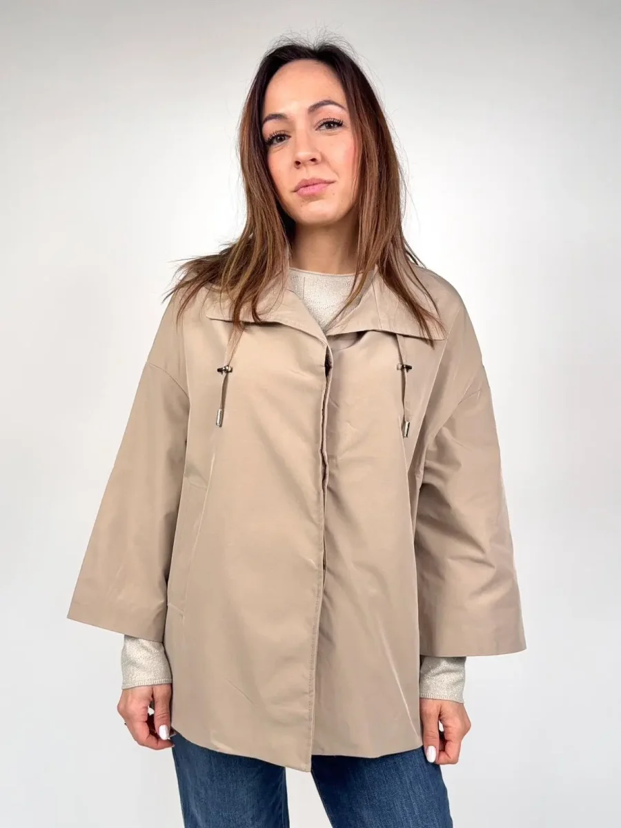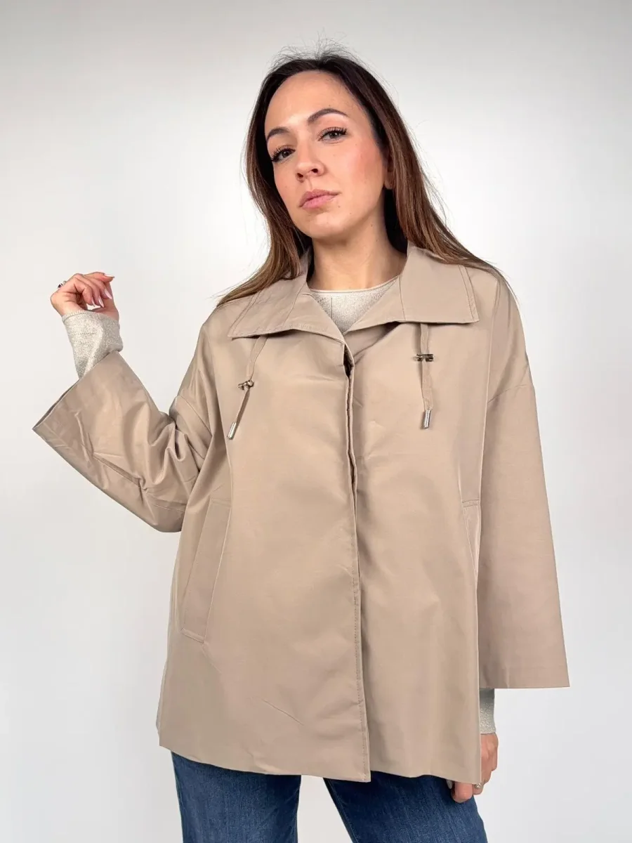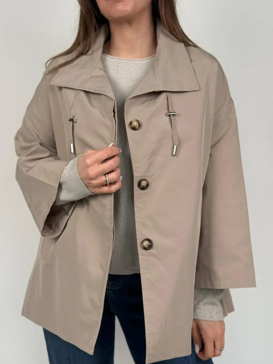 Giacca trench modello AIDA Questa esclusiva giacca corta, si distingue per una silhouette a mantella audace, pulita e ultra-contemporanea. Il taglio è decisamente oversize e non strutturato, con maniche estremamente ampie a campana che conferiscono un drammatico effetto cappa e massimizzano la libertà di movimento. L’orlo è asimmetrico e pulito, più corto sul davanti per un tocco moderno. Dettagli Chiave: Collo: Ampio e strutturato, tipo camicia, che può essere portato aperto o chiuso. Chiusura: Frontale, nascosta dietro una patta pulita, per un’estetica minimalista (probabilmente a pressione o con zip). Coulisse: Un dettaglio di design unico è la coulisse con terminali…