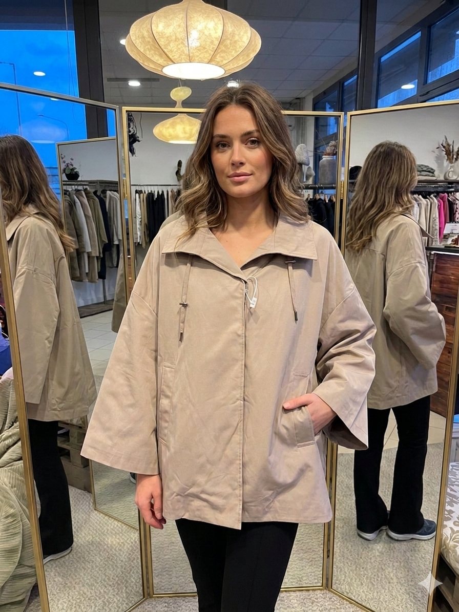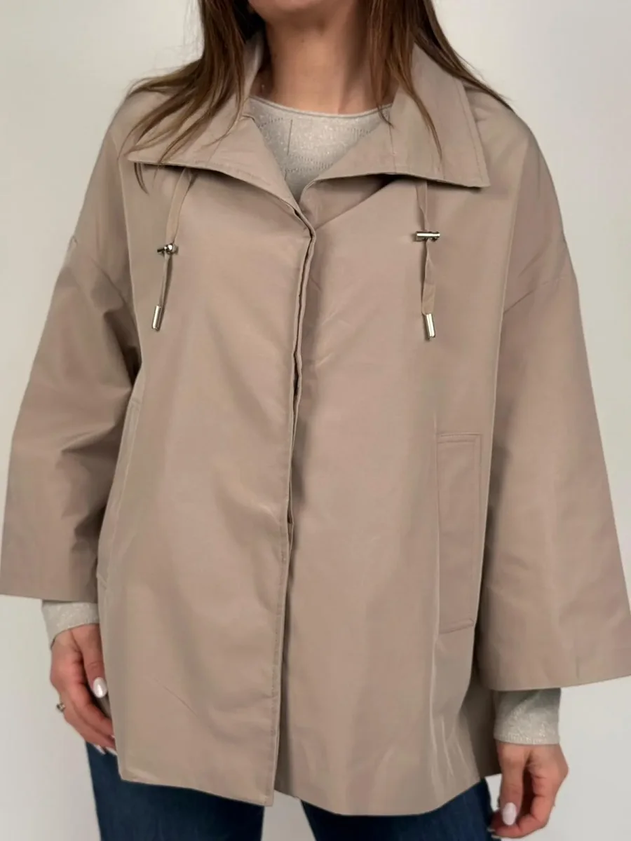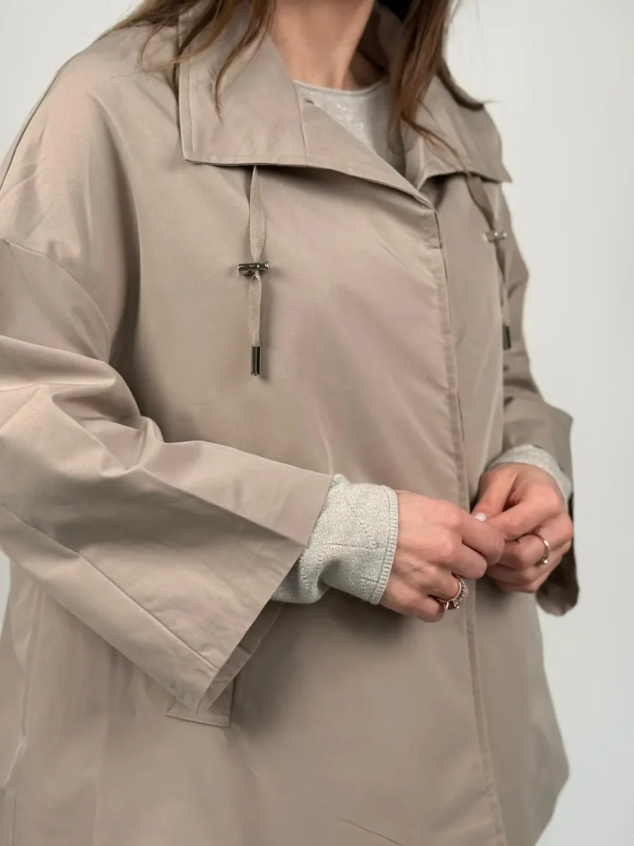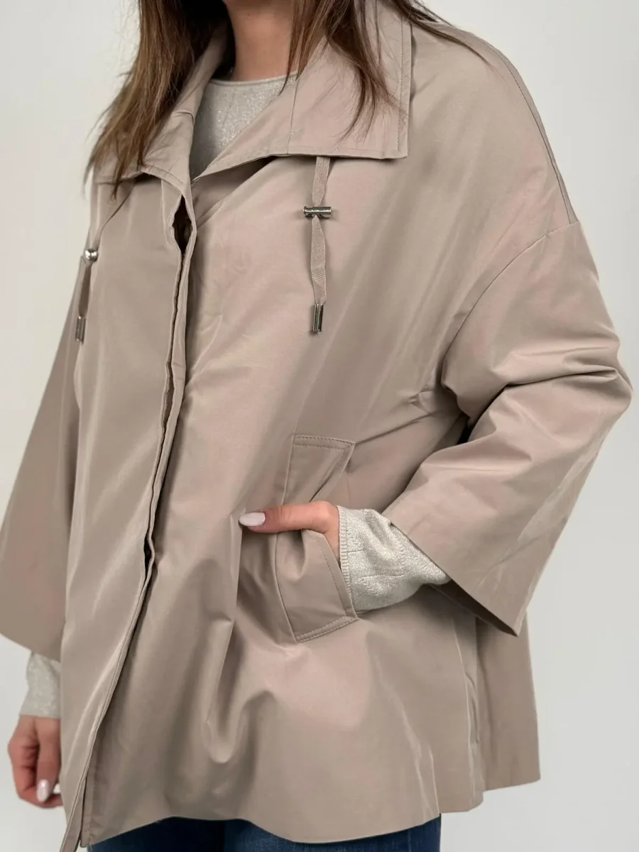 Giacca trench modello AIDA Questa esclusiva giacca corta, si distingue per una silhouette a mantella audace, pulita e ultra-contemporanea. Il taglio è decisamente oversize e non strutturato, con maniche estremamente ampie a campana che conferiscono un drammatico effetto cappa e massimizzano la libertà di movimento. L’orlo è asimmetrico e pulito, più corto sul davanti per un tocco moderno. Dettagli Chiave: Collo: Ampio e strutturato, tipo camicia, che può essere portato aperto o chiuso. Chiusura: Frontale, nascosta dietro una patta pulita, per un’estetica minimalista (probabilmente a pressione o con zip). Coulisse: Un dettaglio di design unico è la coulisse con terminali…