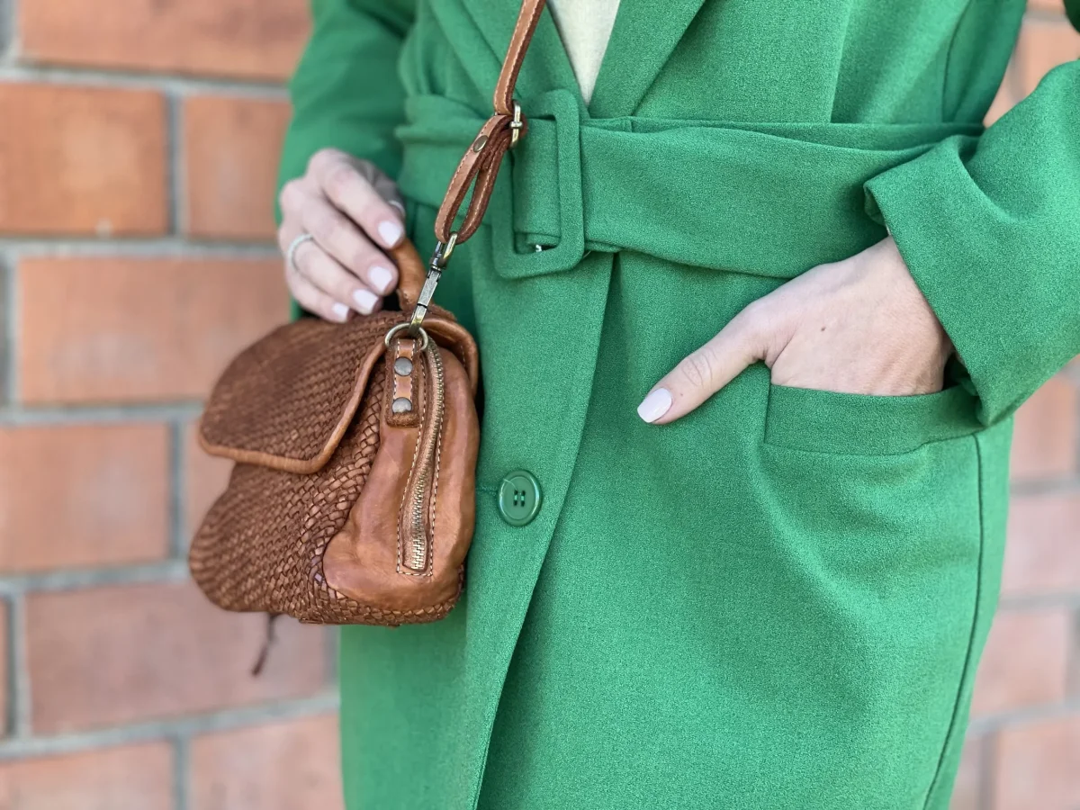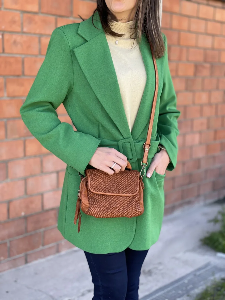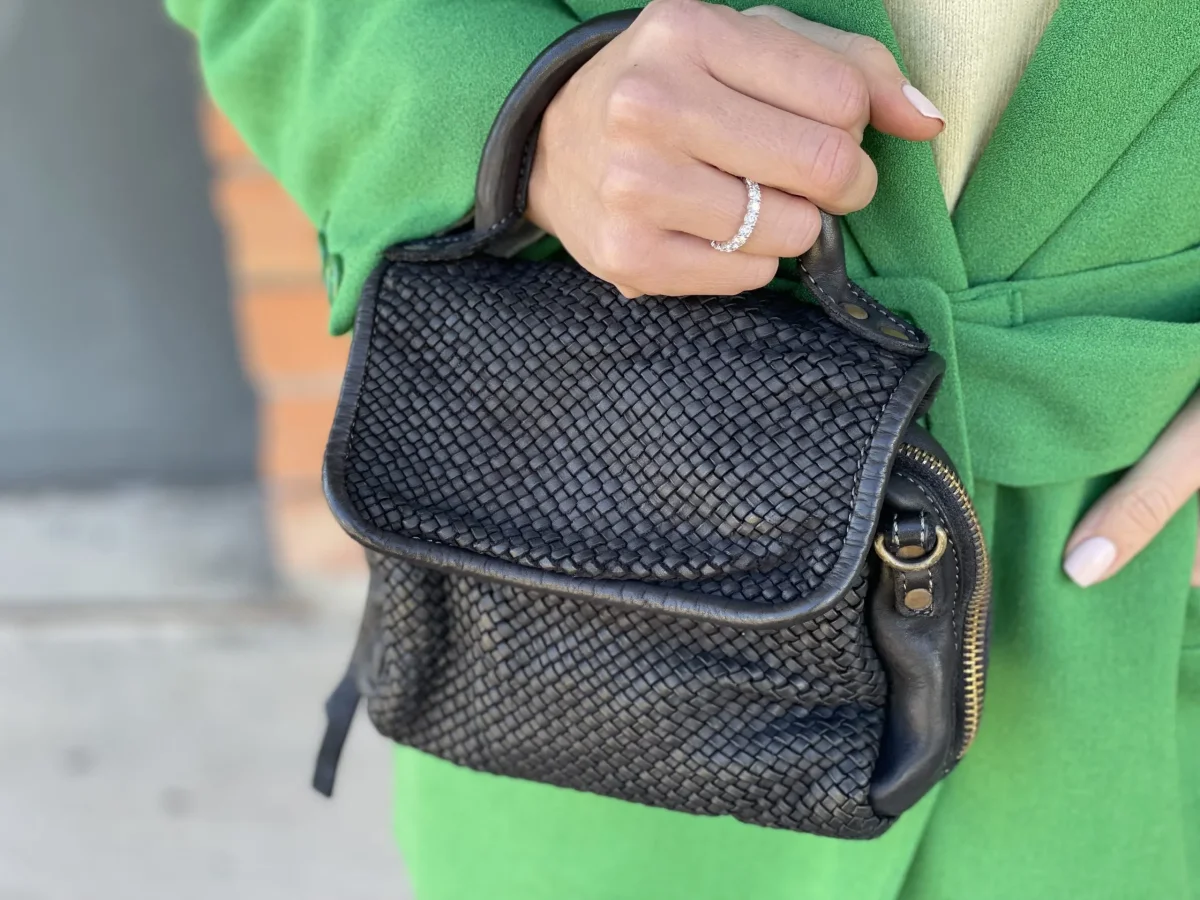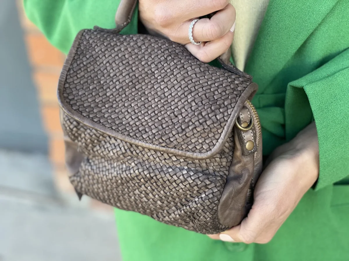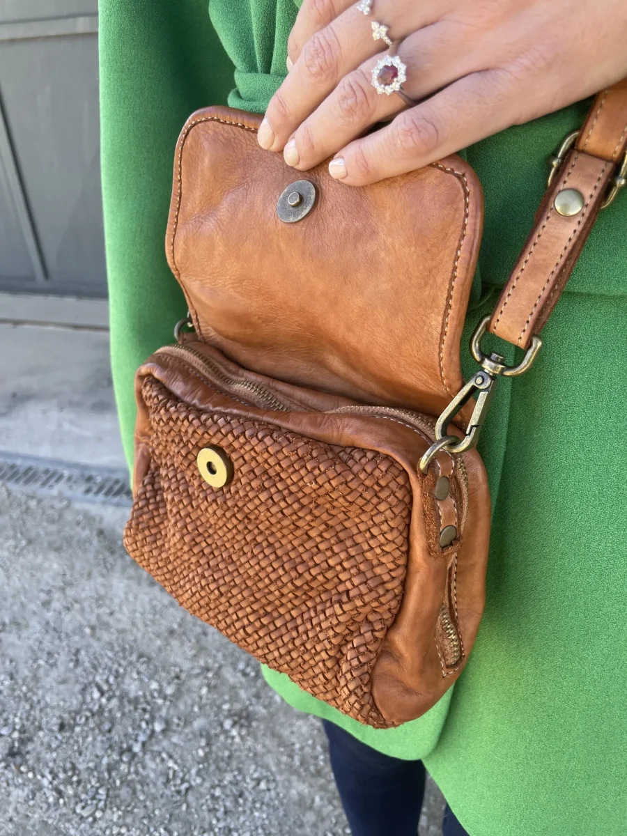 Minibag modello MIMI in vera pelle intrecciata. Chiusura con bottone automatico e zip su tutto il perimetro per una maggior apertura. Tasca interna con chiusura lampo. Dotata di tracolla. Dimensioni: 20 x 13 x 7 cm Lavorazione artigianale italiana