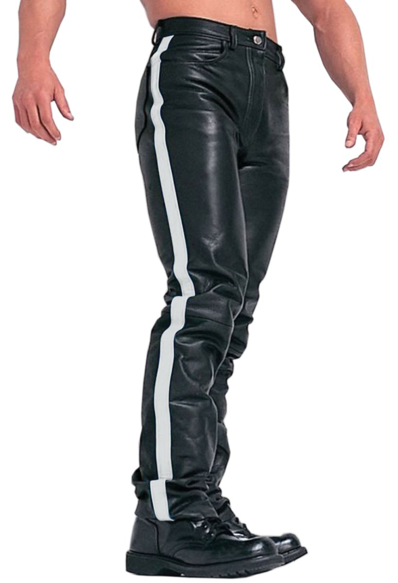 Pantalone da Uomo in Vera Pelle Nera con Striscia Laterale Bianca