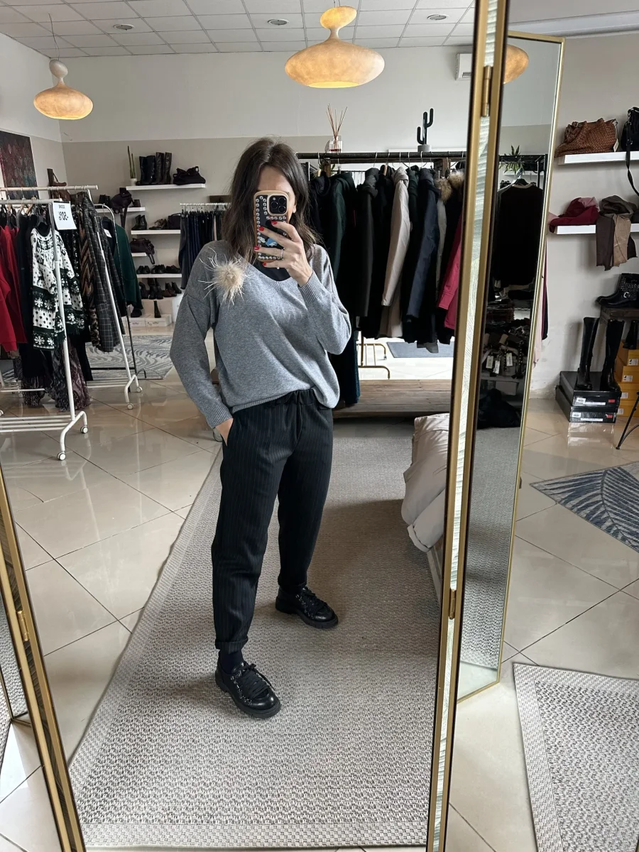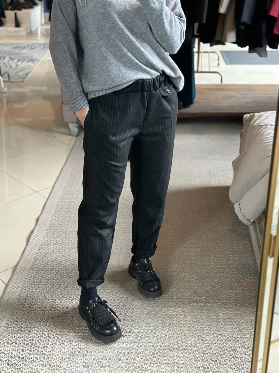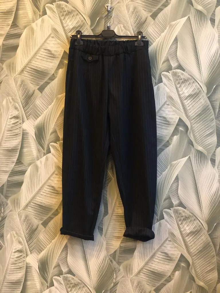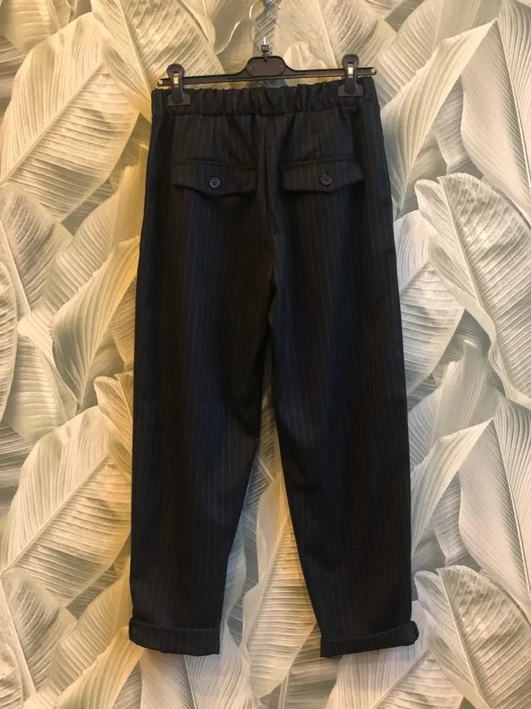 Pantalone gessato modello baggy Composizione: 55% poliestere 32% viscosa 3% elastane Disponibile nelle taglie S M L, Made in Italy