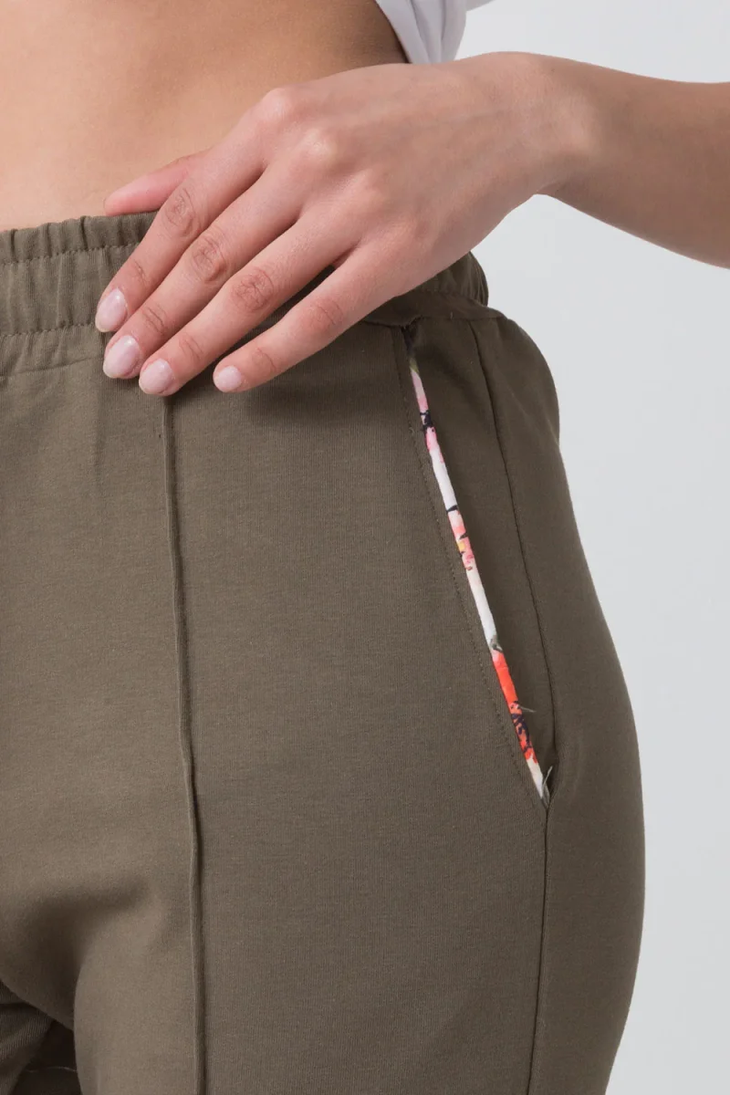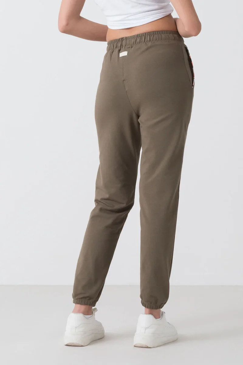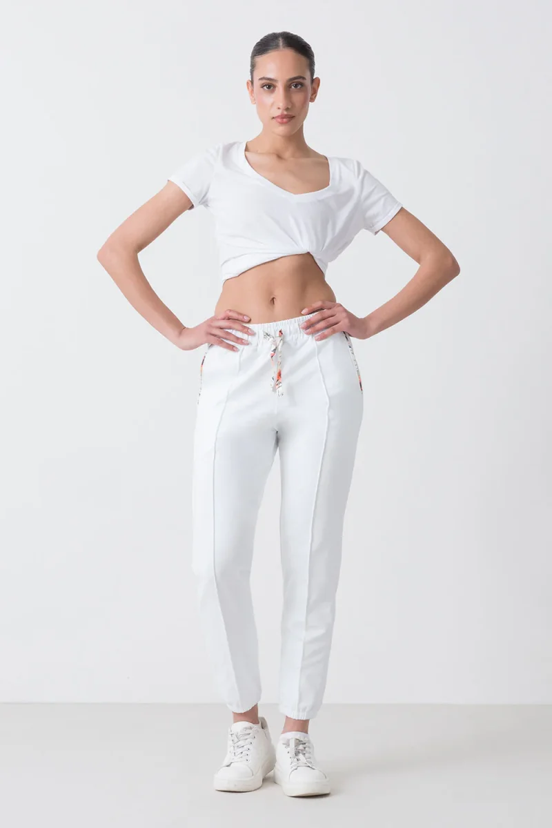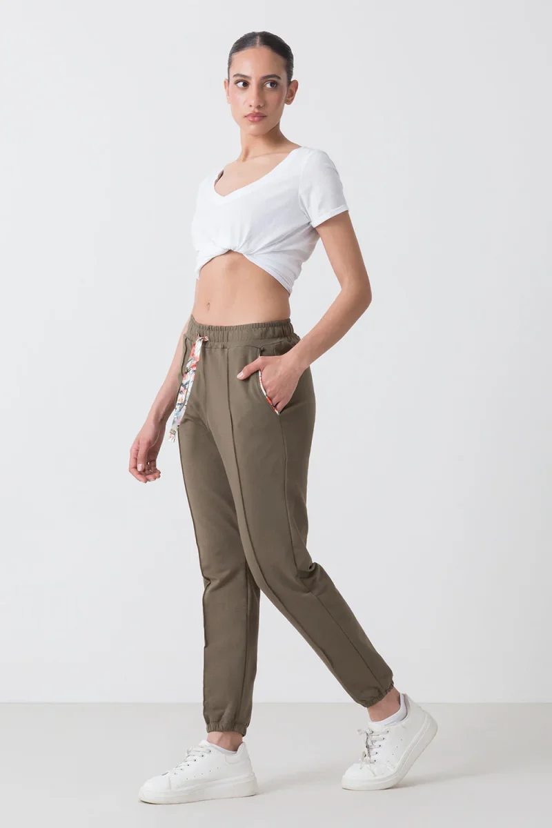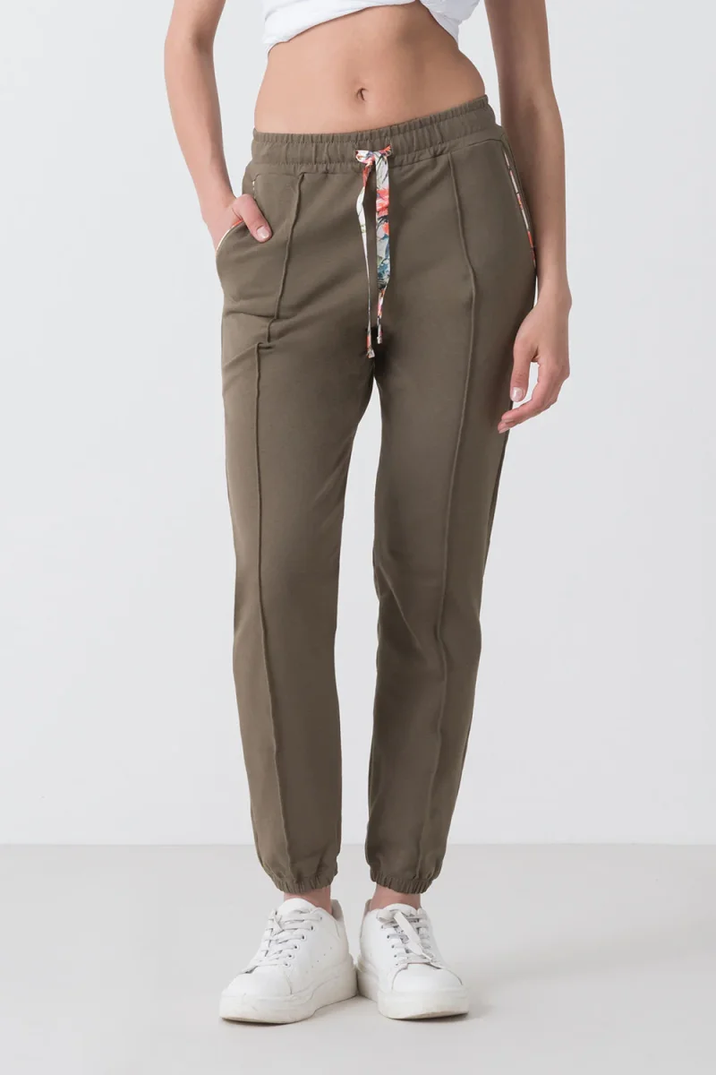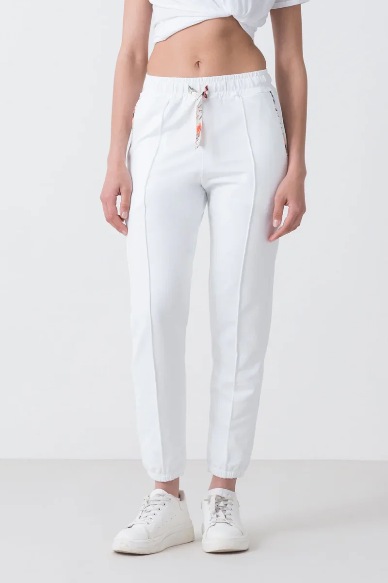 Pantalone con elastico al fondo realizzato in morbida felpa stretch. Il suo design unico รจ arricchito da dettagli floreali sulla coulisse e sul profilo delle tasche, che donano un tocco accattivante e fresco. Ideale per un look casual e trendy che non passa inosservato. Scopri ora!