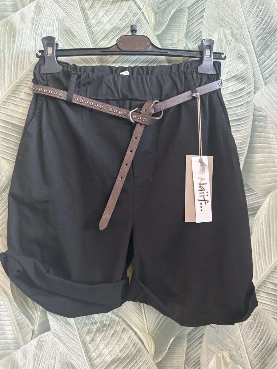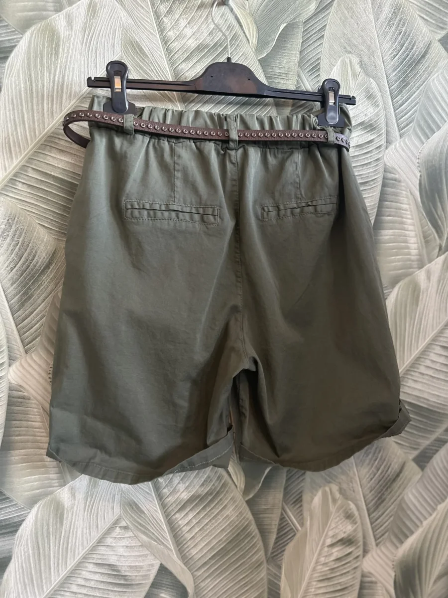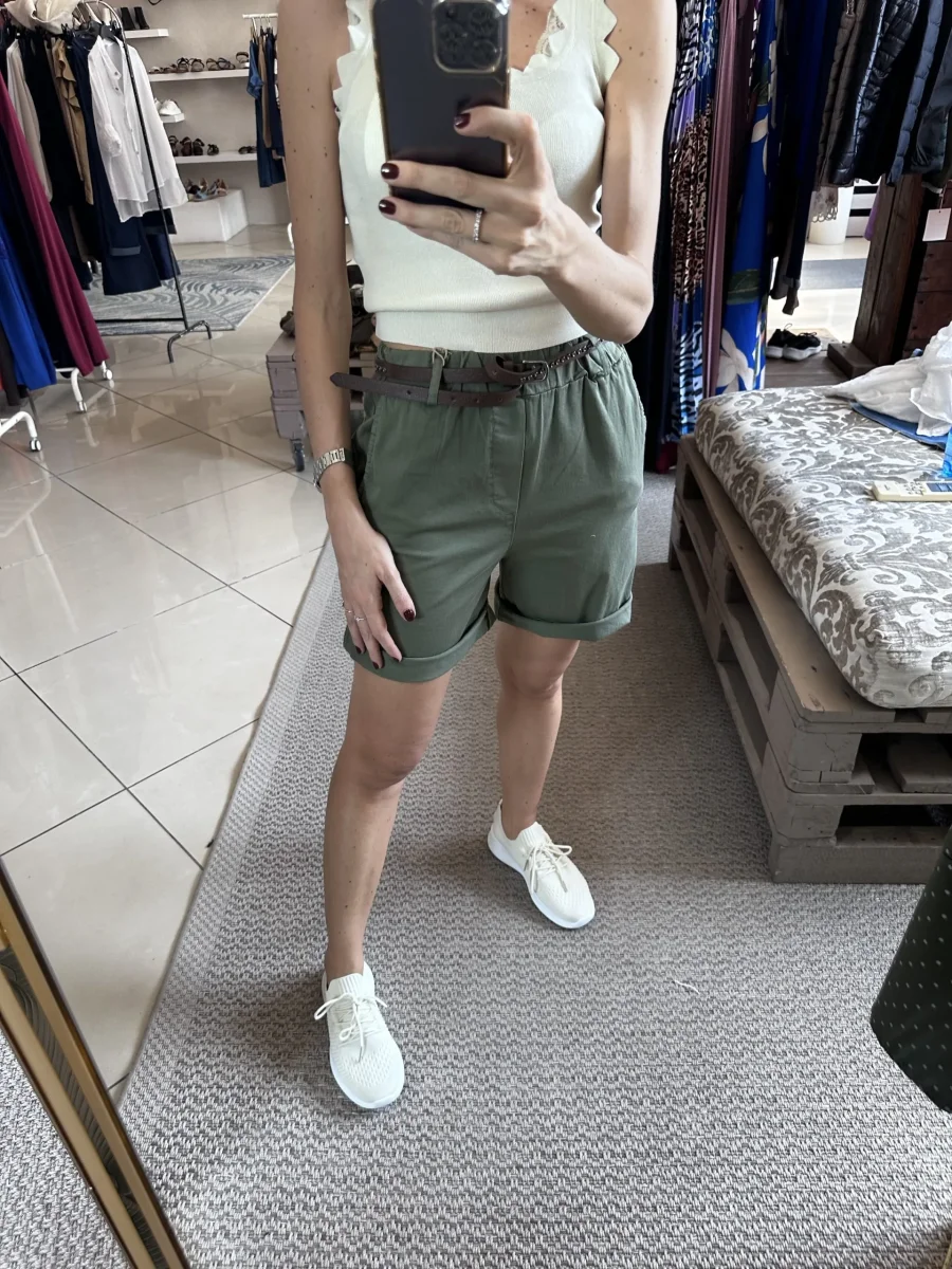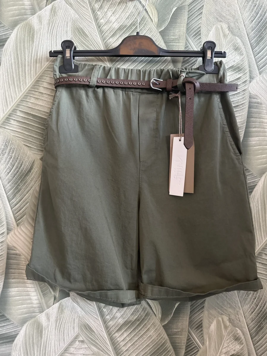 Pantalone bermuda in cotone. Cintura stretta in ecopelle con borchiette. Tasche laterali Composizione: 97% cotone 3% elastano Made in Italy