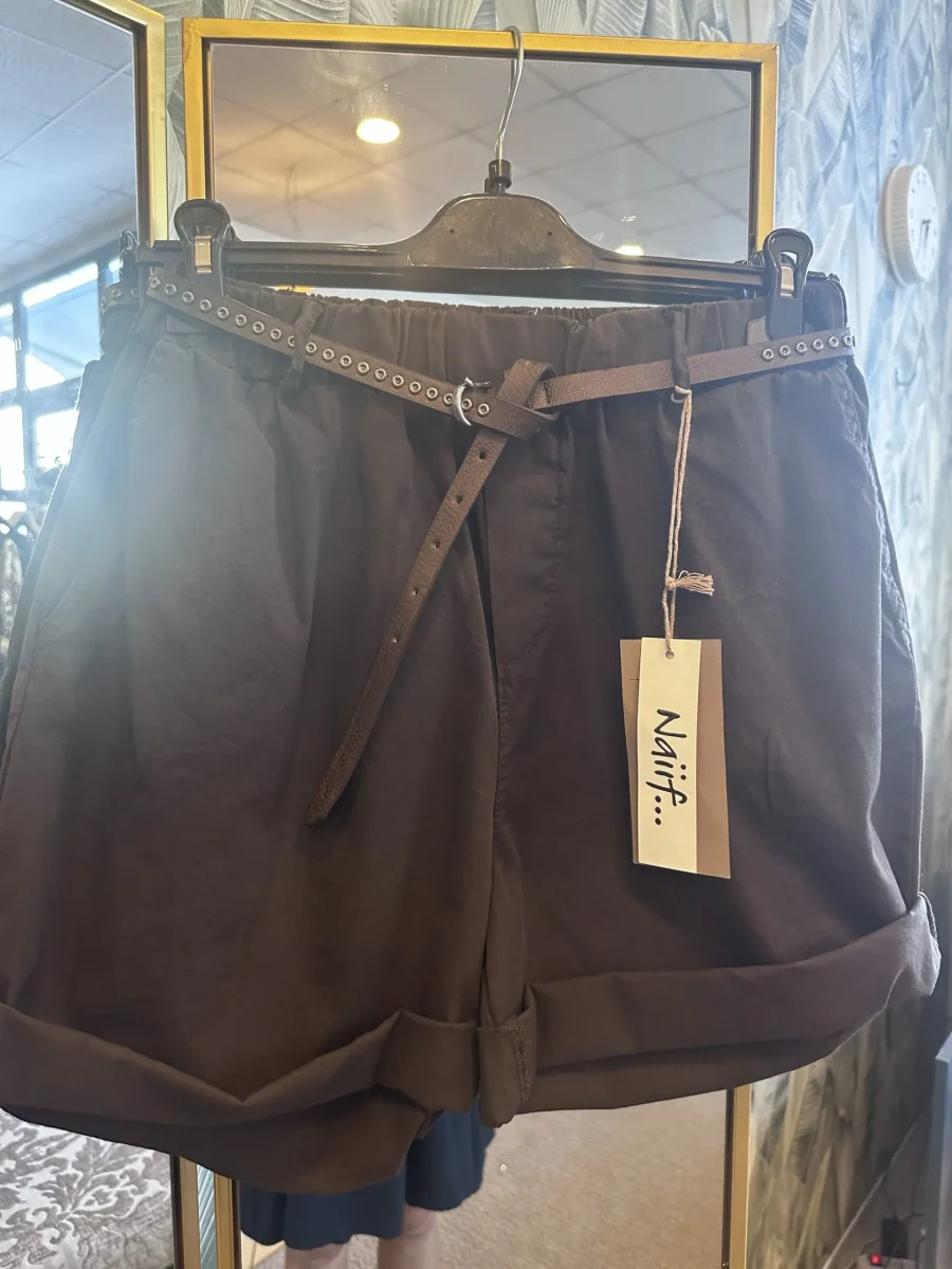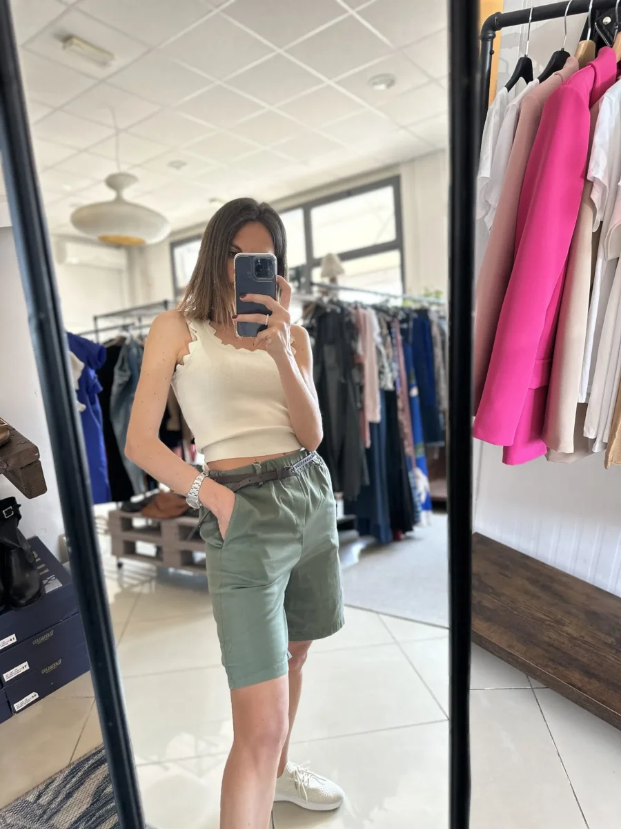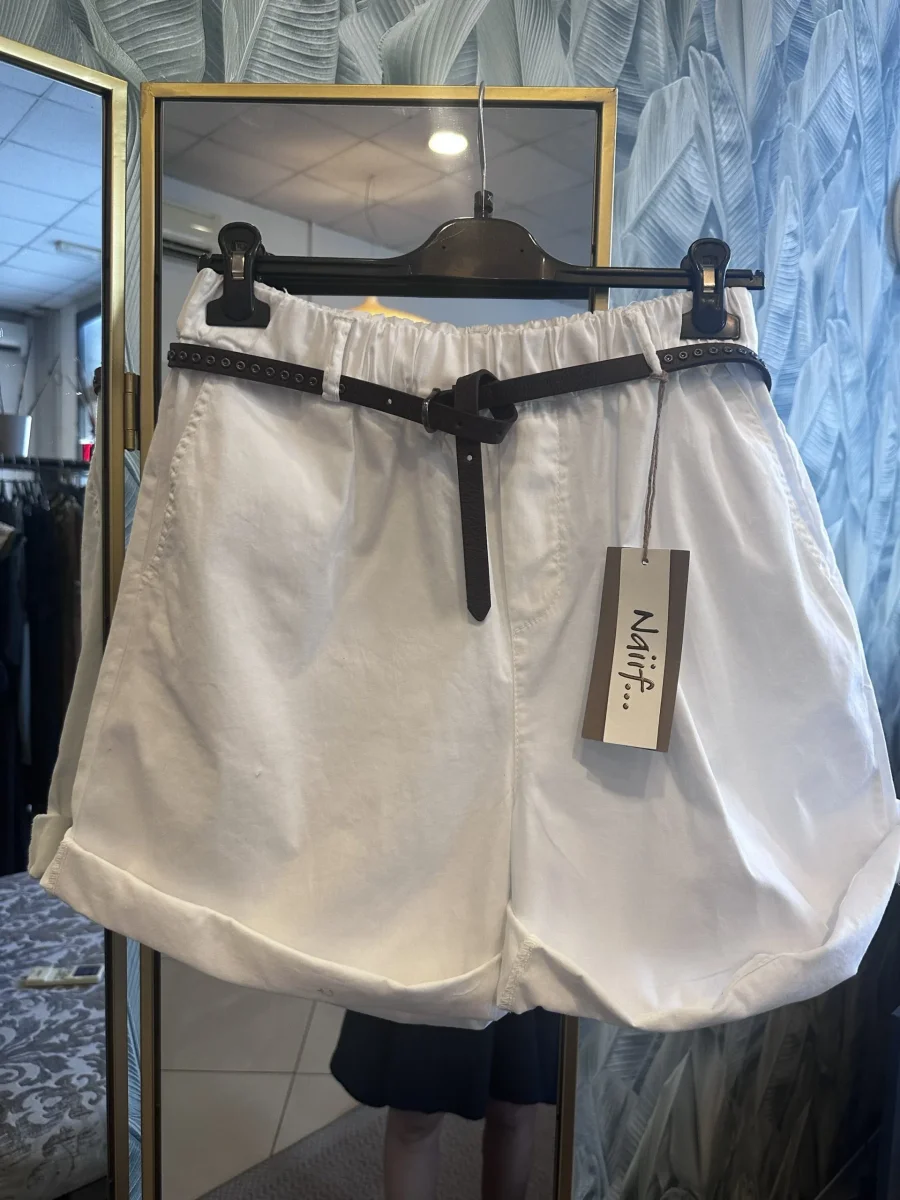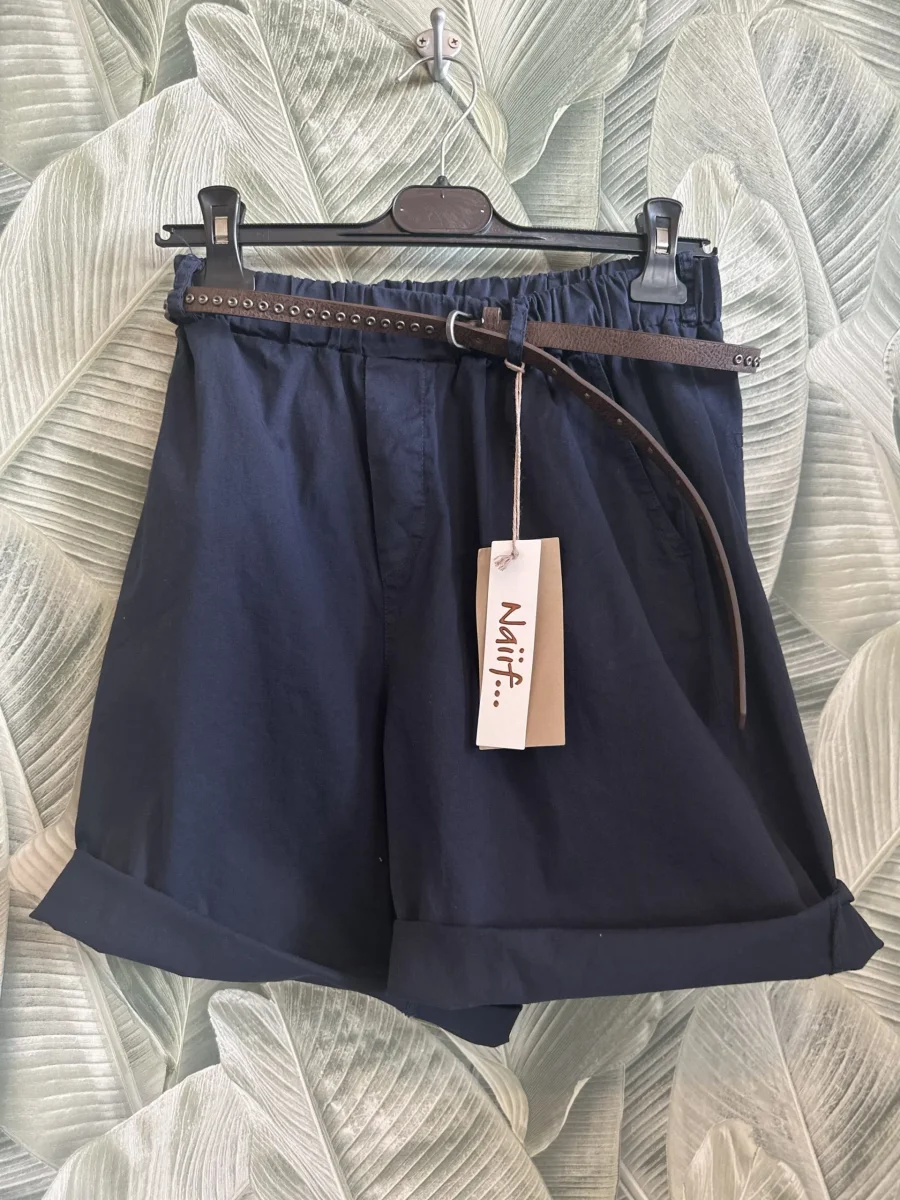 Pantalone bermuda in cotone. Cintura stretta in ecopelle con borchiette. Tasche laterali Composizione: 97% cotone 3% elastano Made in Italy
