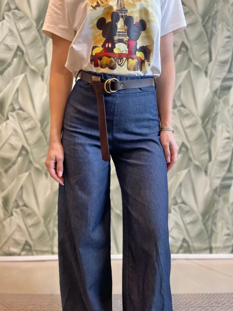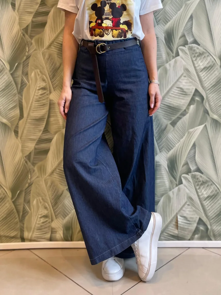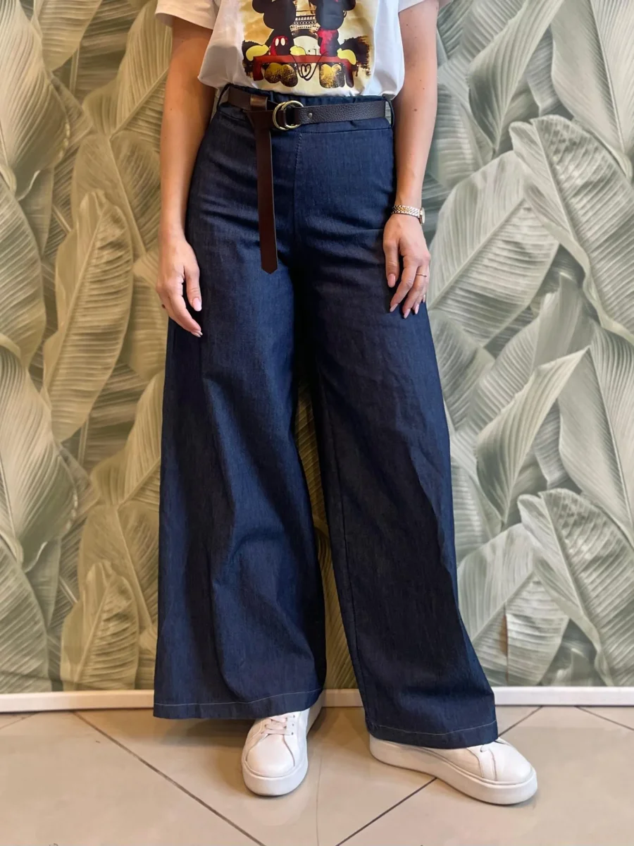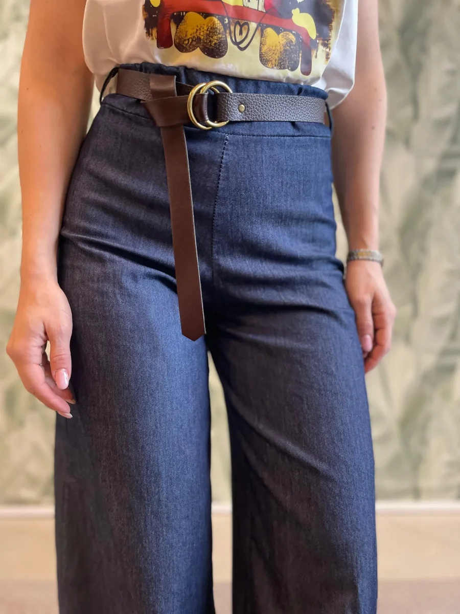 Pantaloni Cotone Effetto Denim GIGLIO Lavaggio scuro, modello a palazzo. Dotato di cintura marrone in ecopelle e fibbia dorata. Composizione: 66% cotone 32% poliestere 2% elastan Taglie S, M e L MADE IN ITALY
