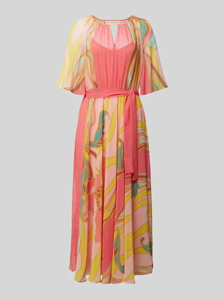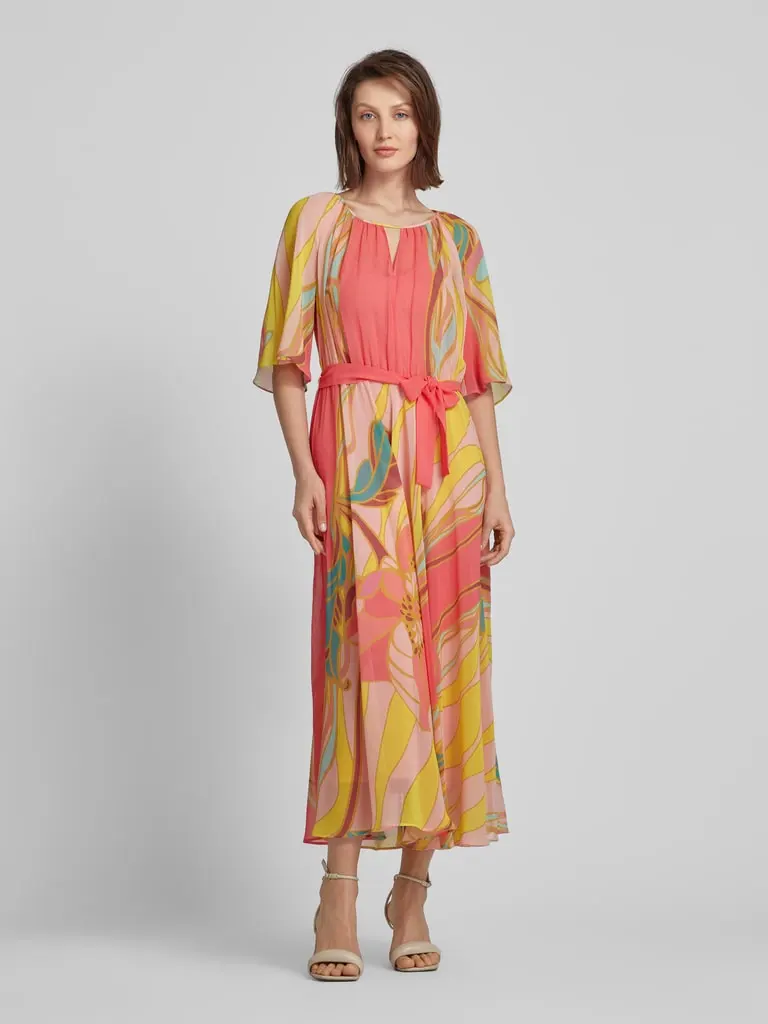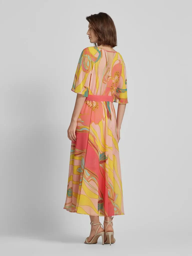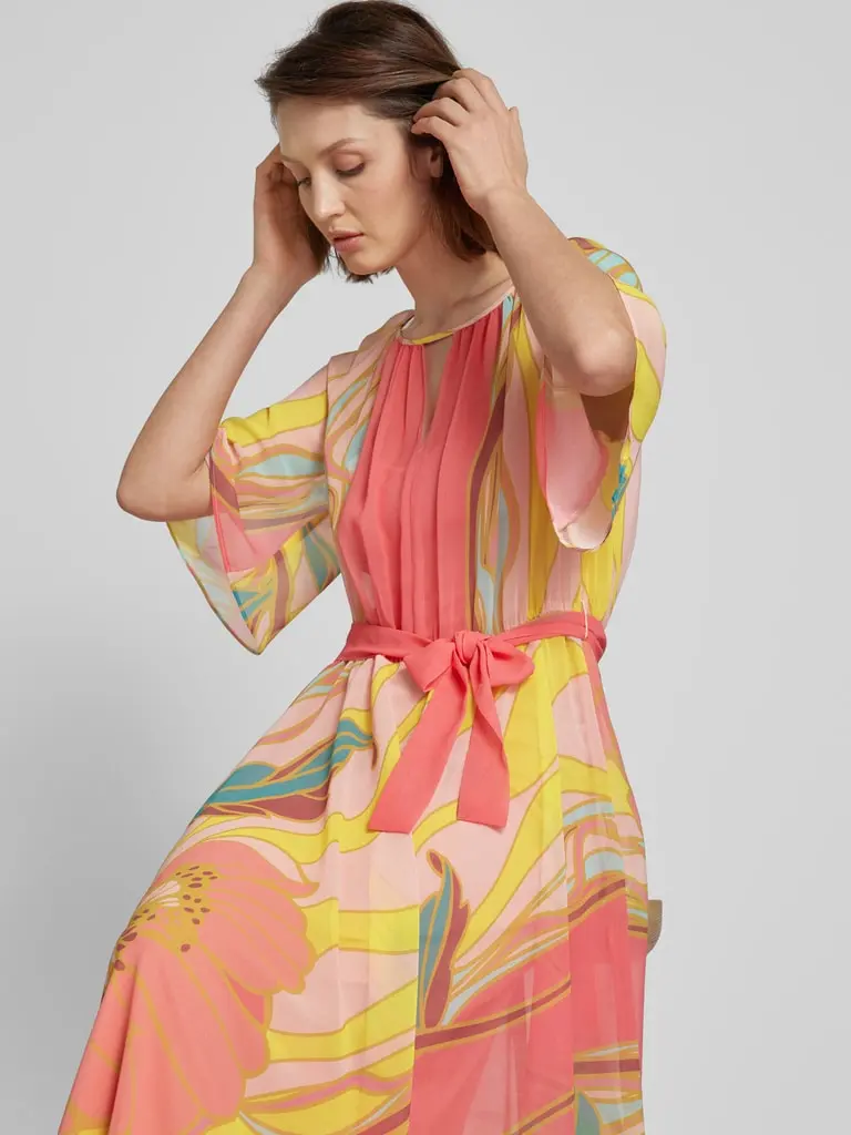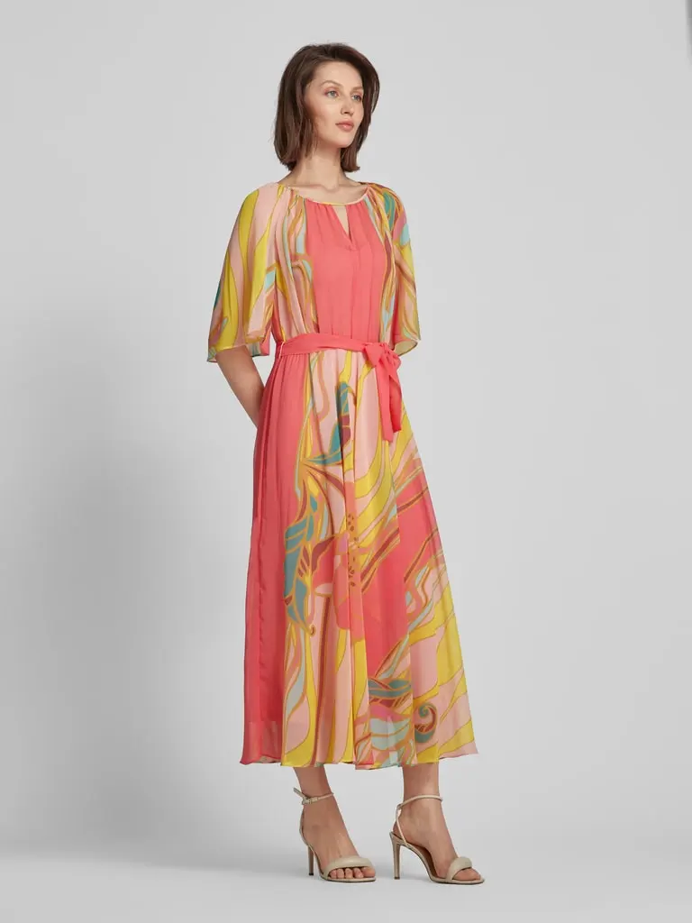 - Etereo l’abito lungo in georgette a fantasia. Ha una silhouette morbida con arricciature, vita delineata con cintura abbinata e gonna a mezza ruota. Scollo tondo con aperture a V, maniche raglan di linea svasata. Zip invisibile, sottoveste in jersey.