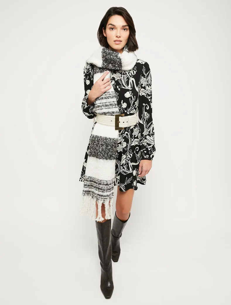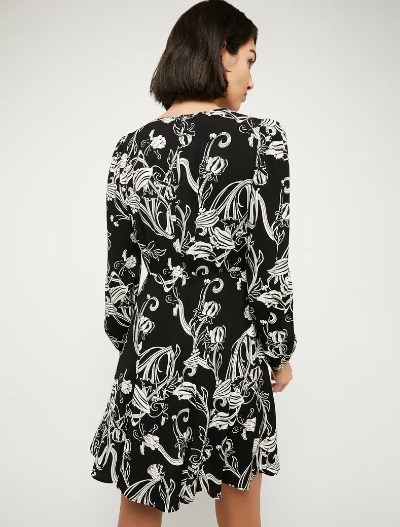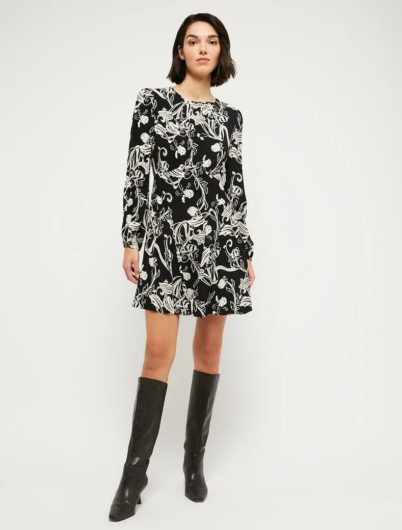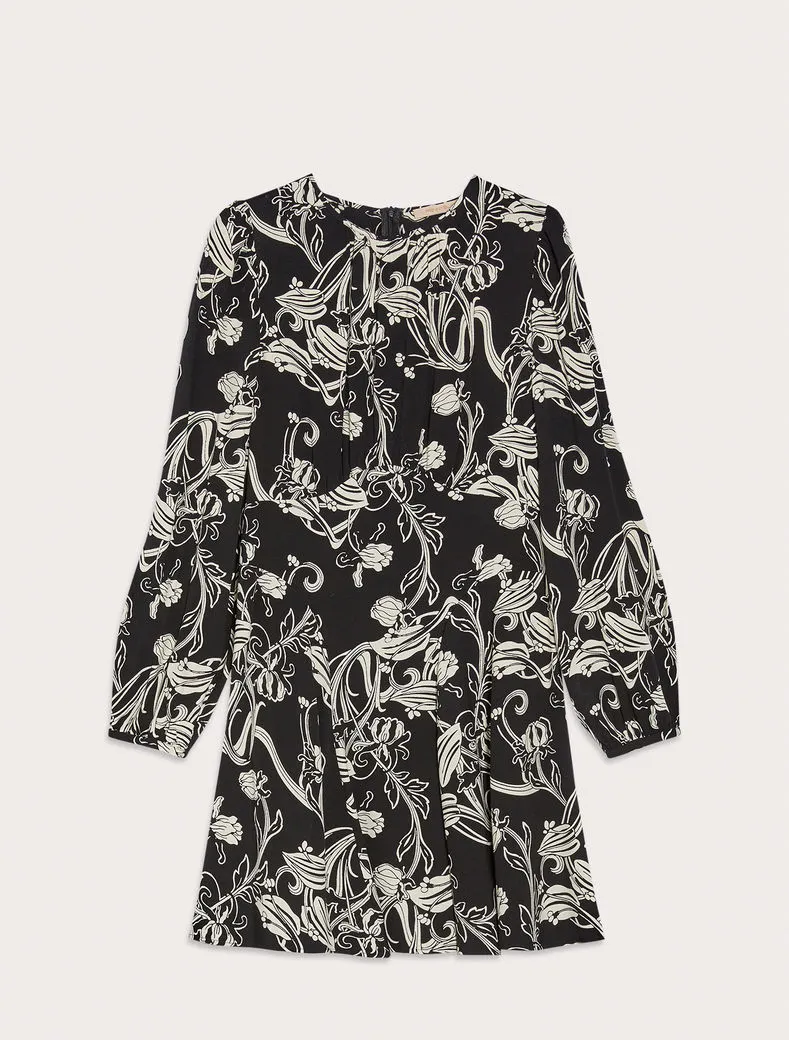- Motivi floreali stile Art Nouveau sull’abito in crêpe sablé. Top mosso da leggere arricciature, design con pannelli a intarsio che sfiorano la silhouette e creano volumi ondulati al fondo. Zip invisibile, sfoderato.
