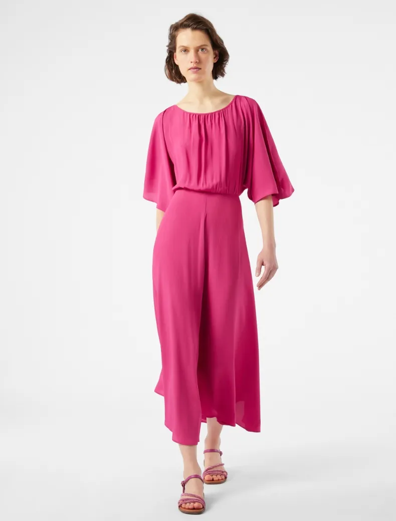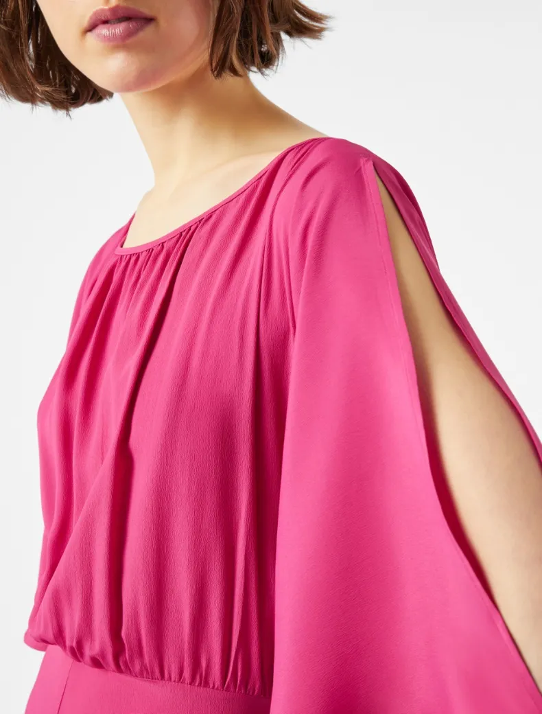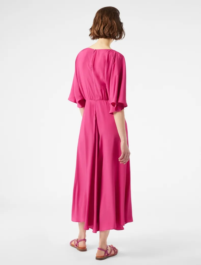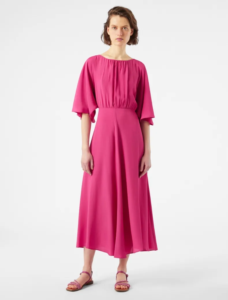 - Abito lungo in blend di seta crêpe de Chine. Ha un taglio morbido con arricciature, la vita delineata da un inserto elastico e la gonna a mezza ruota. Scollo a barchetta e ampie maniche a kimono con dettaglio cut-out. Sfoderato.