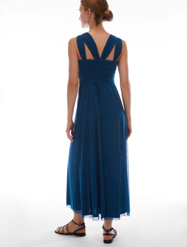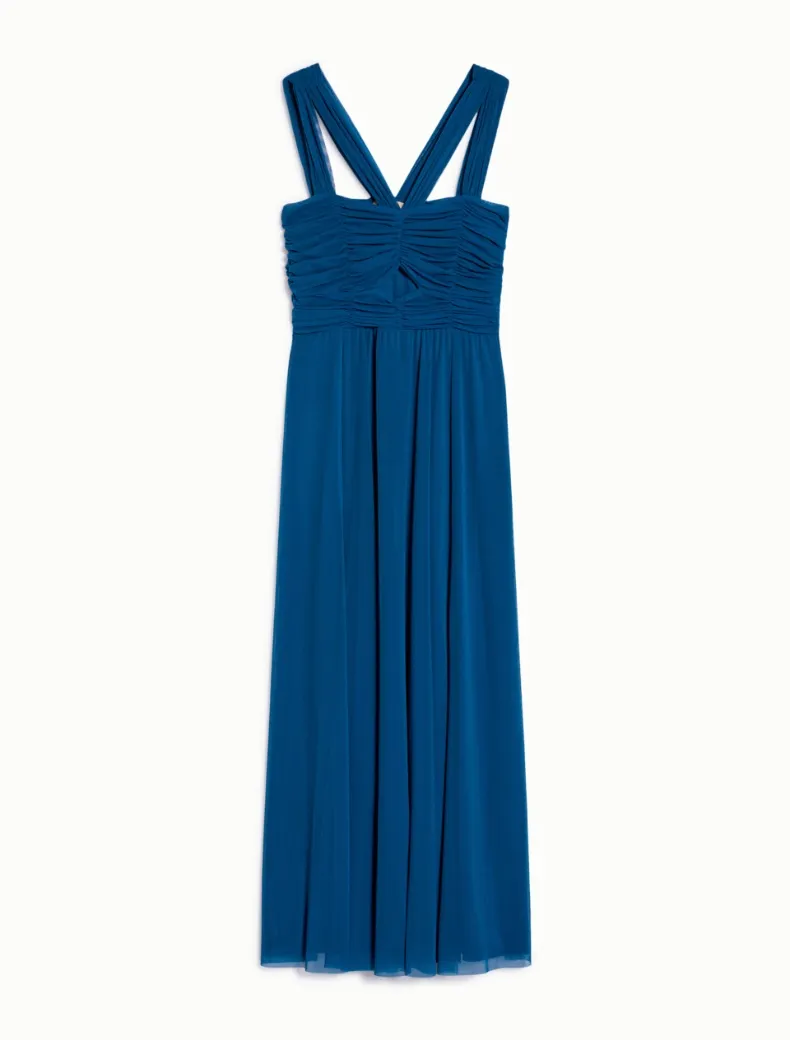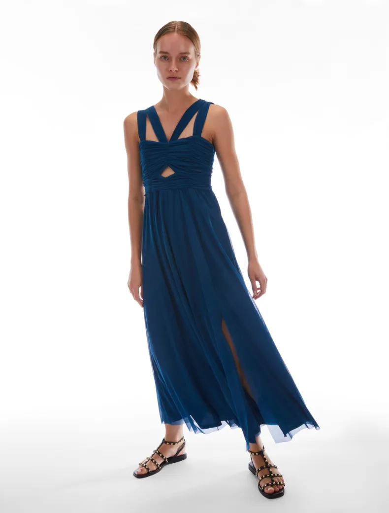 - Party dress in jersey tulle. Doppie spalline con motivo a V, top aderente e drappeggiato con dettaglio cut-out sul davanti. Vita delineata, gonna arricciata dalle linee svasate con spacco sul davanti. Zip invisibile, fodera in jersey.