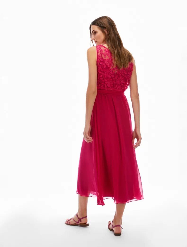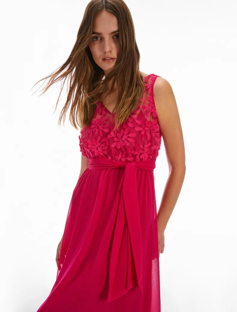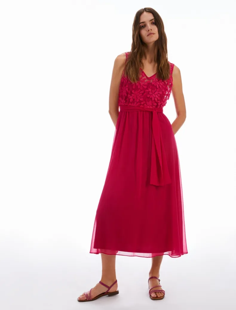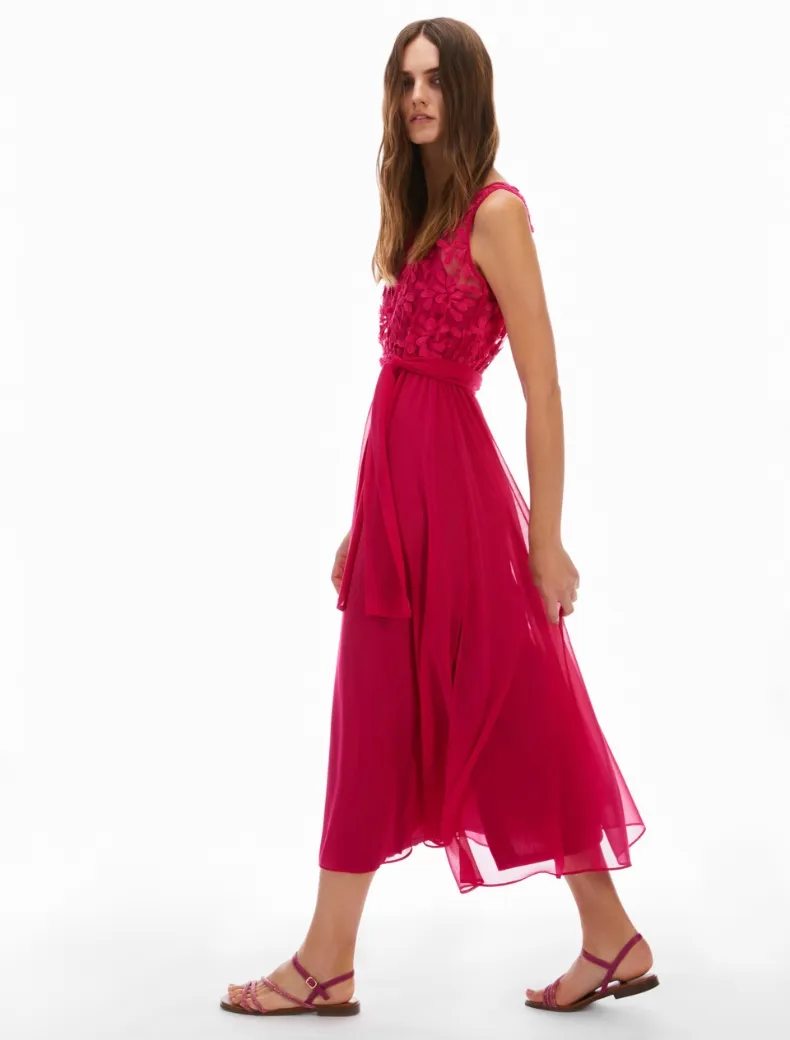 - Party dress con top in tulle a ricamo floreale tridimensionale e gonna svasata in georgette. Ampio scollo a V sul davanti e sulla schiena, vita delineata con inserto elastico e fusciacca abbinata. Completo di sottoveste in jersey.