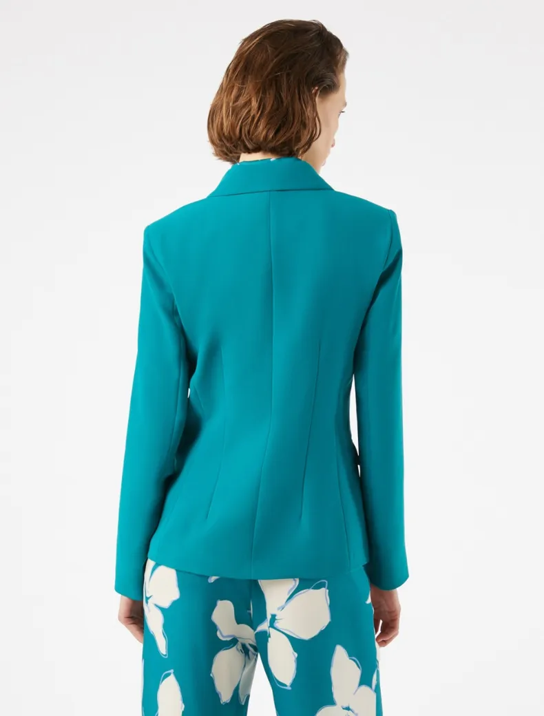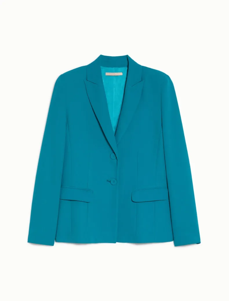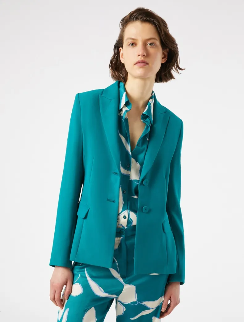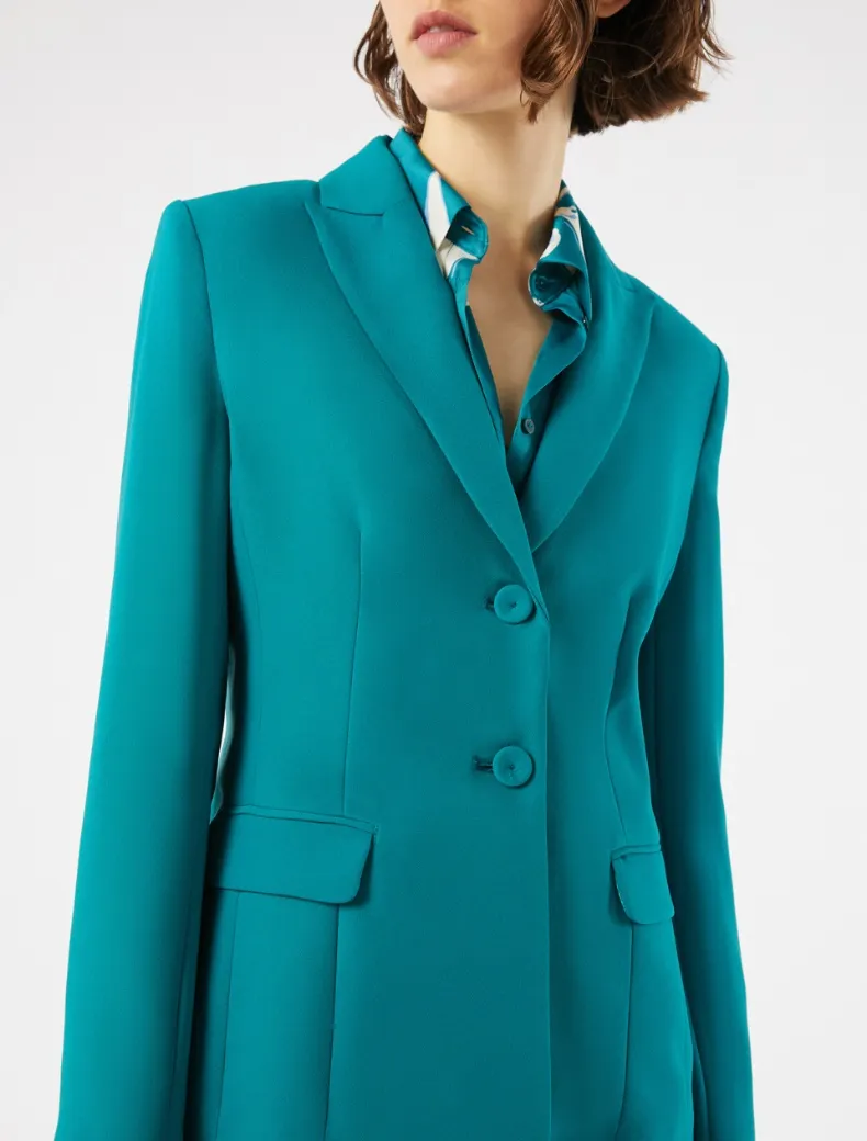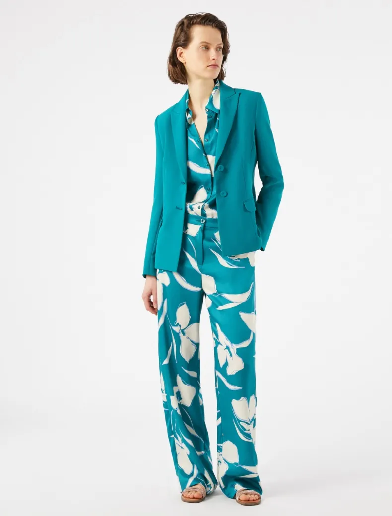 - Blazer sartoriale in envers satin opaco. Monopetto a due bottoni, con revers a lancia, valorizza la silhouette con un taglio slim. Tasche a pattina sul davanti, foderato. Party suit a tutto colore con i pantaloni coordinati.