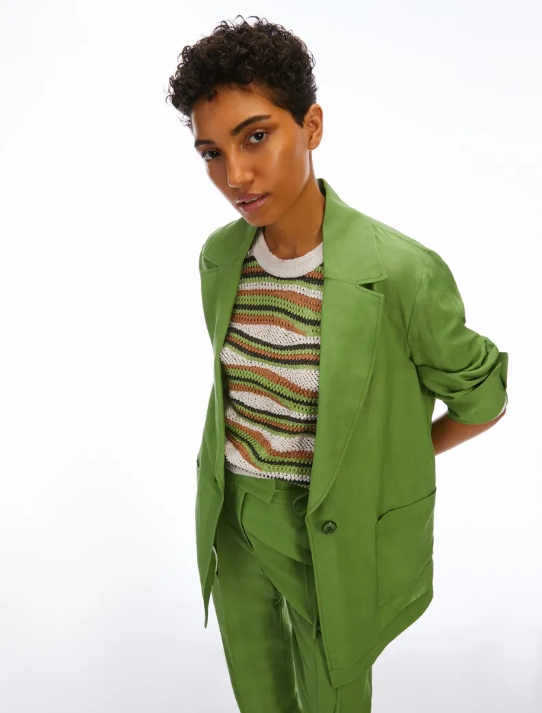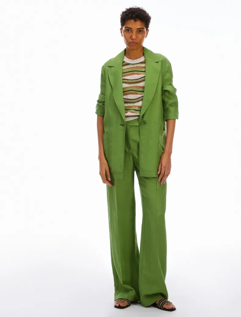 - Blazer destrutturato in tela fiammata di lino e viscosa. Monopetto a un bottone, ha linee diritte, morbide e allungate. Revers ampi, tasche applicate sul davanti e spacchetti ai polsi. Con i pantaloni coordinati si crea un freschissimo suit estivo.