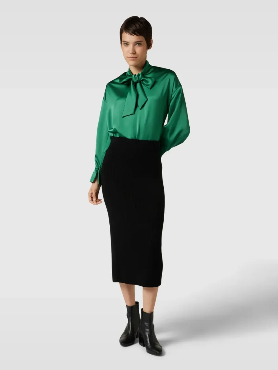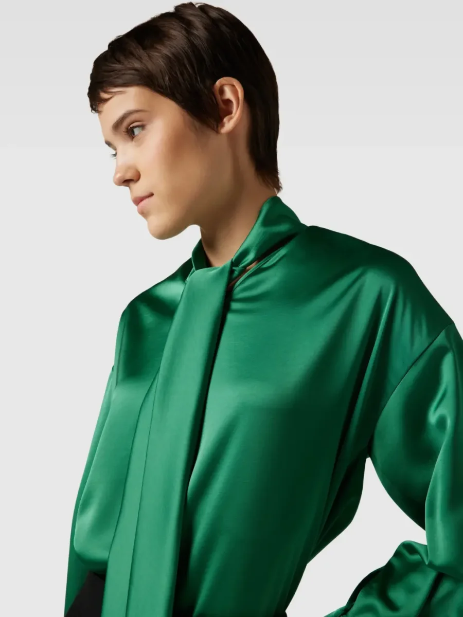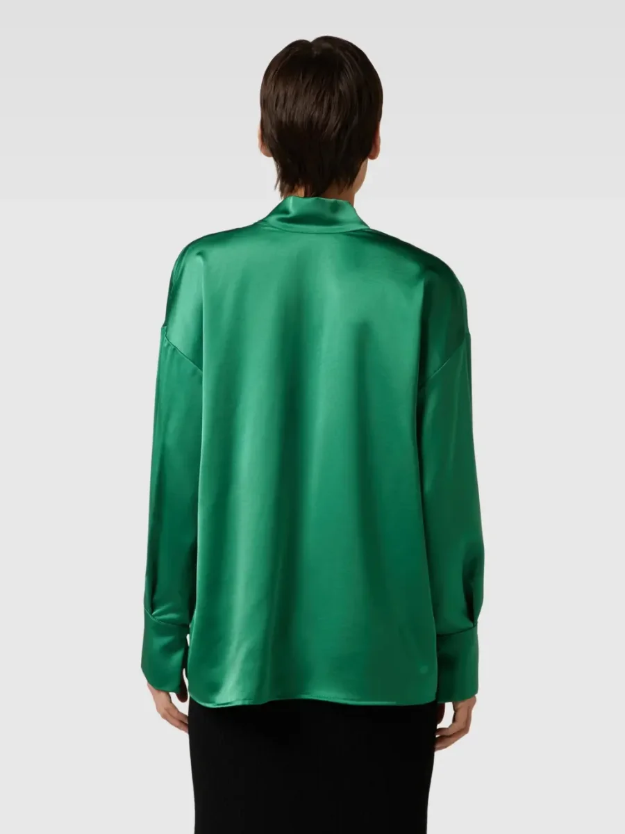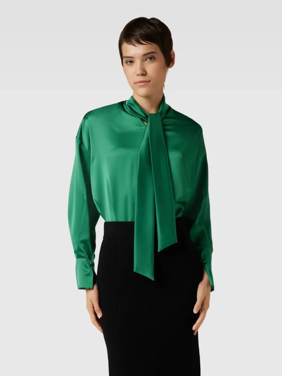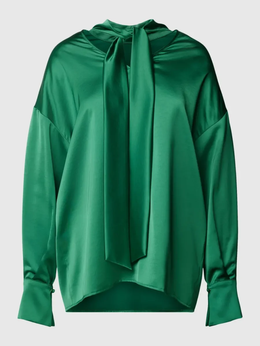 - Versatile la blusa in raso, con lo scollo a V da indossare sul davanti o sulla schiena. Collo a foulard da annodare, linee ampie e diritte con spalle scese, maniche lunghe con pieghe al fondo e polsini alti. Per accendere il look.