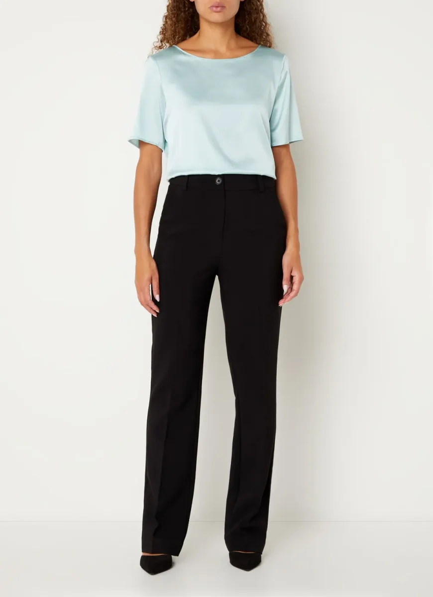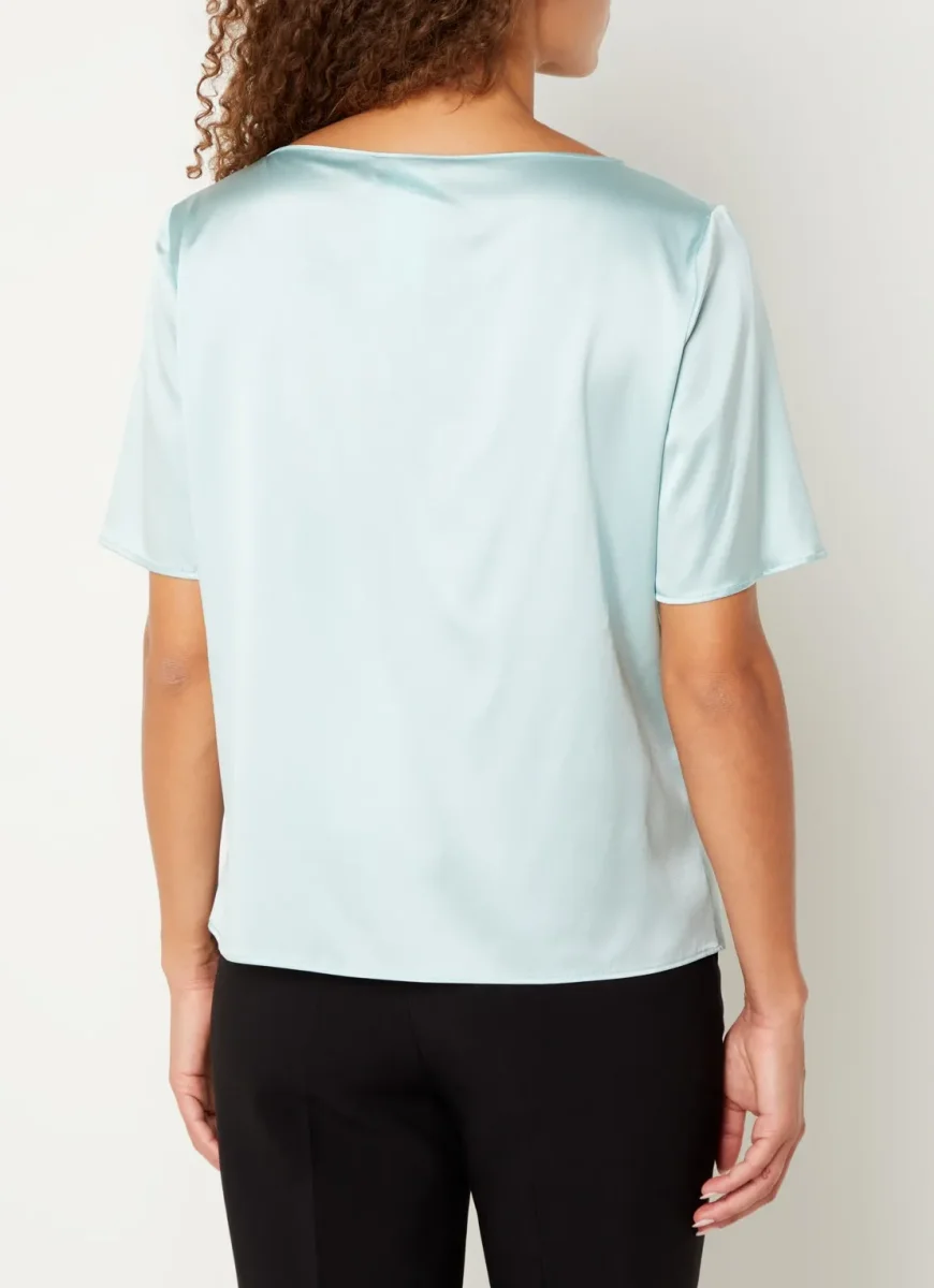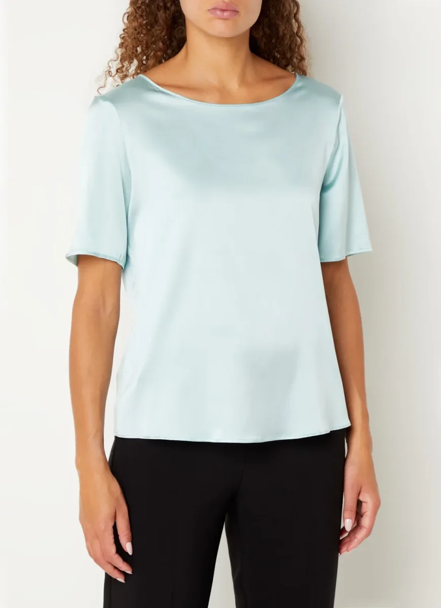 - Blusa taglio T-shirt in raso di seta stretch. Scollo a barchetta arrotondato e maniche corte, ha una vestibilità regolare con linee diritte. Tanto semplice quanto versatile, sarà perfetta con il party look, il tailleur per l’ufficio e i jeans.