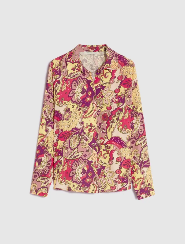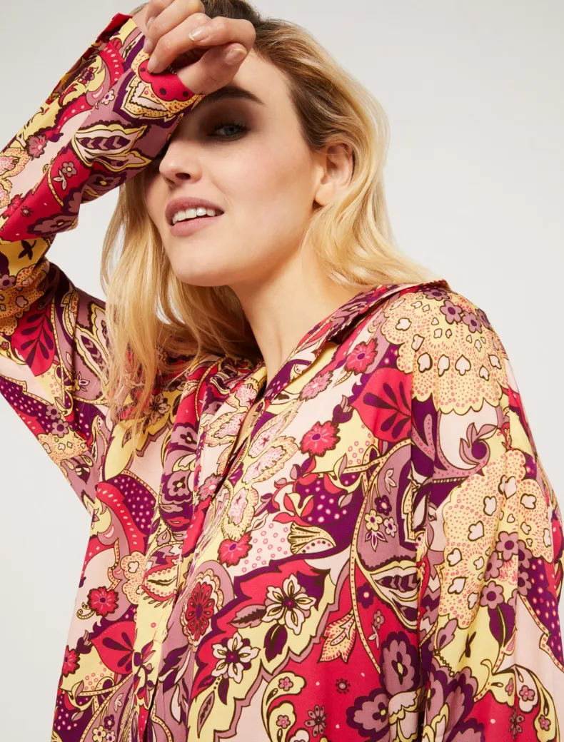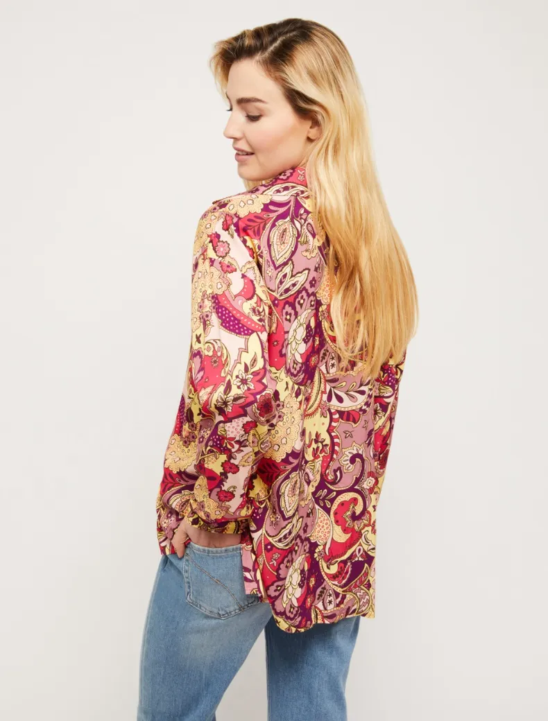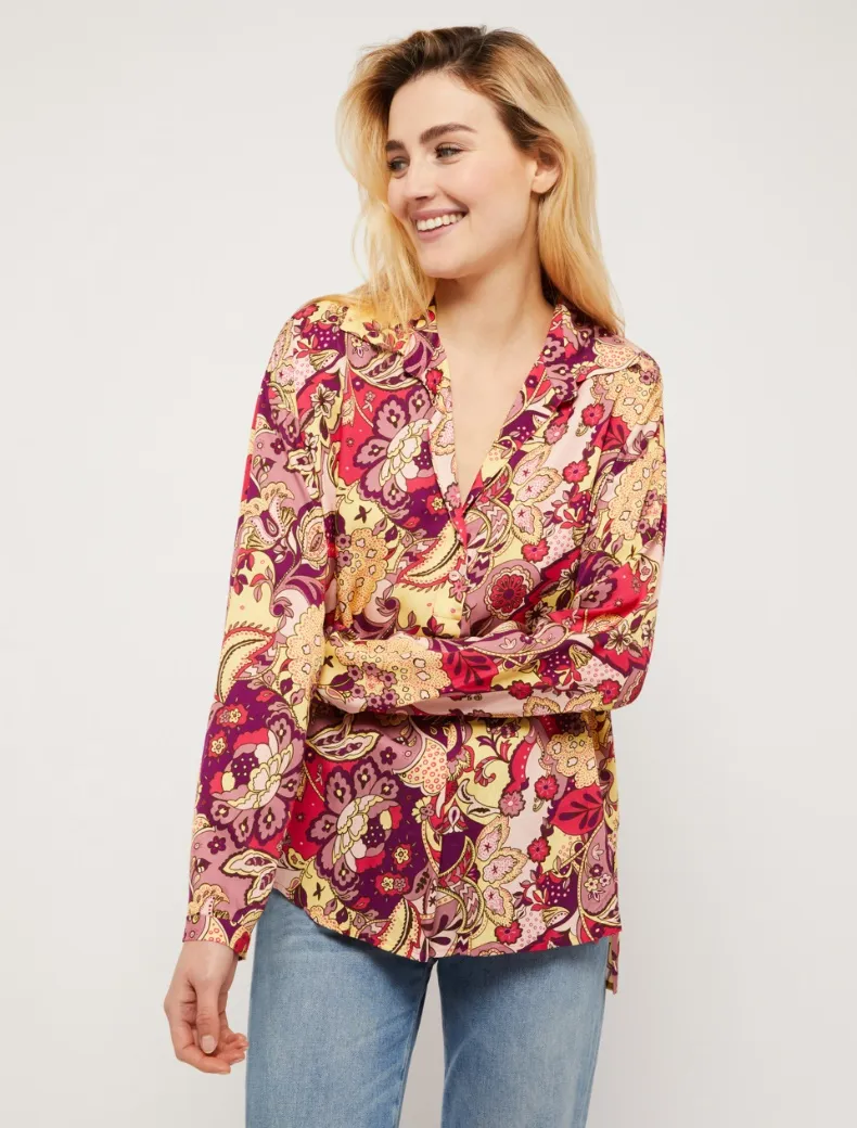 - Fantasia paisley floreale per la blusa in twill fluido. Taglio diritto e morbido, colletto a camicia, scollo a V chiuso da due bottoncini, motivo di piega centrale sul davanti. Polsini sottili e spacchetti al fondo.