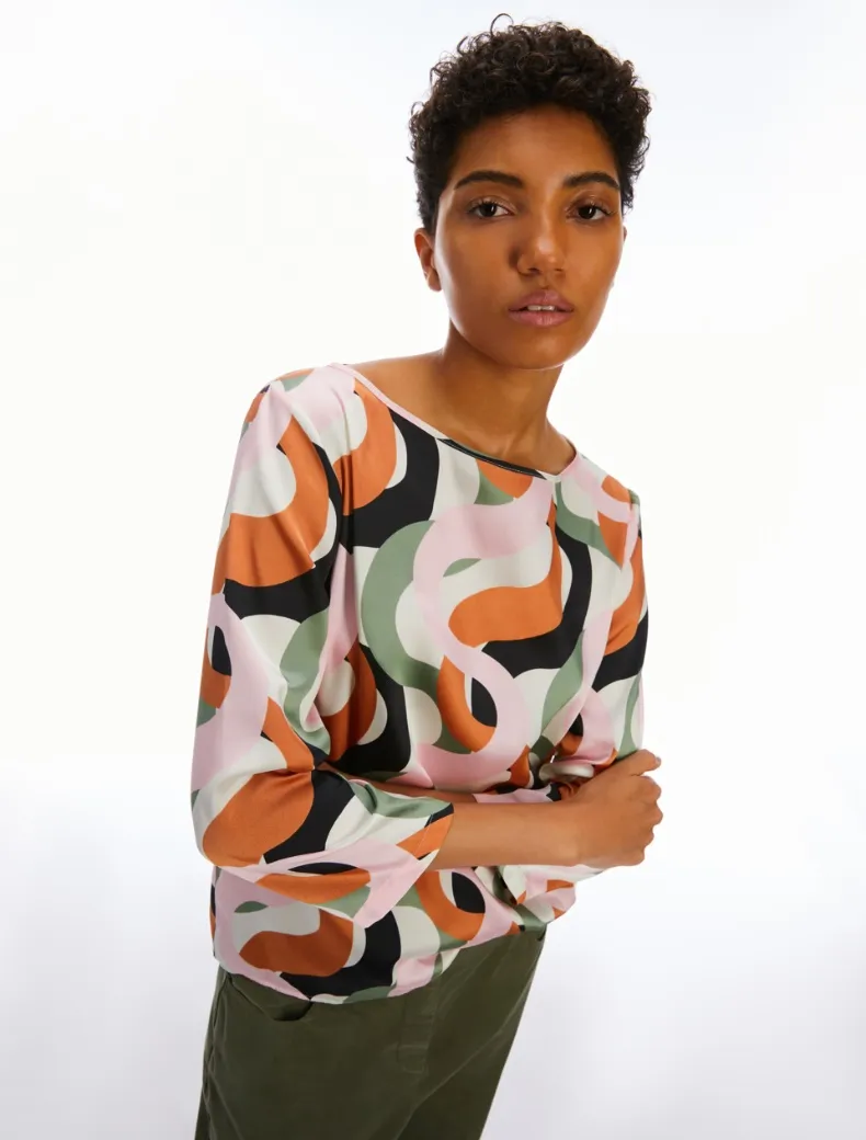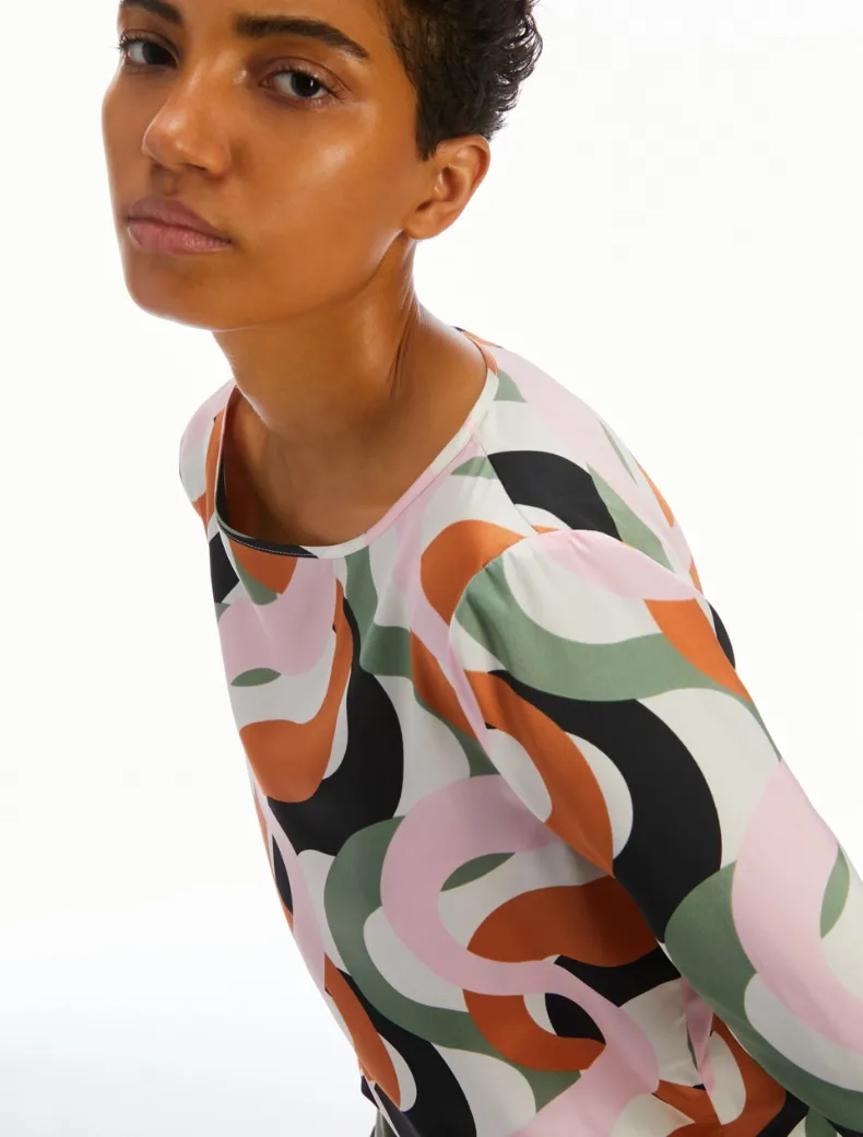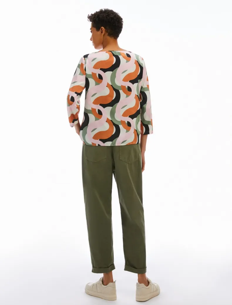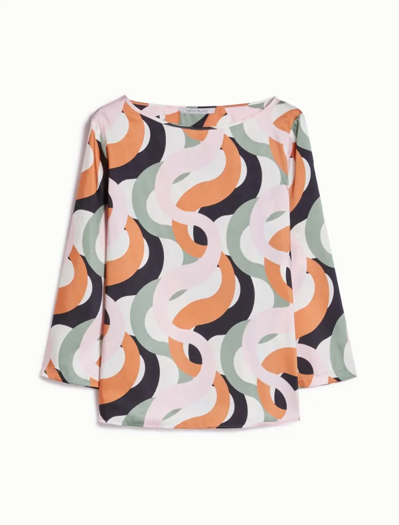 - Blusa in twill fluido dal taglio diritto e morbido, con scollo a barchetta e maniche trequarti. Il design pulito lascia il ruolo di protagonista alla fantasia a onde grafiche, che saprà rivitalizzare ogni look.