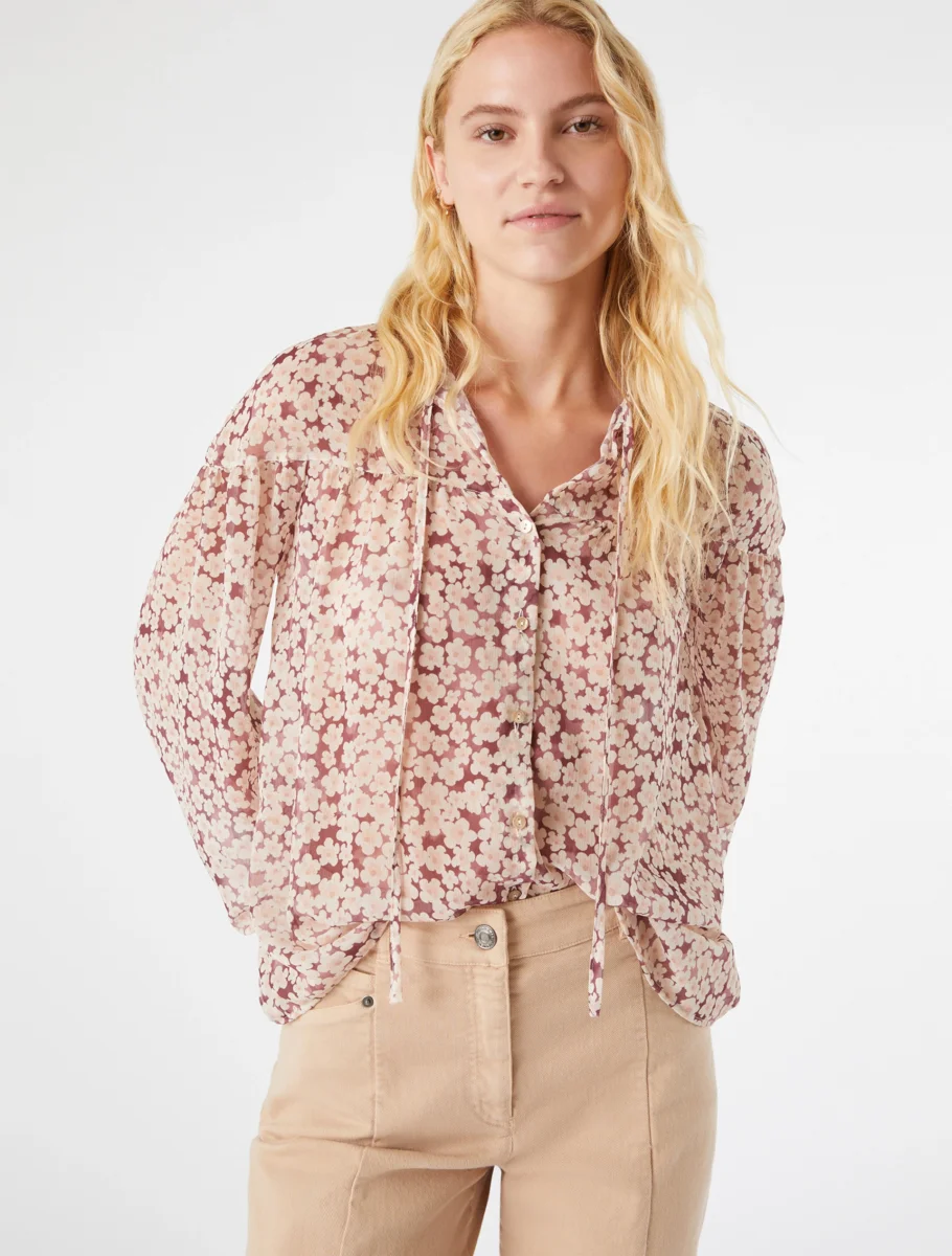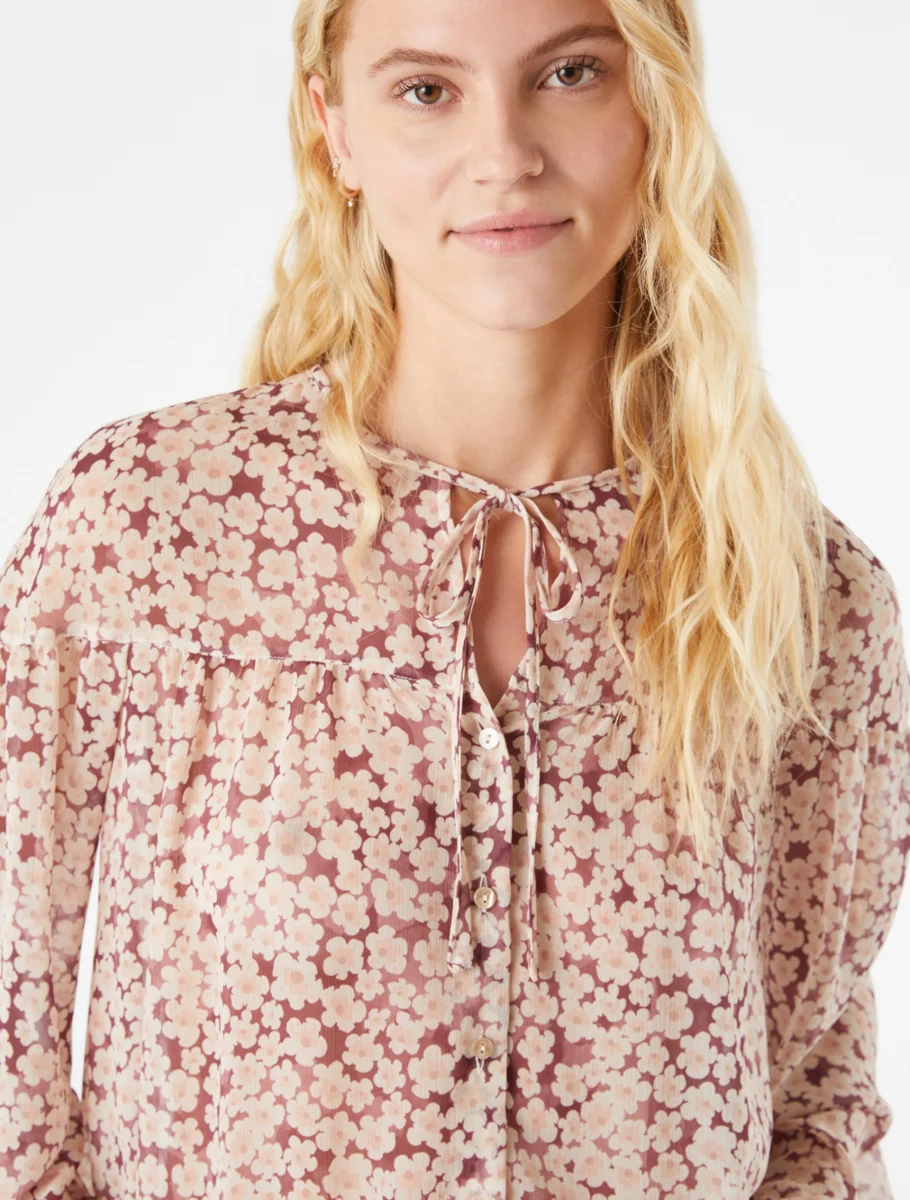 - Camicia in crépon a fantasia floreale. Taglio carré su spalle e maniche, ha volumi ampi e leggeri, mossi da arricciature. Girocollo con laccetti da annodare sul davanti e polsi sottili. Delicata, sarà perfetta con pantaloni dal carattere grintoso. Tessuto principale contenente poliestere rigenerato o poliammide rigenerato, fibra proveniente dal riciclo di materiale plastico.