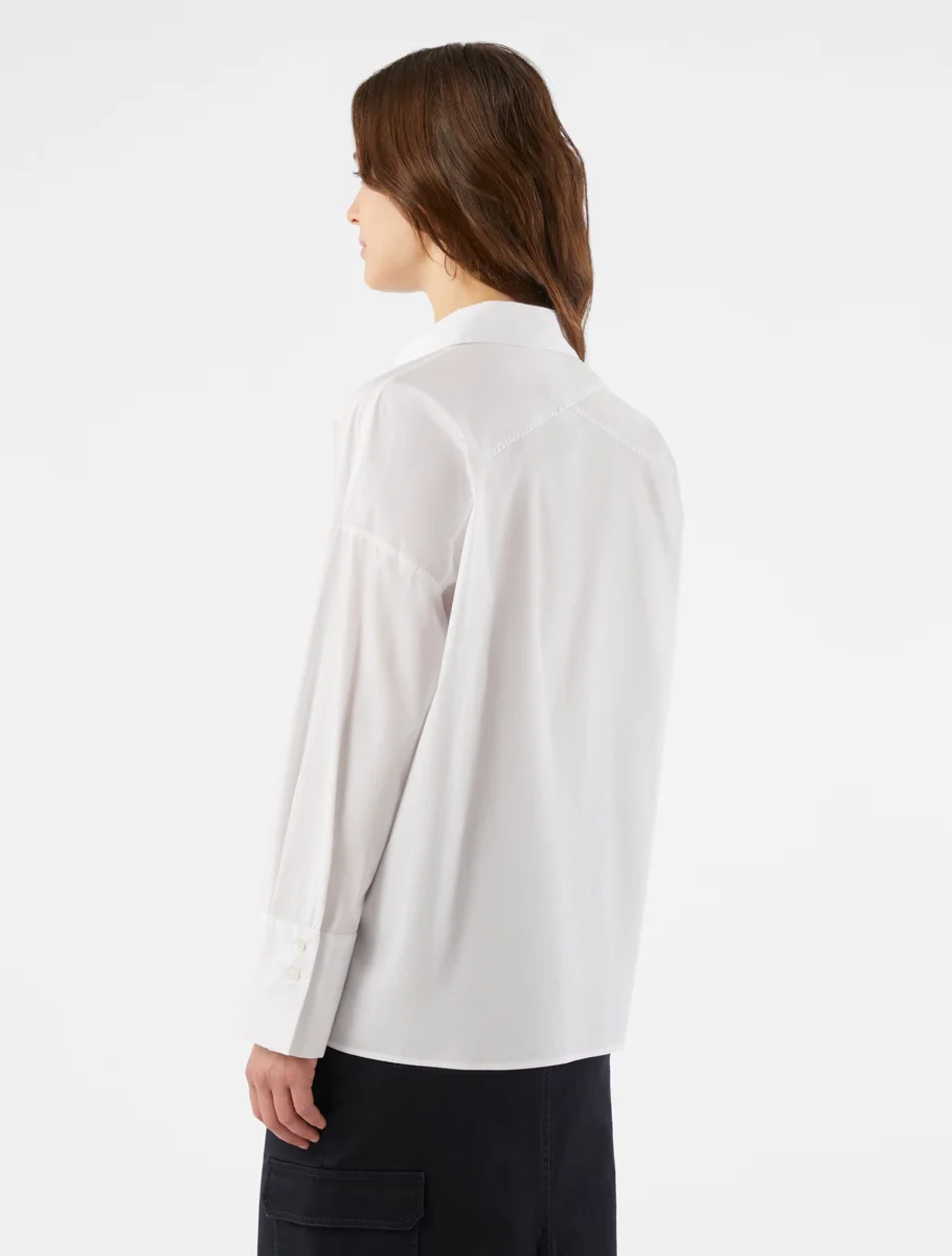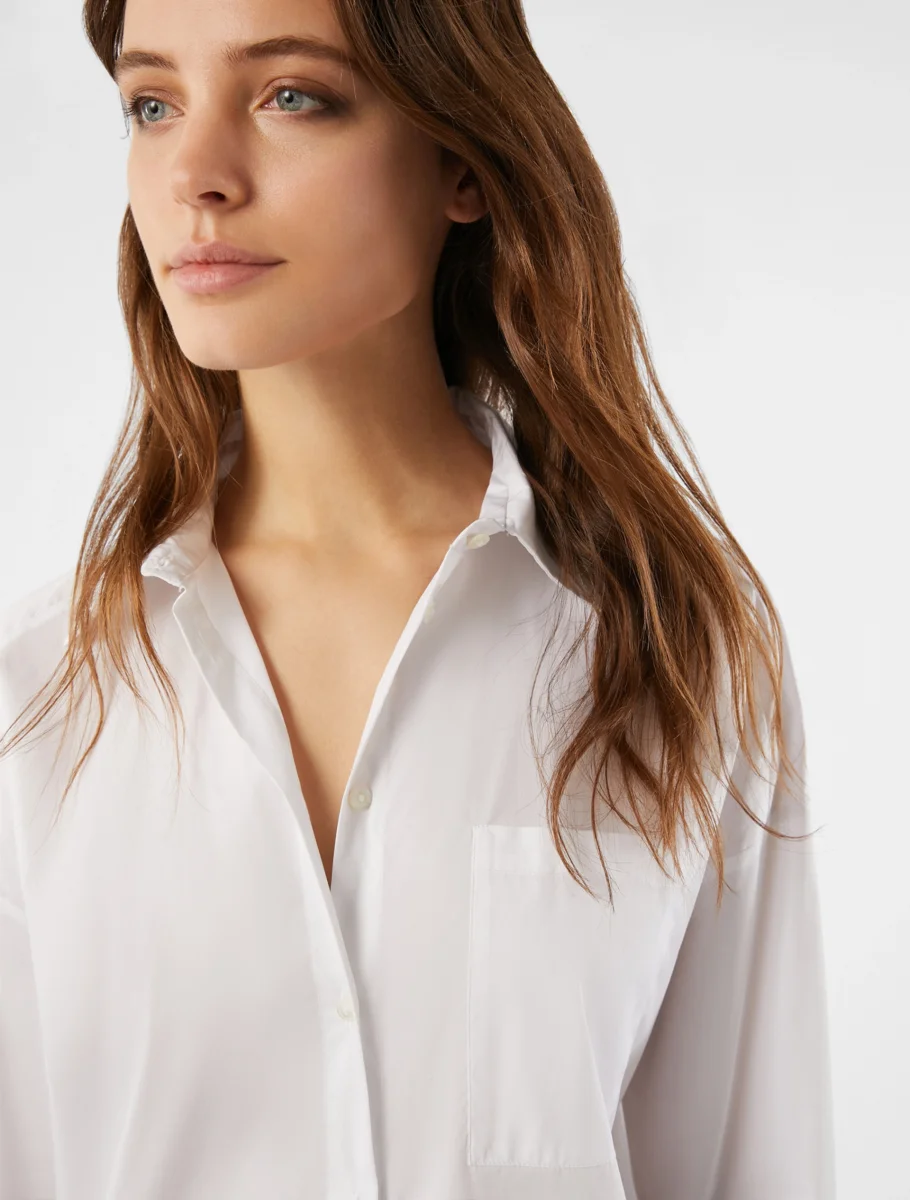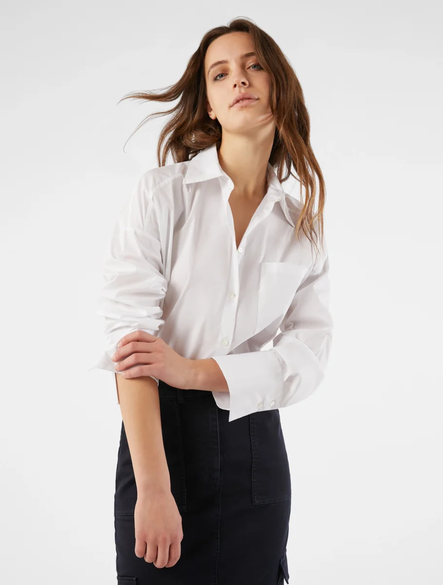 - Camicia in popeline stretch. Oversize, ha linee diritte e allungate. Taschino sul davanti, carré con motivo di tagli diagonali sul retro, polsini alti e spacchi laterali al fondo. In tinta unita o a righe che creano un disegno geometrico sul colletto.