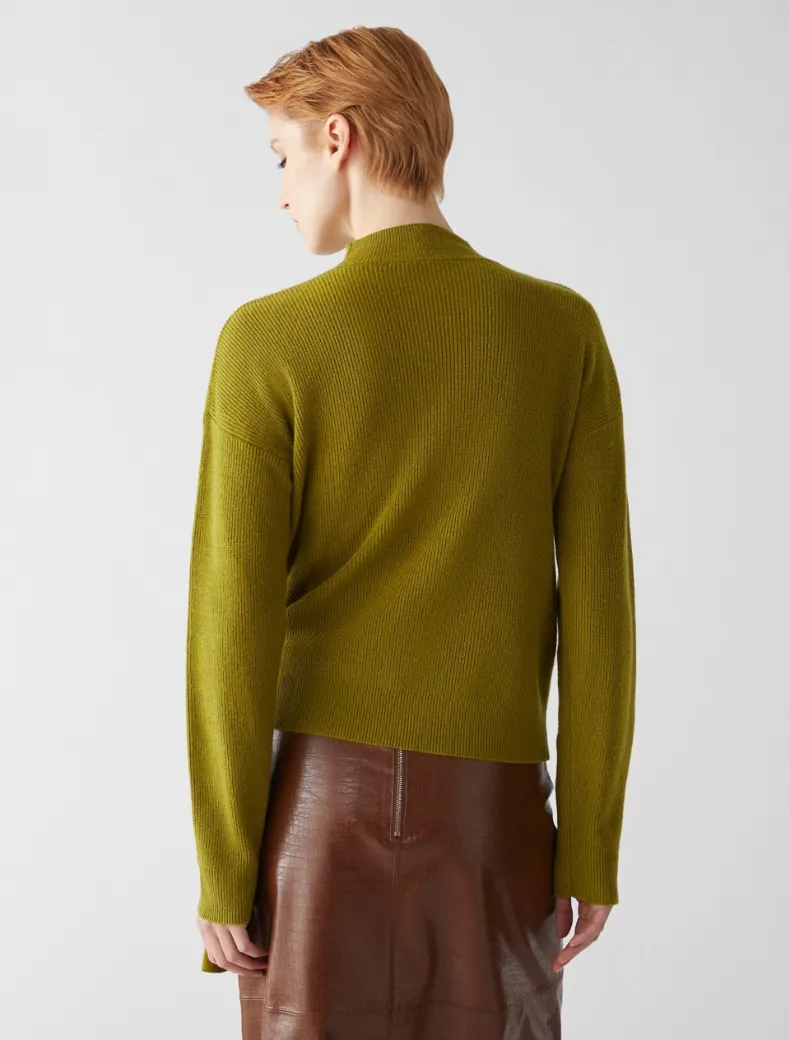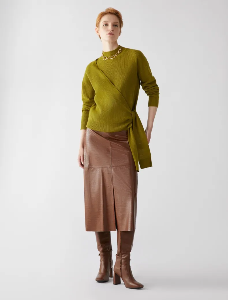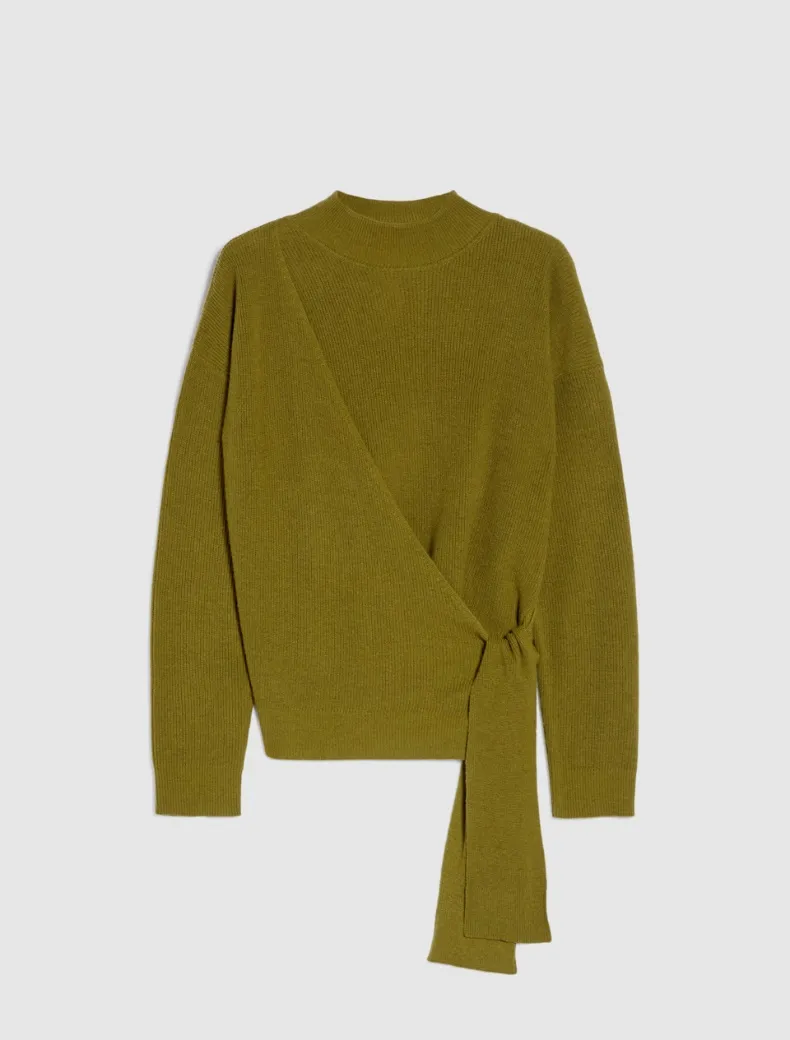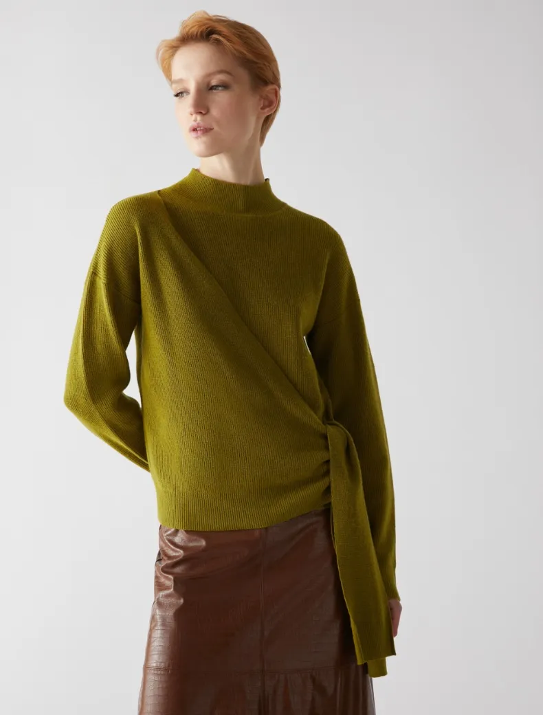 - Maglia dal design incrociato con pannello sovrapposto sul davanti e lacci da annodare al fianco. Collo a lupetto e spalle scese, è lavorata a punto pannocchia. Morbida e avvolgente, per dare un twist ai look invernali.