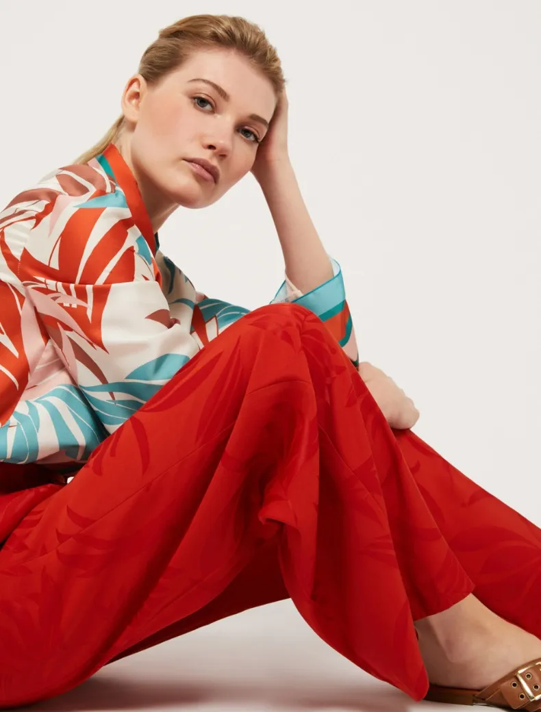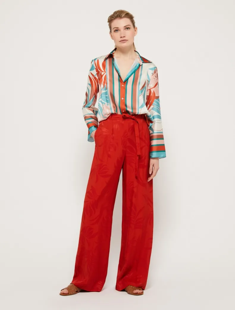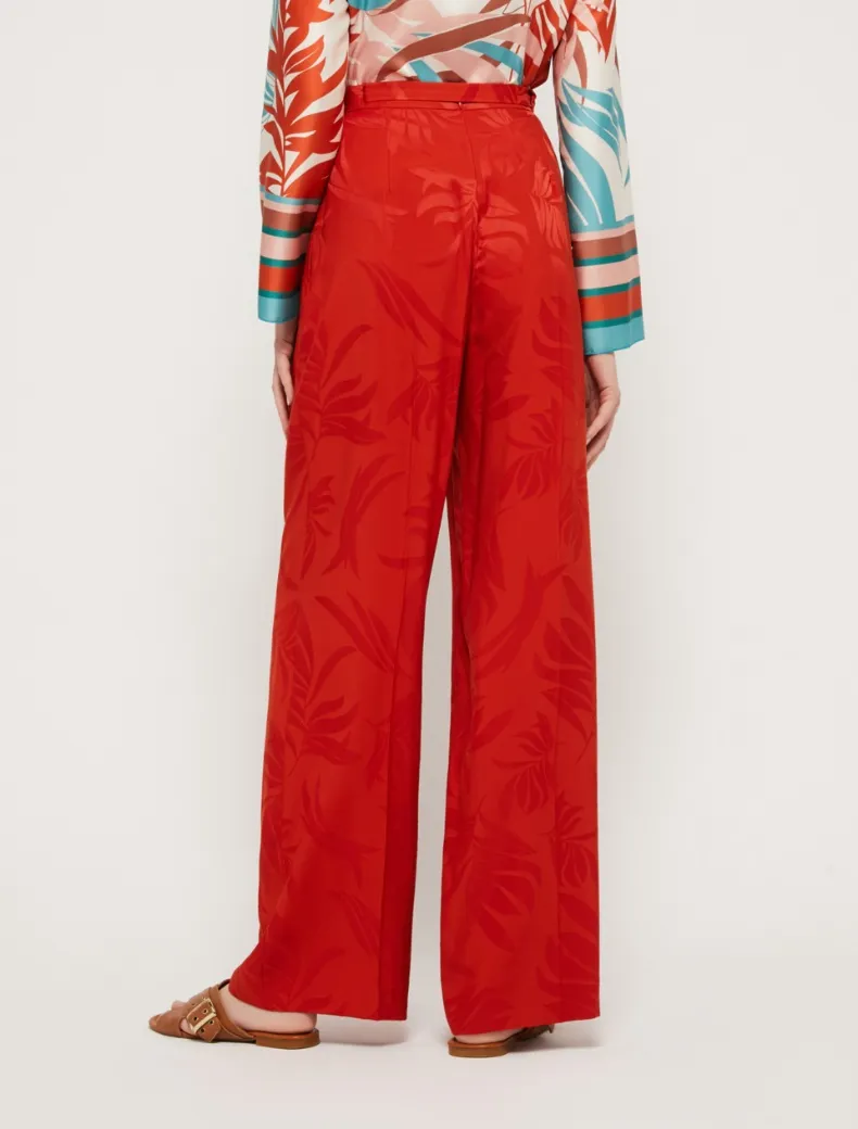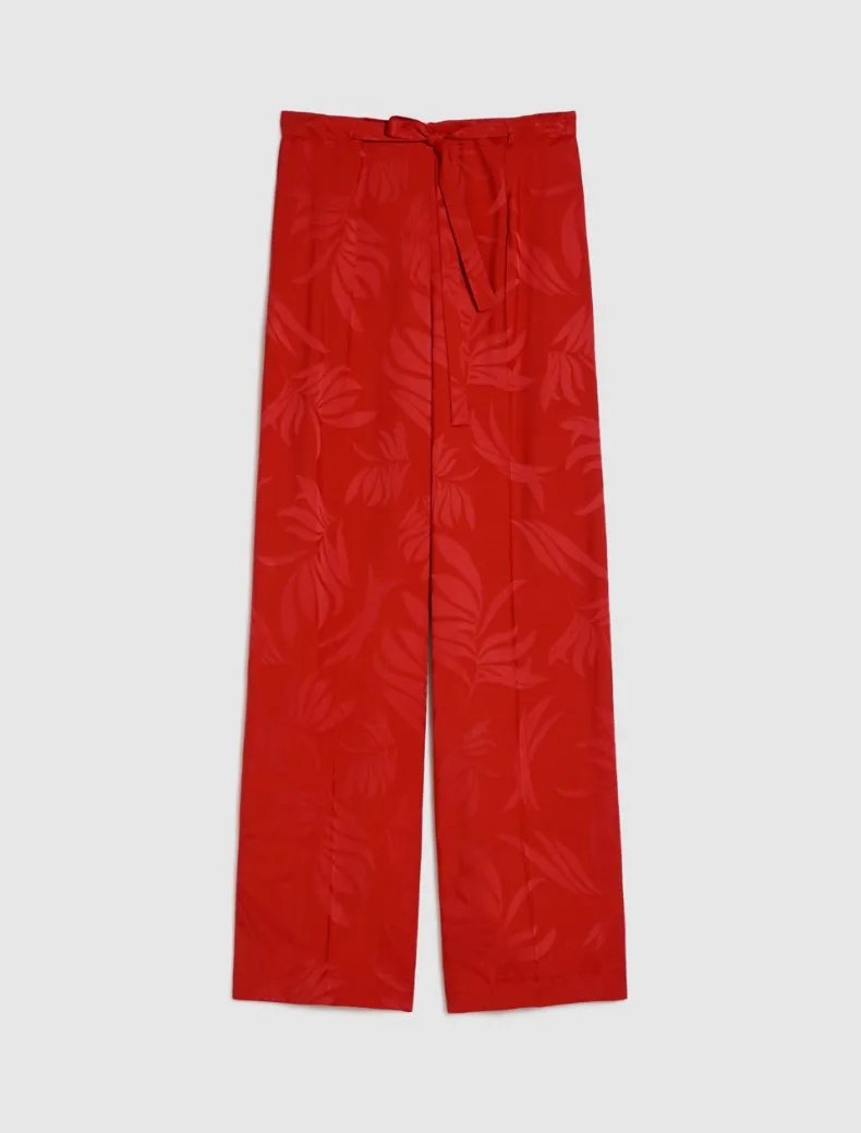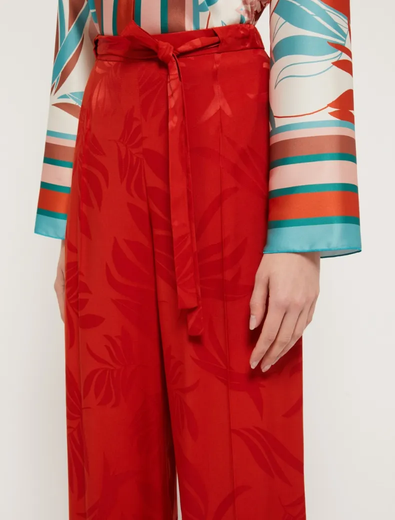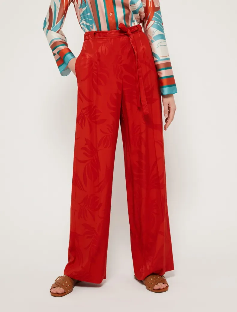 - Pantaloni in viscosa jacquard dalla linea ampia, con cintone completo di passanti e pinces sul davanti. La fusciacca da annodare in vita definisce la silhouette. Chiusura con zip. Lunghezza 115 cm.