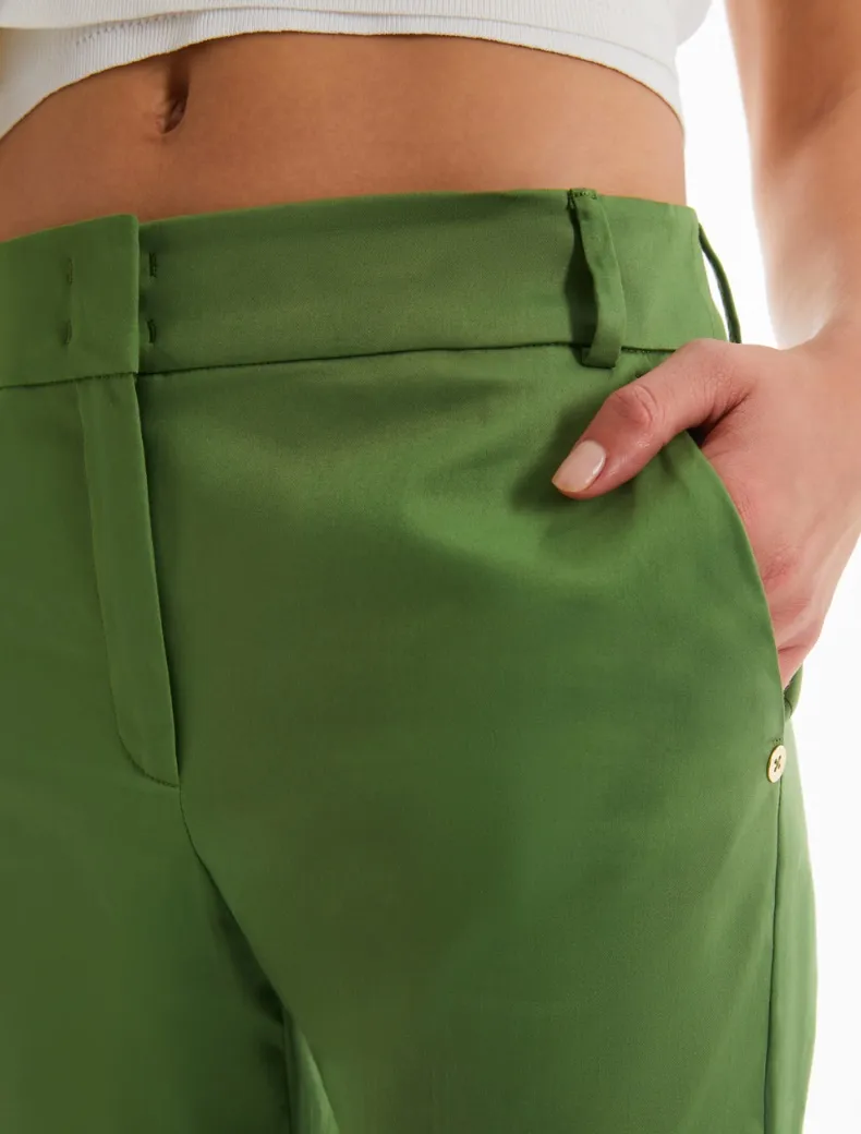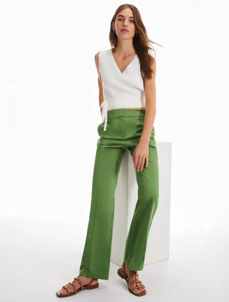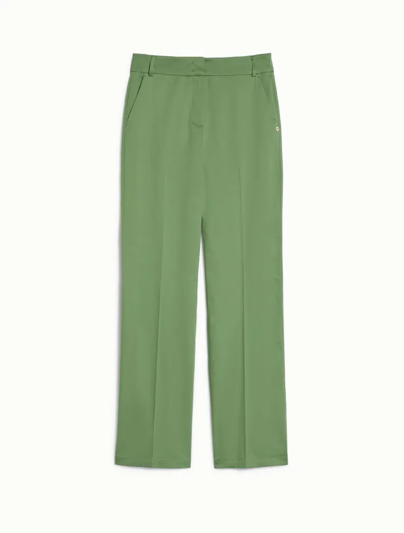 - Pantaloni flare fit in raso di cotone stretch. Hanno linee diritte fino al ginocchio e leggermente svasate al fondo. Vita regolare e piega stirata, chiusura nascosta con zip. Con il blazer coordinato o in mix & match, sempre cool.
