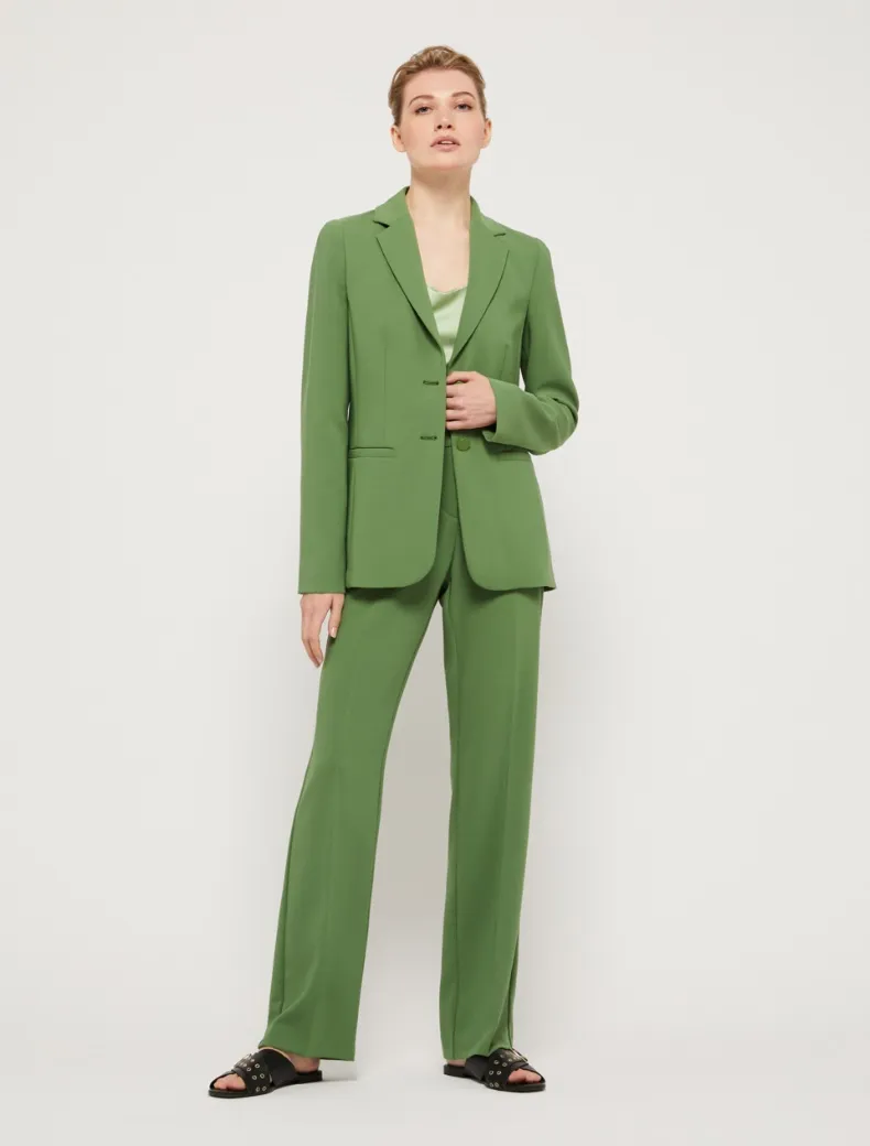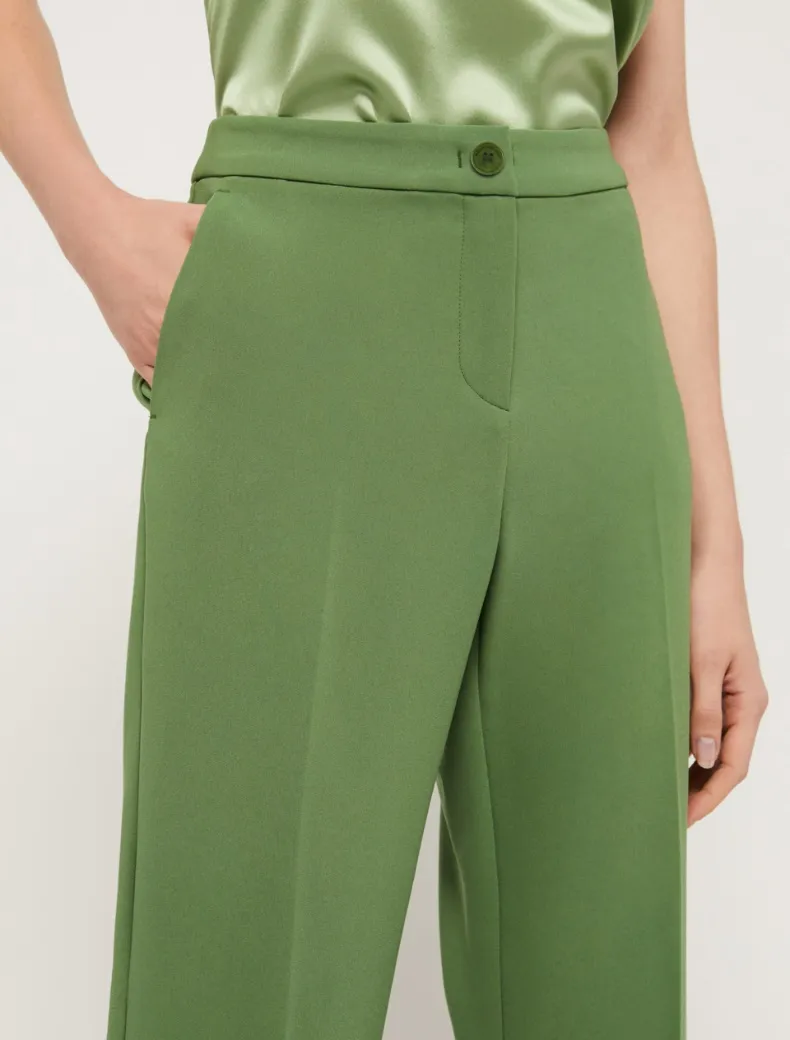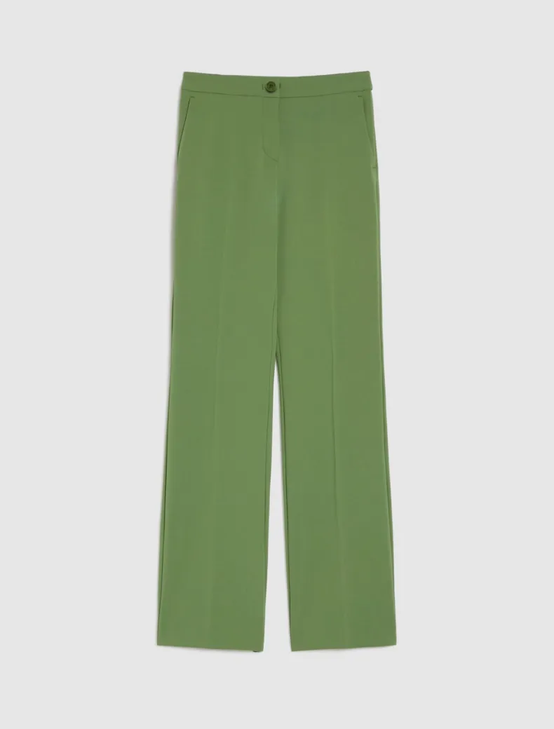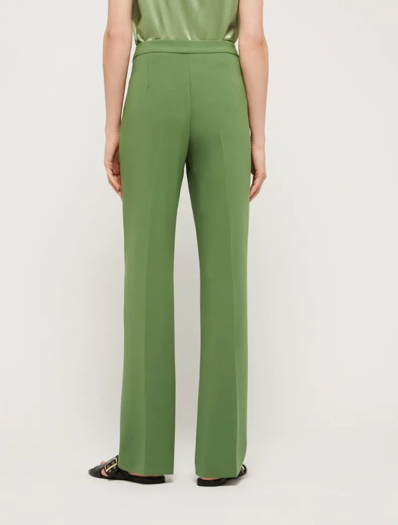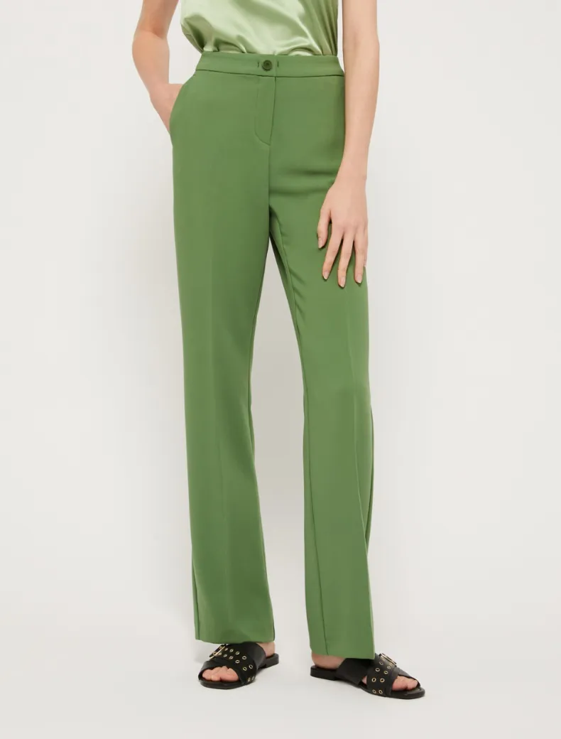 - Pantaloni flair in cady bistretch con piega stirata al centro e tasche alla francese. Chiusura con gancio e bottone interno. Lunghezza 112 cm.