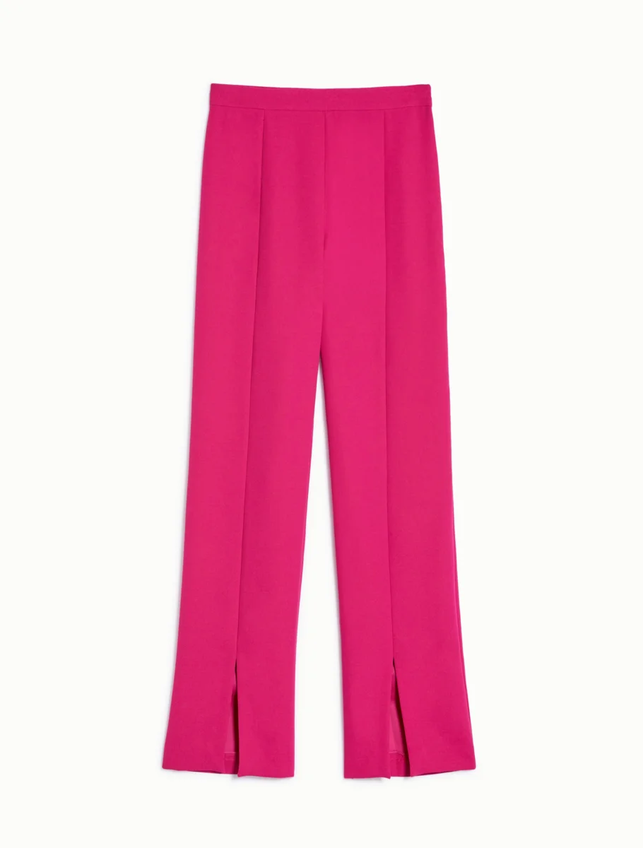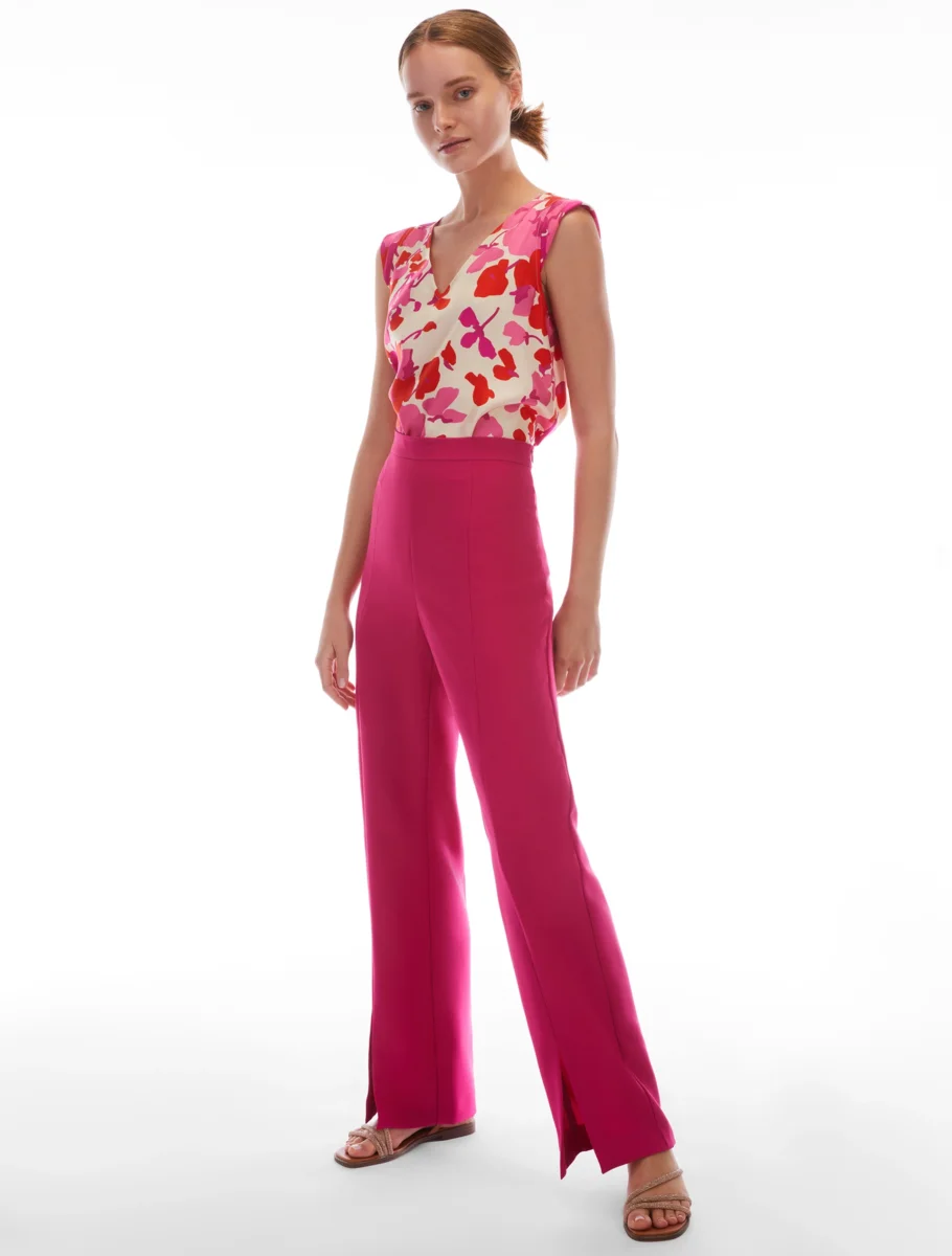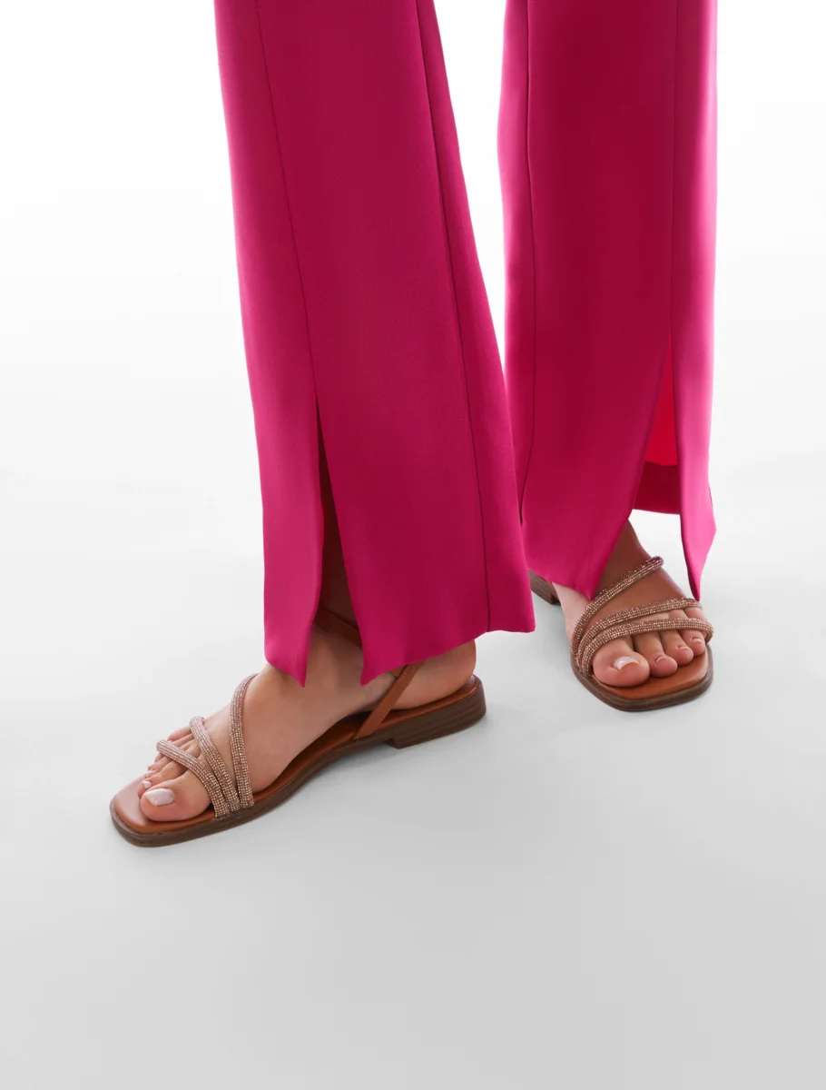 - Pantaloni fluidi in envers satin opaco. Hanno linee diritte e morbide, slanciate da tagli verticali e mosse dagli spacchi al fondo. Vita regolare, design pulito senza tasche e zip invisibile al fianco. Basta un top chic per un party look perfetto.