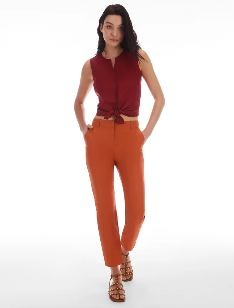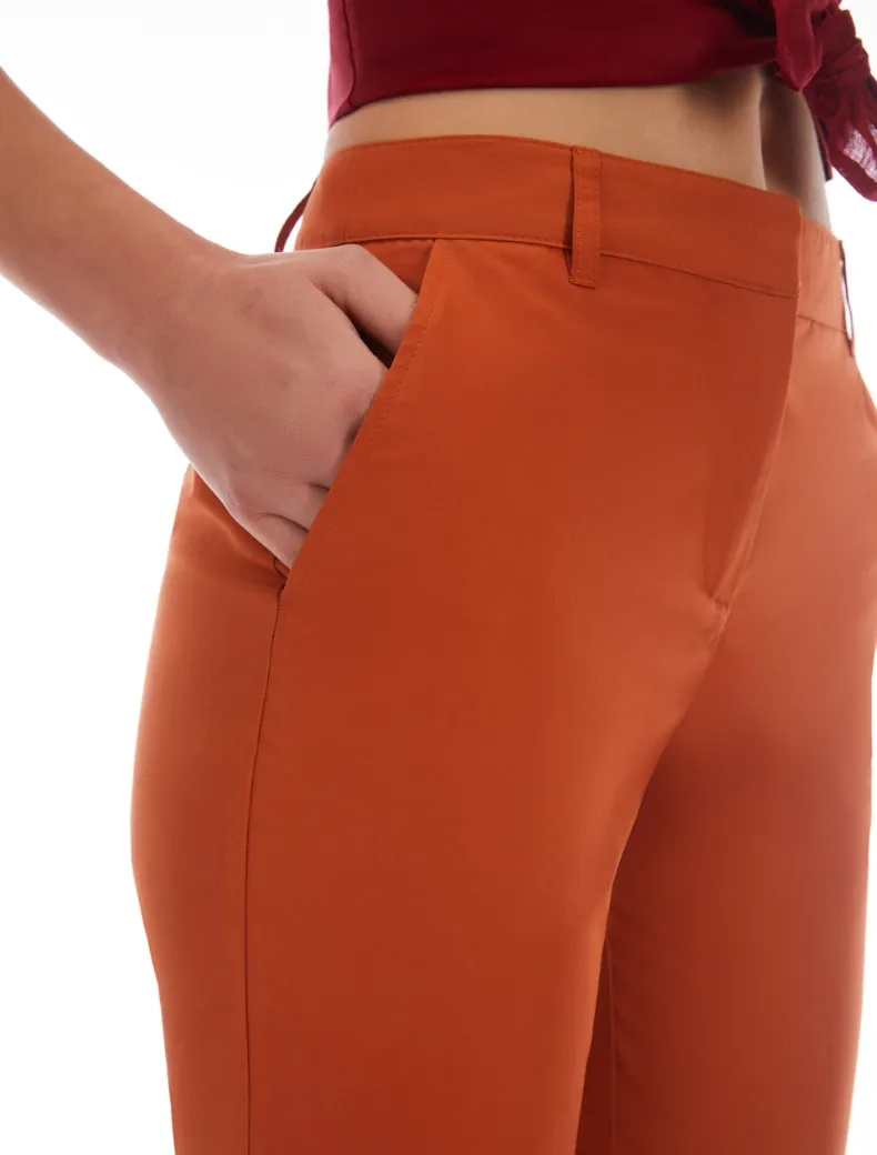 - Pantaloni in popeline di cotone. Hanno linee affusolate con lunghezza alla caviglia. Vita regolare, tasche alla francese sul davanti e spacchetti laterali al fondo. Chiusura nascosta con zip. Per mix & match estivi.