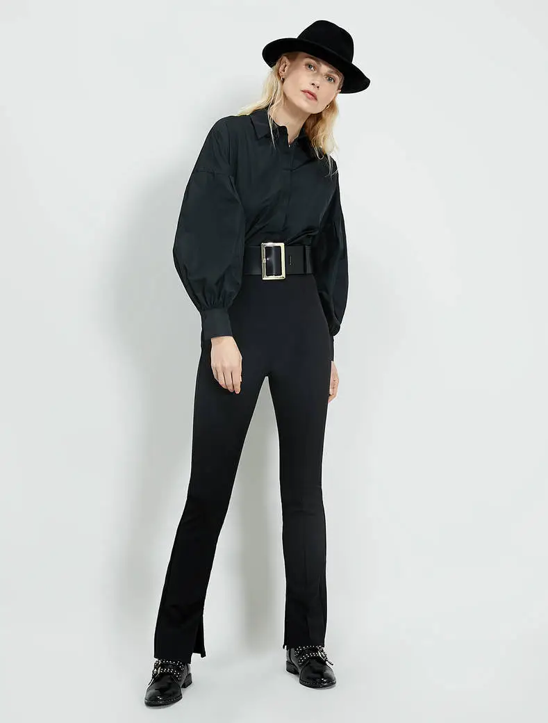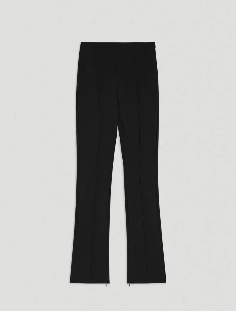 - taglio aderente con gamba diritta. Creano una silhouette allungata grazie alla vita medio-alta, alle nervature verticali e alle zip al fondo che si aprono per distendere l’orlo fino al tallone. Zip invisibile al fianco.