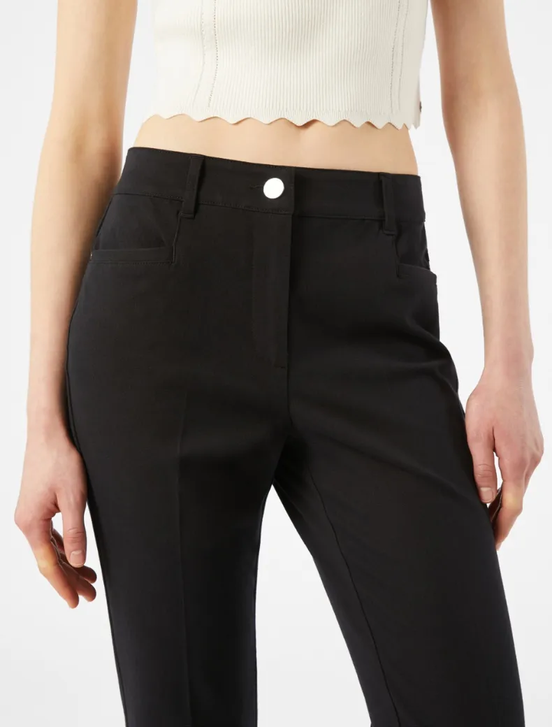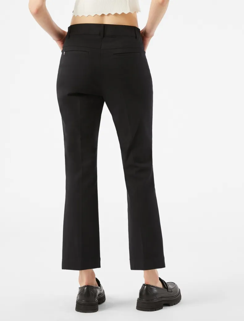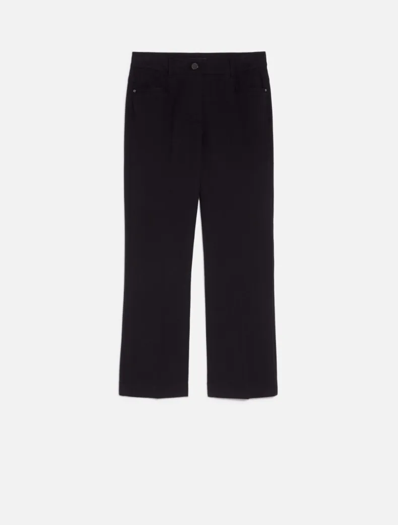 - Pantaloni mini-flare fit in twill di cotone e viscosa bi-stretch. Hanno un taglio slim fino al ginocchio e leggermente svasato al fondo, con lunghezza alla caviglia. Vita regolare e piega stirata, zip nascosta.