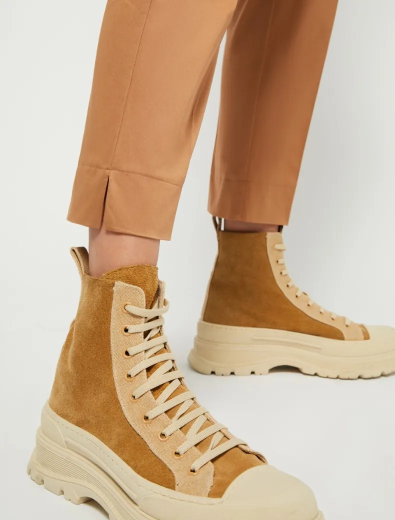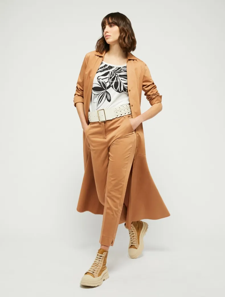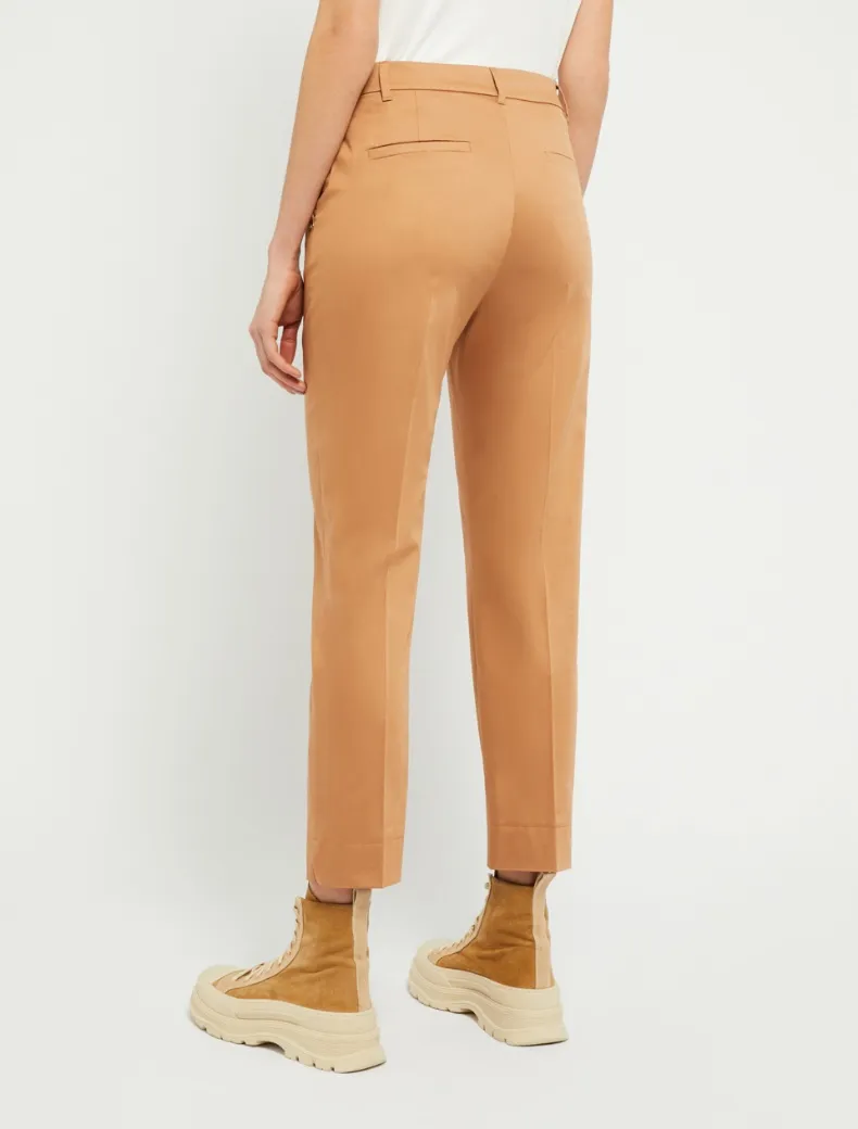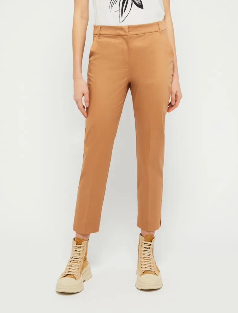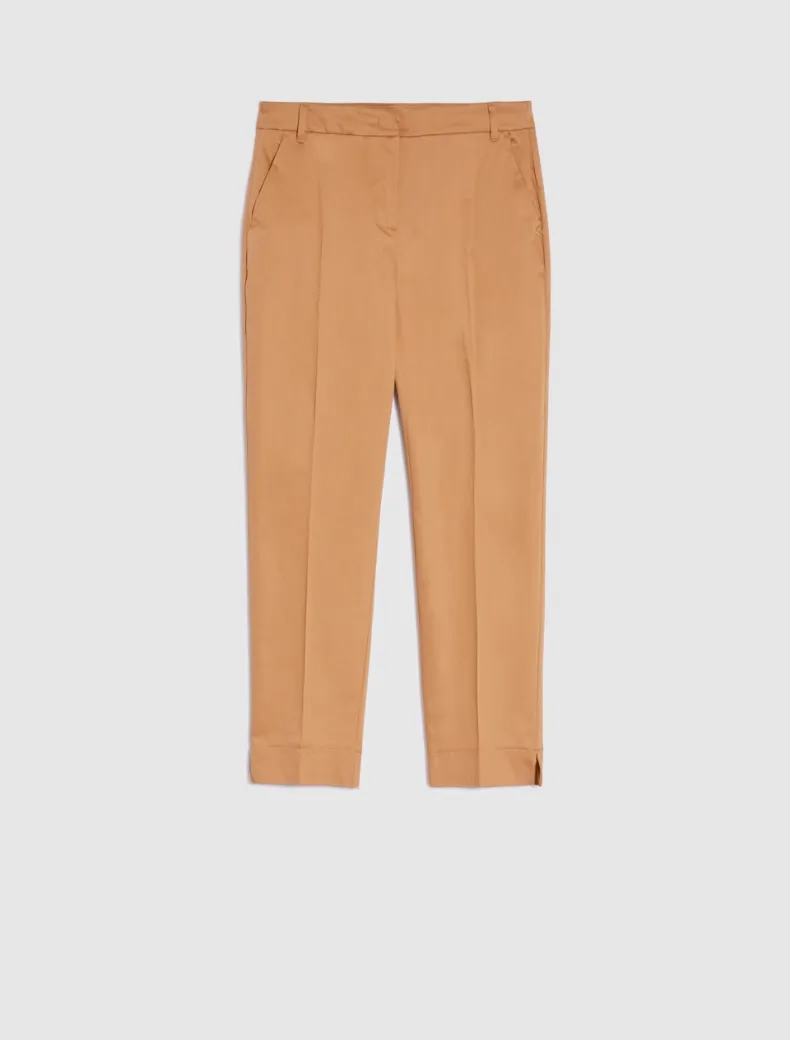 - Taglio slim sartoriale per i pantaloni in raso di cotone stretch. Gamba affusolata con piega stirata e spacchetti alla caviglia, tasche alla francese davanti e a filo dietro, vita media e zip nascosta. Un classico da portare ora e ancora.