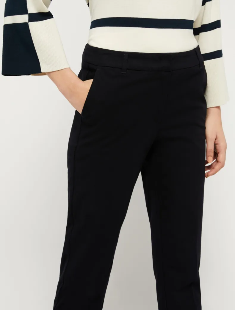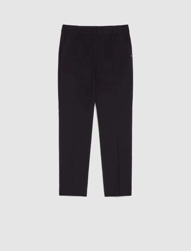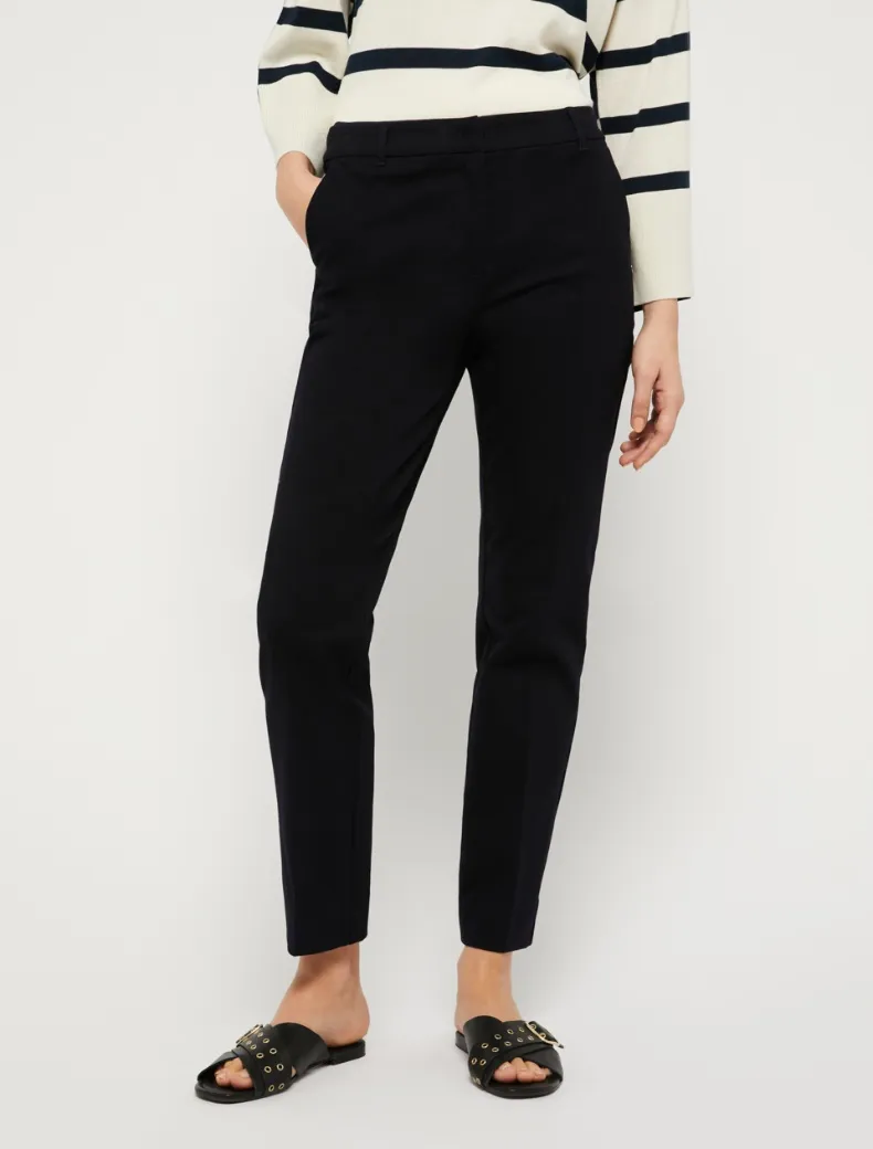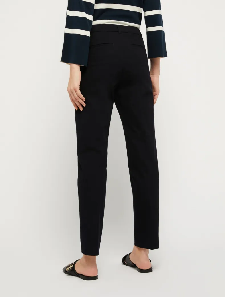 • Pantaloni in cotone stretch dalla linea classica e regolare, chiusi con gancio e zip nascosta. Tasche alla francese davanti e a filetto dietro. Piega stirata.