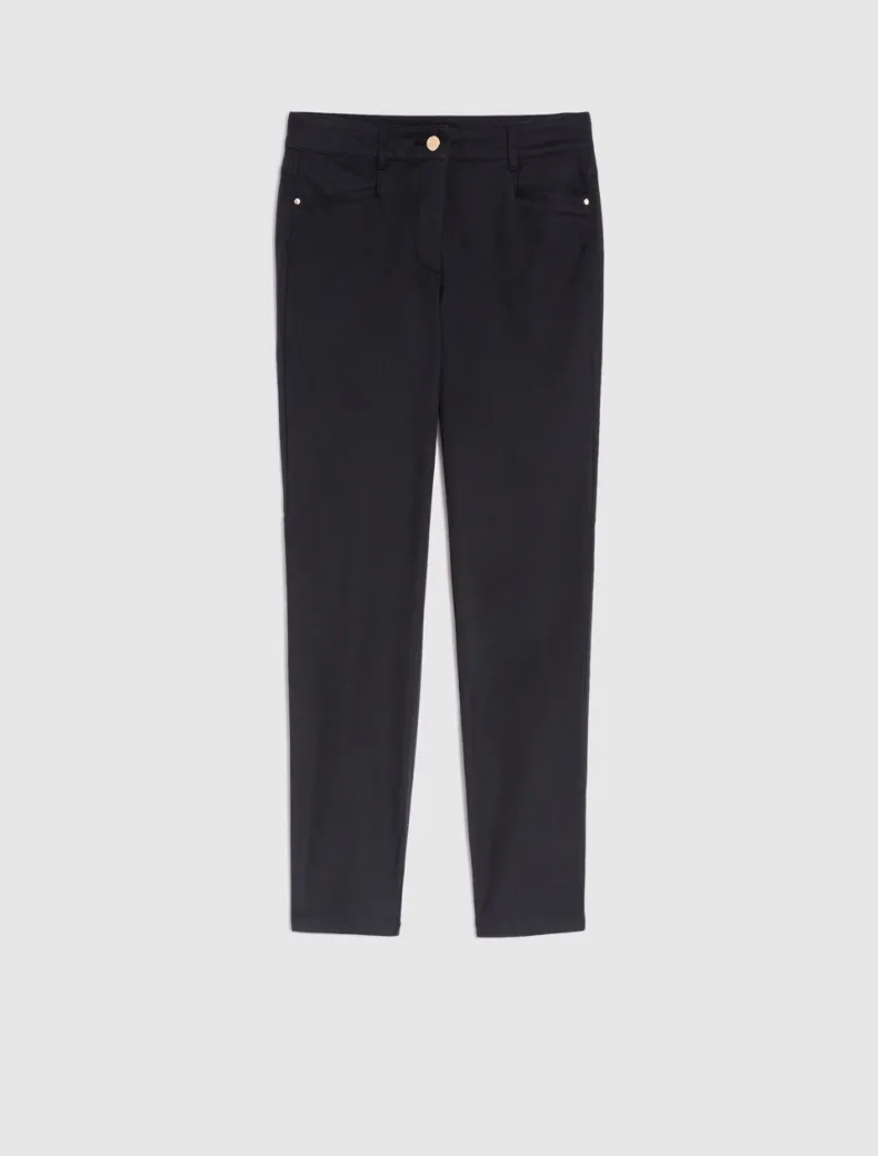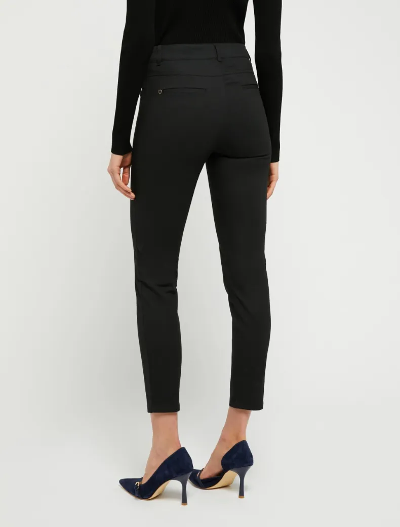 • Pantaloni in cotone stretch dalla linea classica e regolare, chiusi con bottone e zip nascosta. Tasche alla francese davanti e a filetto dietro. Piega stirata.