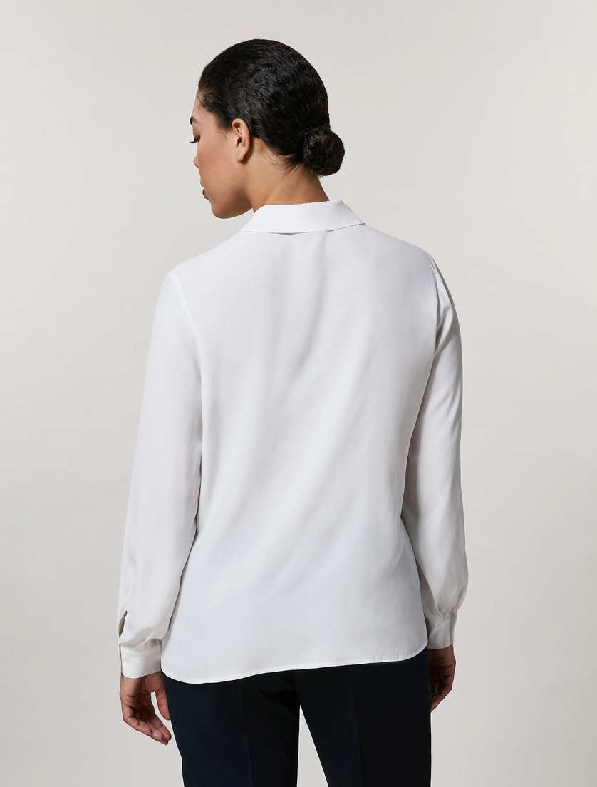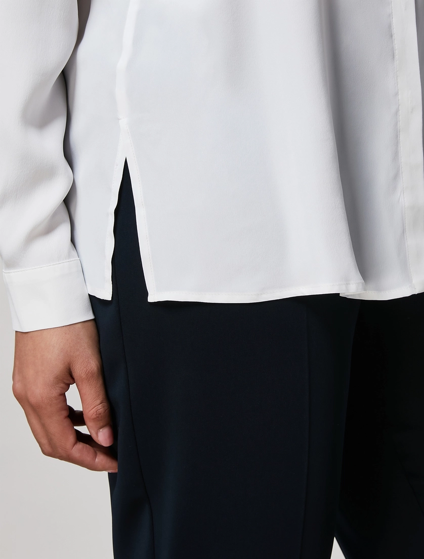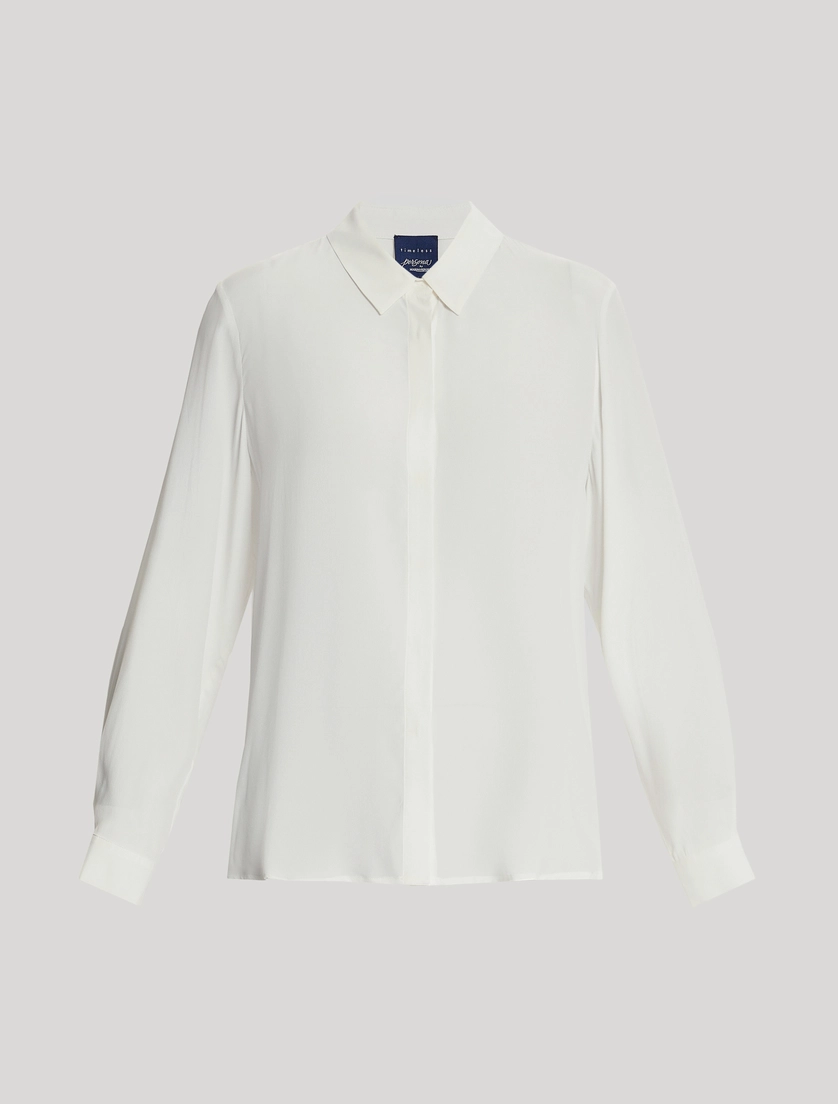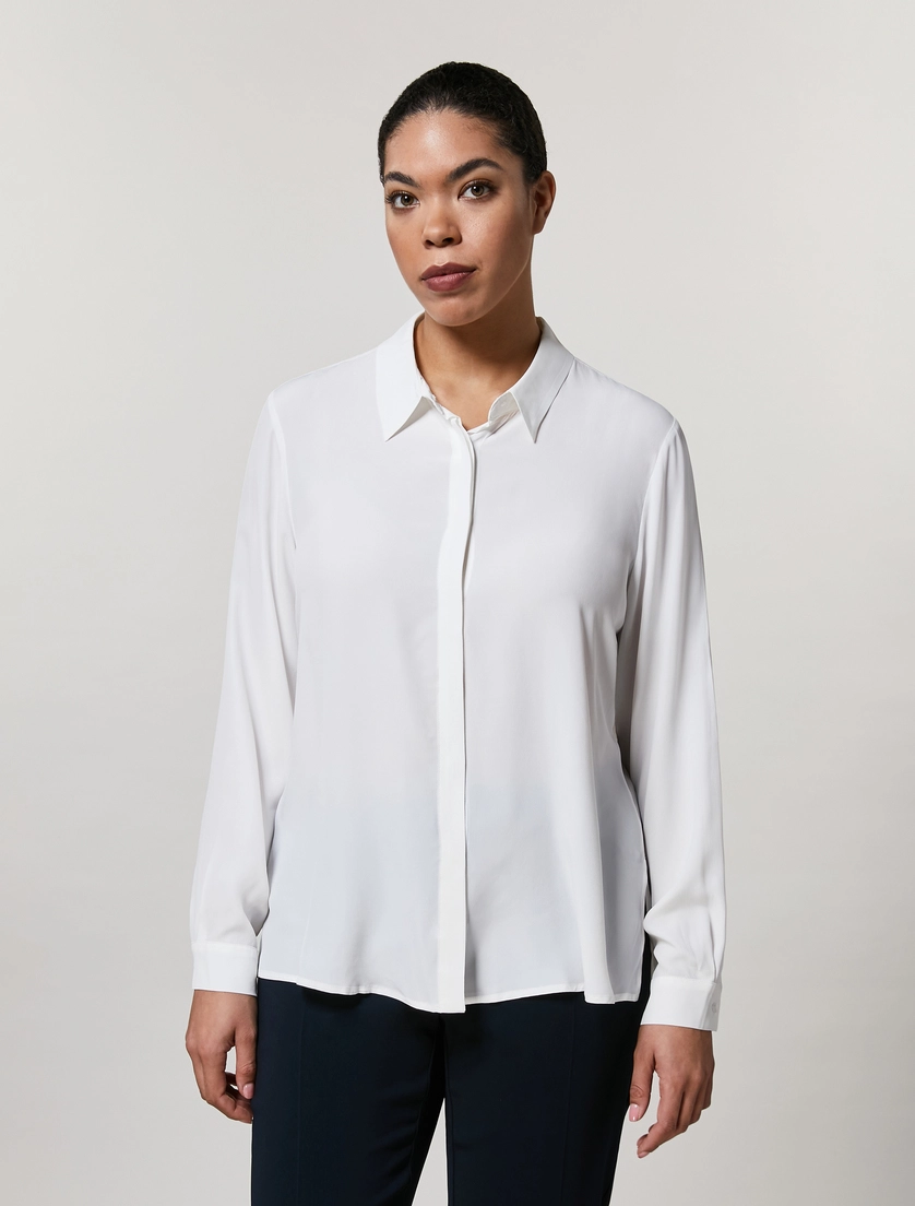 - Camicia in morbido misto seta. Colletto classico, maniche lunghe con polsi al fondo, chiusura con finta e bottoni a pressione. Lunghezza 66,5 cm. Dalla linea dritta, ha un design essenziale. Un evergreen di ogni stagione. Il capo fa parte della collezione Persona by Marina Rinaldi.
