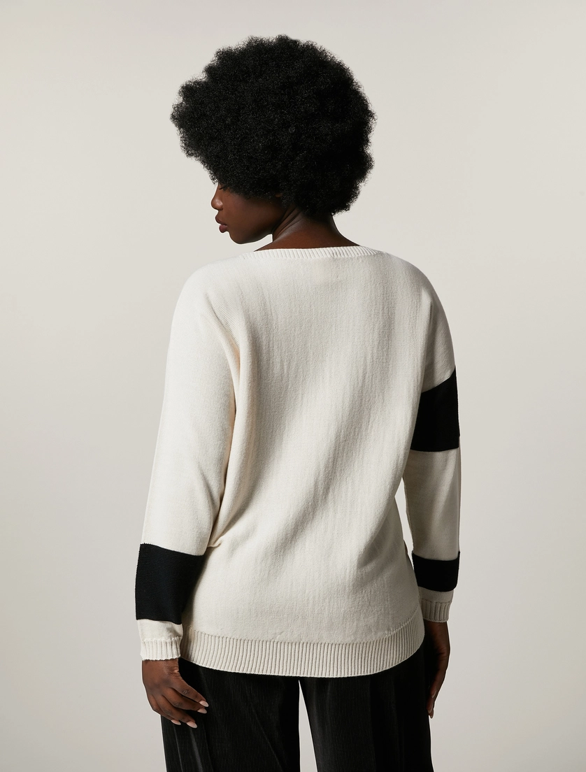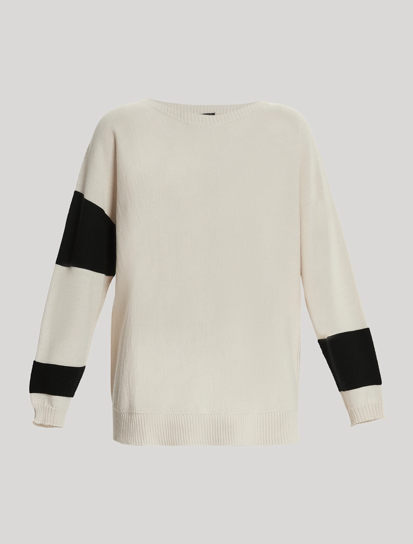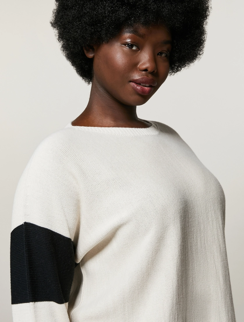 - Maglia seamless in morbido misto di lana merino pettinata, con lavorazione a punto rasato e dettagli a contrasto. Scollo a barchetta, maniche lunghe, orlo stondato a fondo capo. Linea morbida, per un fit confortevole.