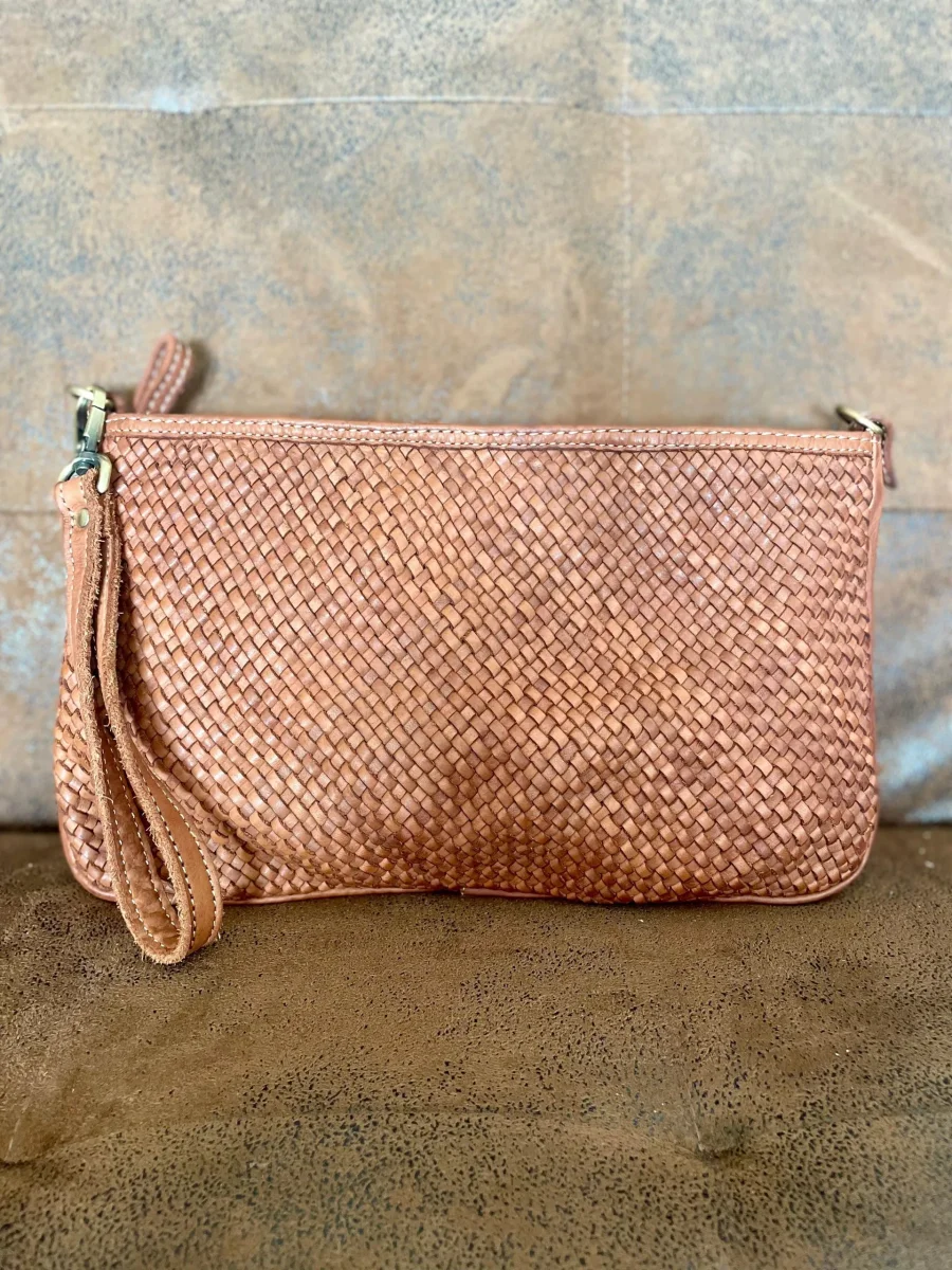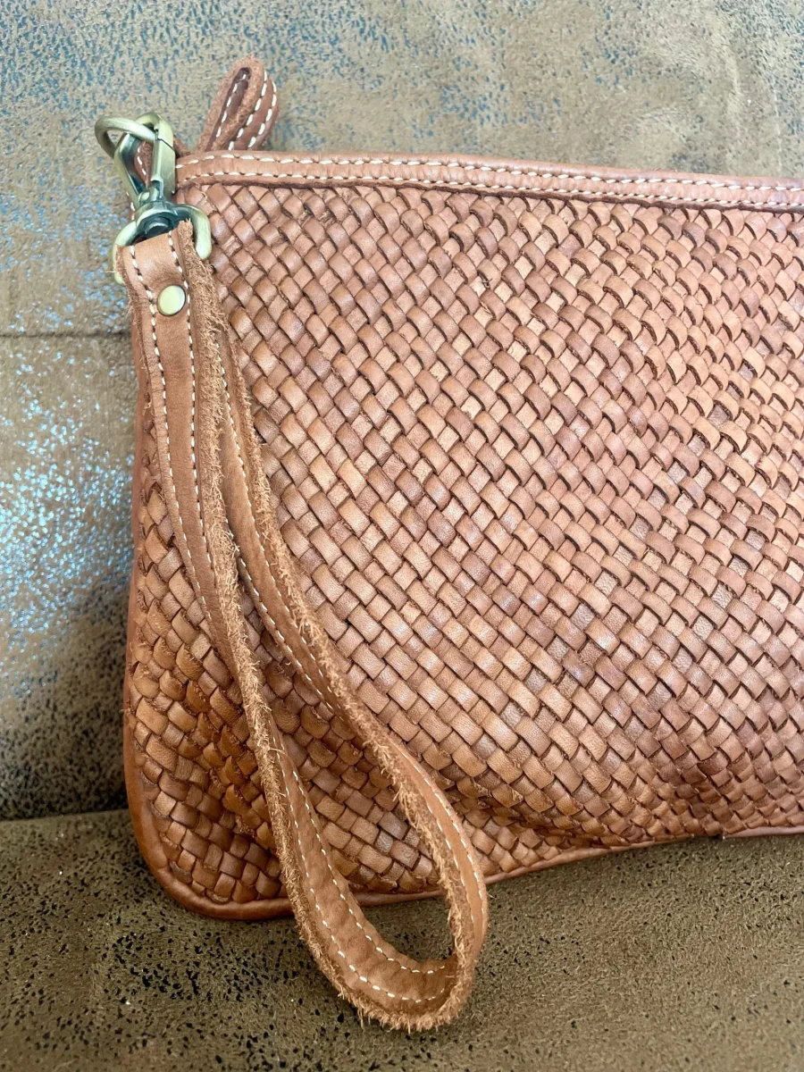 Borsa pochette, con laccio da portare al polso, in vera pelle lavata finemente intrecciata. Dotata di tracolla. Chiusura con bottone automatico e zip. Tasca interna con cerniera Dimensioni: 30 cm x 17 cm Alta qualità Lavorazione artigianale italiana Colori: Cuoio, testa di moro e nero