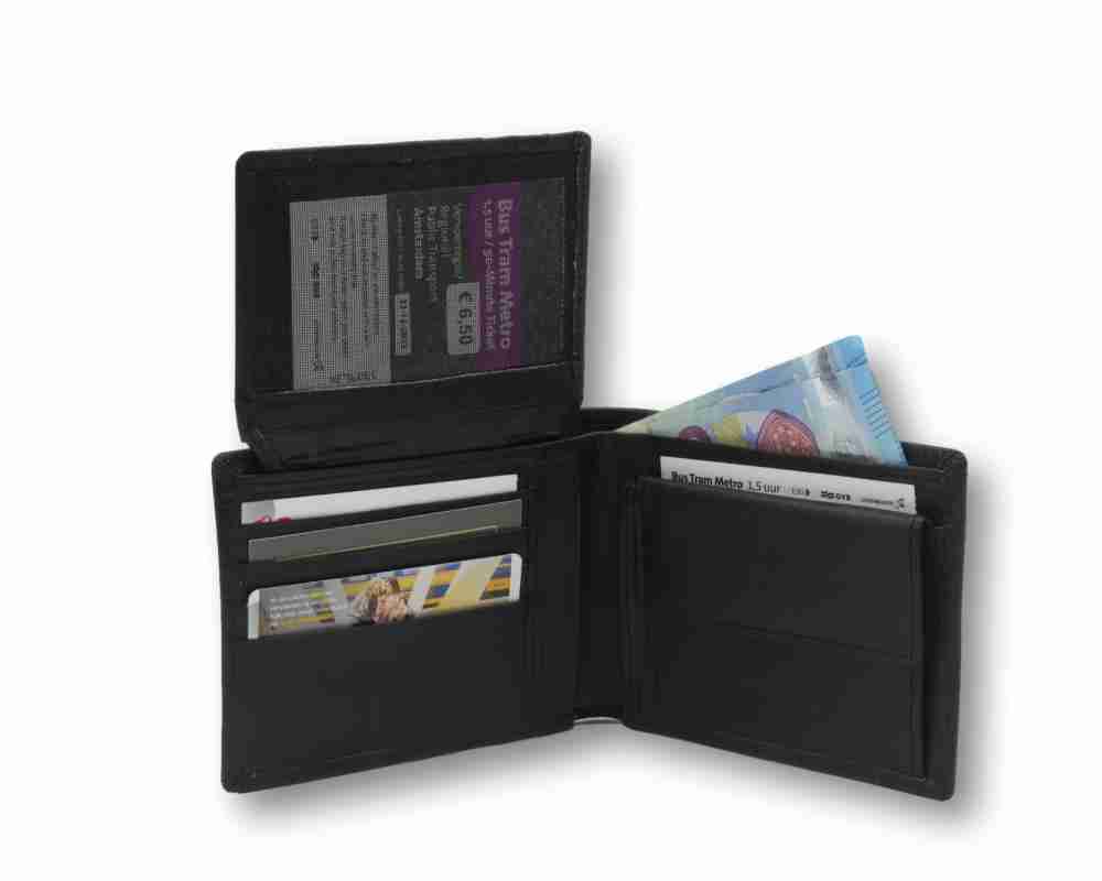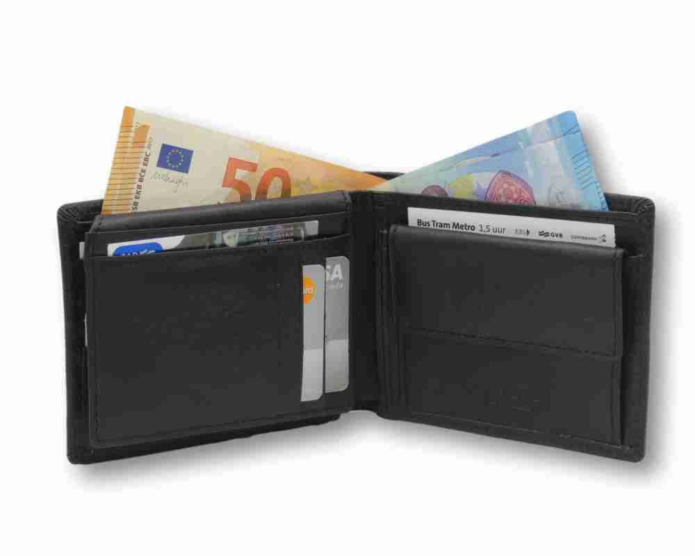 Doppio scomparto per banconote, 10 scomparti per carte di credito, tessere o biglietti da visita, 1 comparto porta documenti, 1 porta monete.