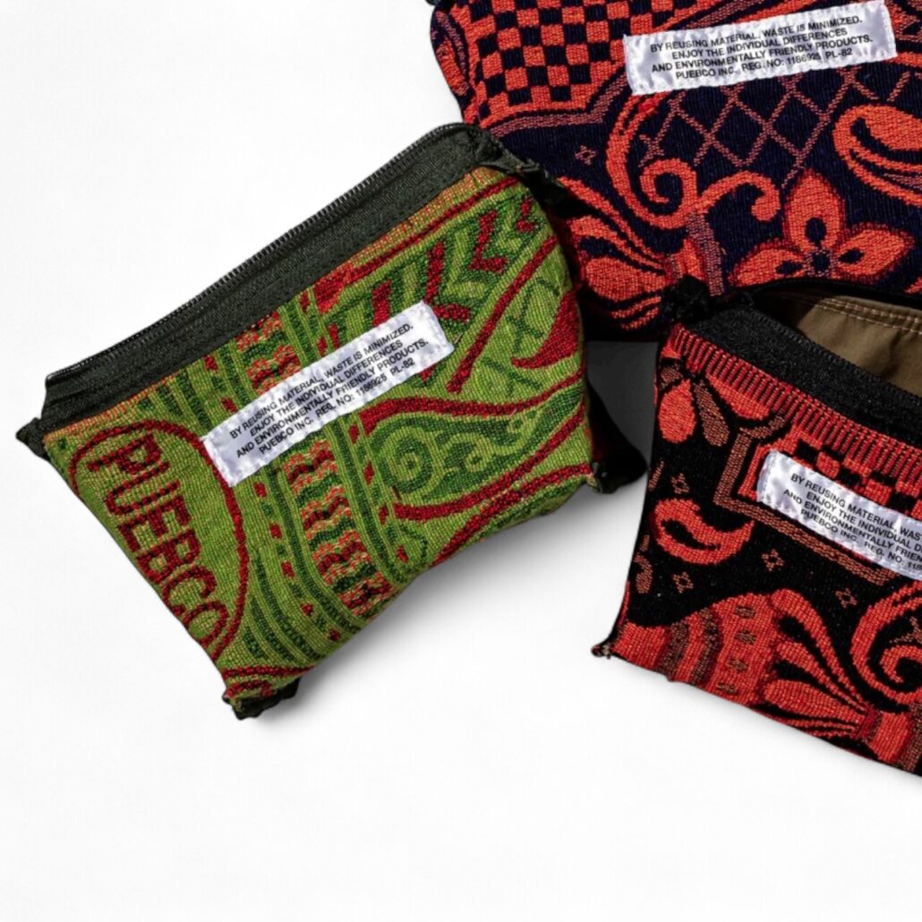 Ogni pouch è un pezzo unico perché realizzata in tessuto riciclato (cotone, nylon. Misure approx: 18 x 16 cm La filosofia di Puebco è proprio quella di creare nuovo valore utilizzando materiali riciclati.