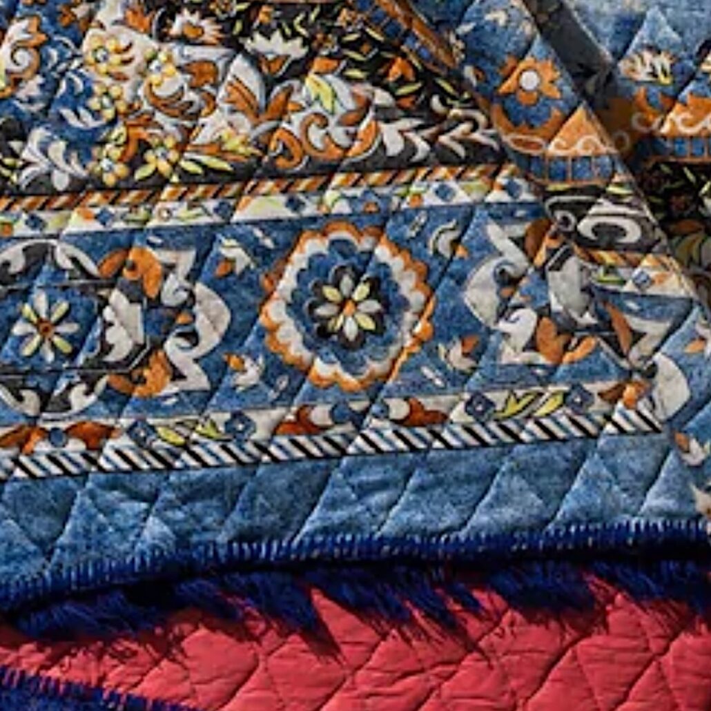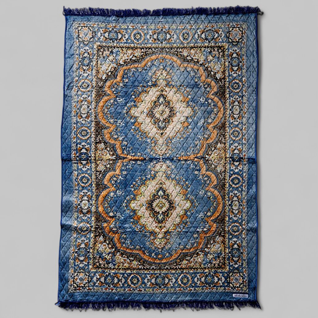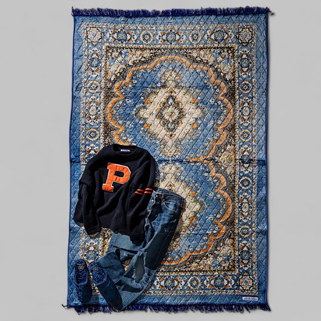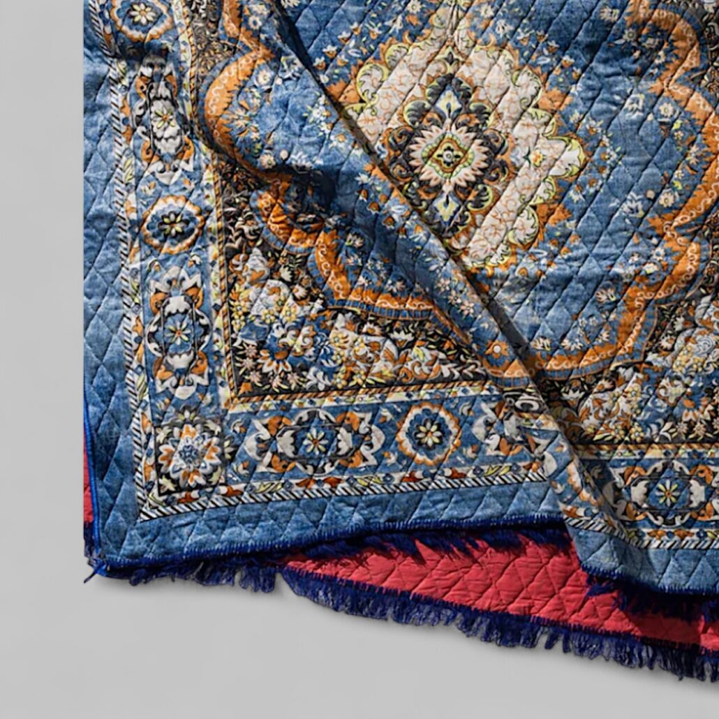 Tappeto in stile indiano, morbido e leggero realizzato con materiale di recupero. Misure: 140 x 210 cm – Misto cotone. Imbottitura.