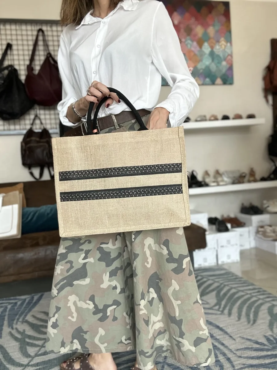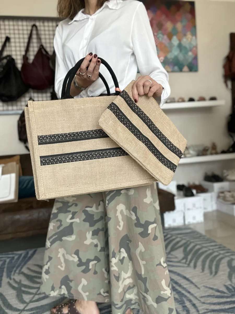 Borsa mare semplice con pochette coordinata. La pochette è dotata di chiusura lampo Dimensioni shopper: 40 x 30 x 10 cm Dimensioni pochette: 30 x 20 cm