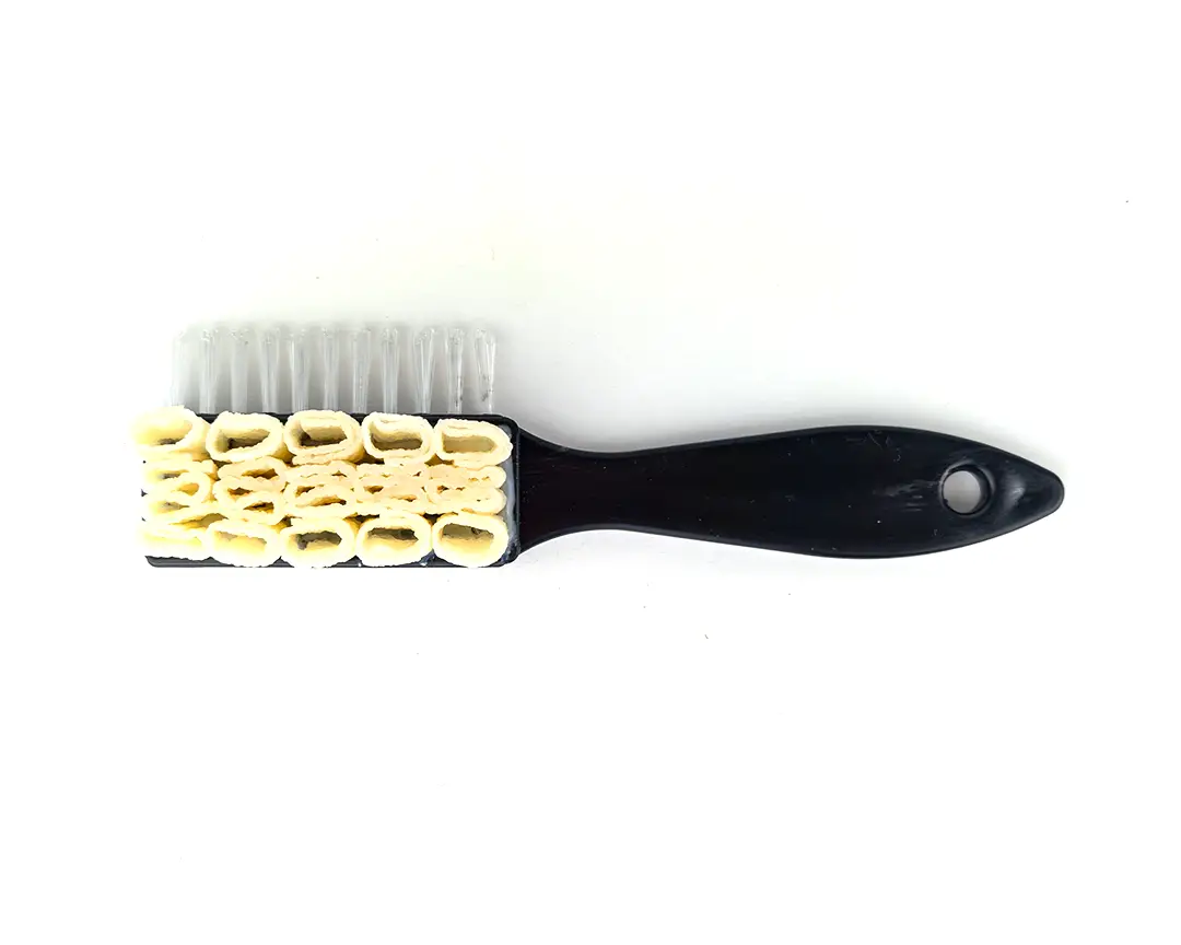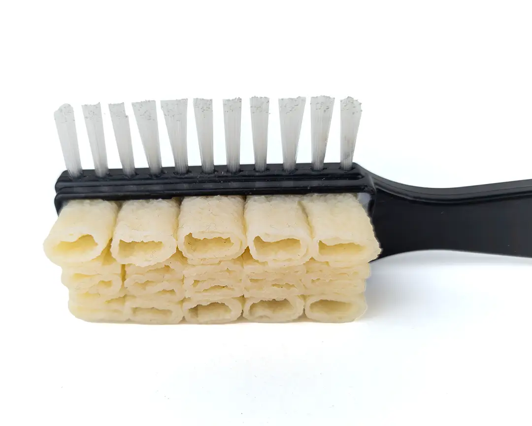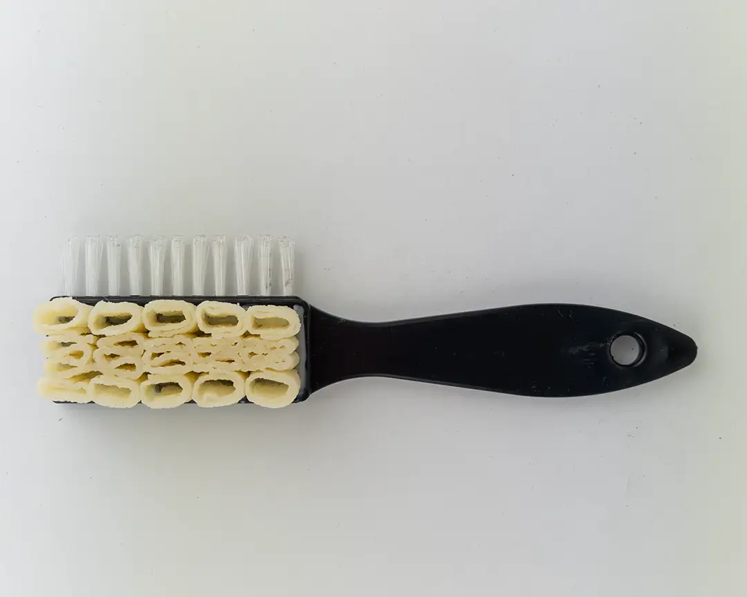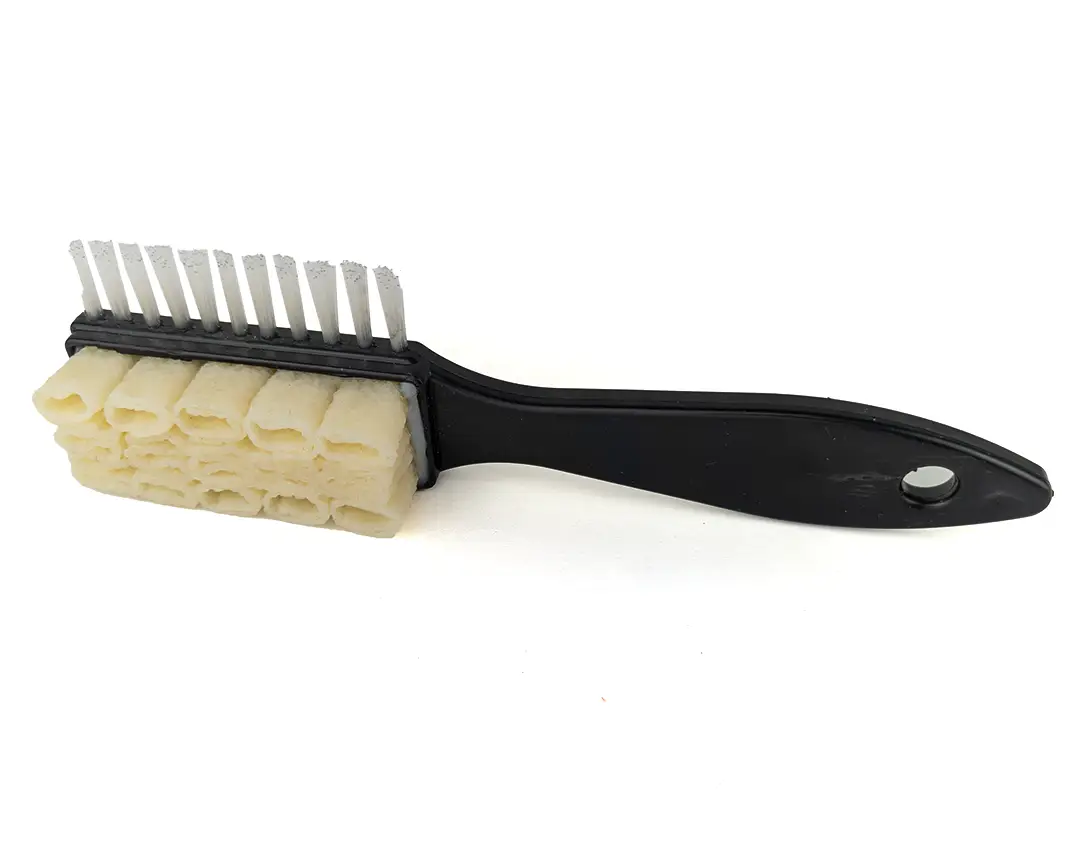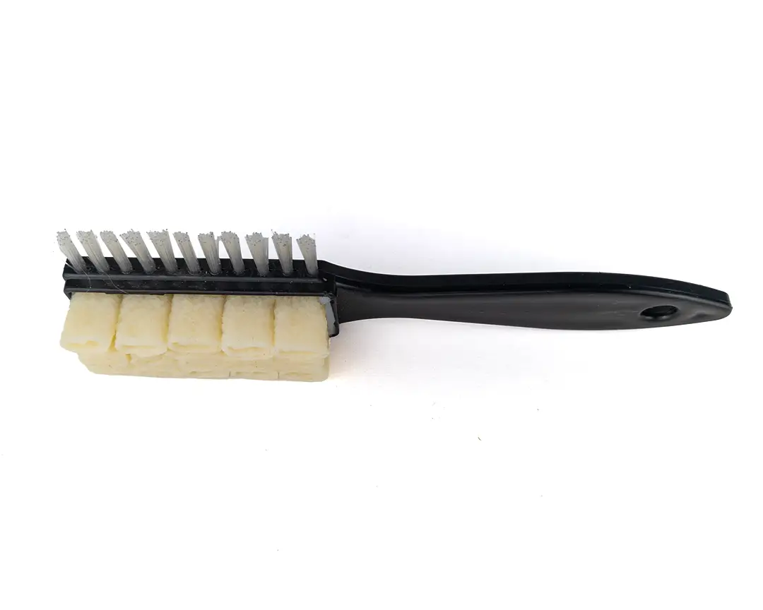 Le setole in plastica servono a pettinare il camoscio dopo la pulizia, mantenendolo uniforme.