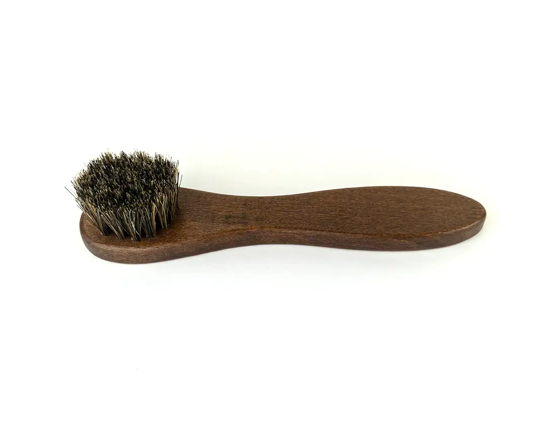 Compatta e maneggevole, questa spazzolina scarpe pelle è pensata per raggiungere anche le zone più difficili, garantendo un risultato uniforme e professionale. Il corpo in legno naturale, scuro e solido, offre una presa ergonomica e confortevole che facilita ogni movimento. La sua forma compatta la rende perfetta sia per l’uso quotidiano che per il trasporto in valigia.