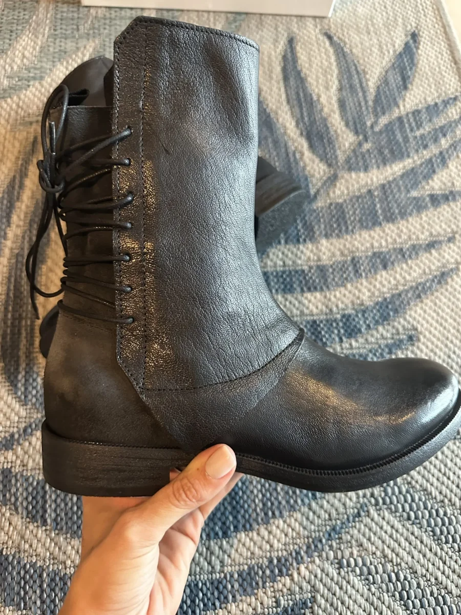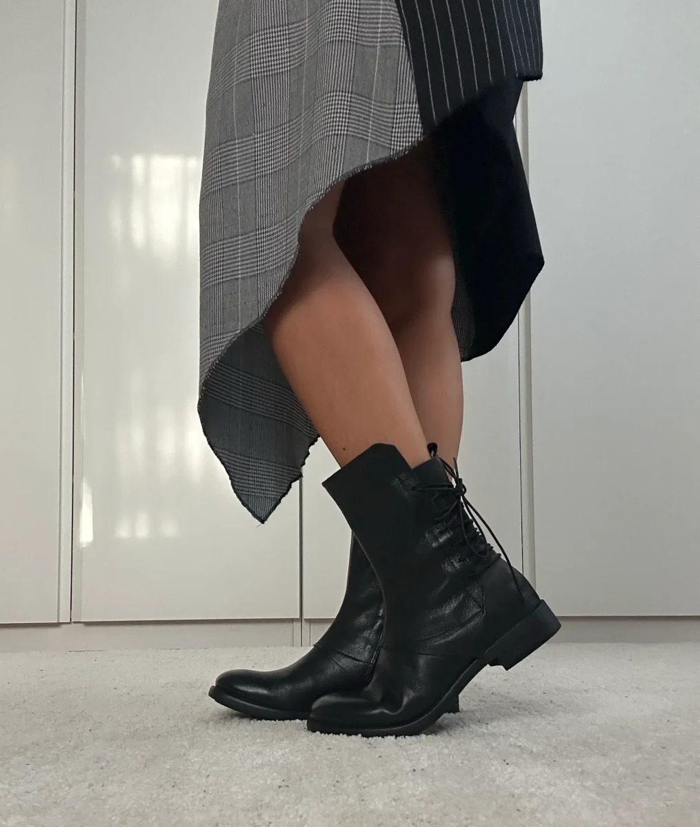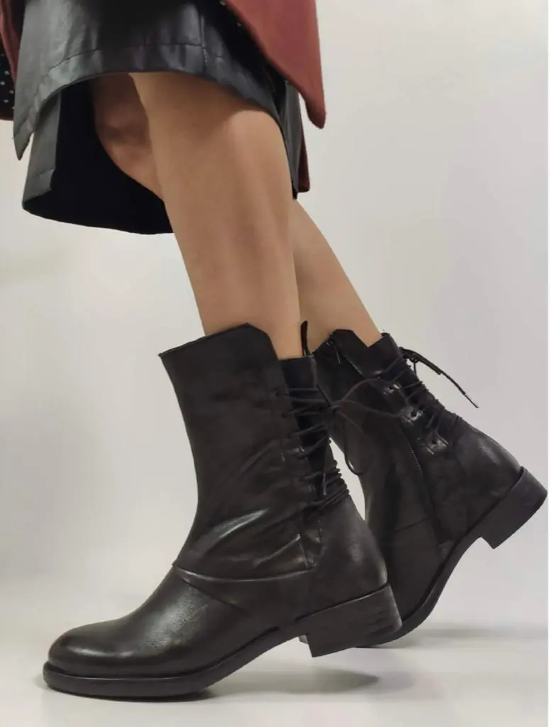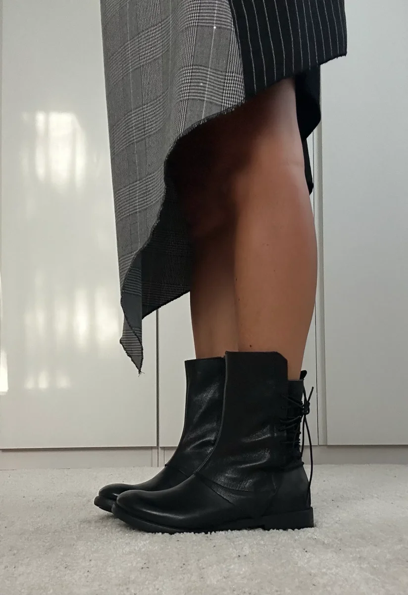 Stivale in vera pelle altezza media modello LONDRA Zip laterale per facilitarne l’ indosso Stringa elastica sul retro Altezza tacco 3 cm, altezza totale 23 cm Suola in gomma Lavorazione artigianale italiana