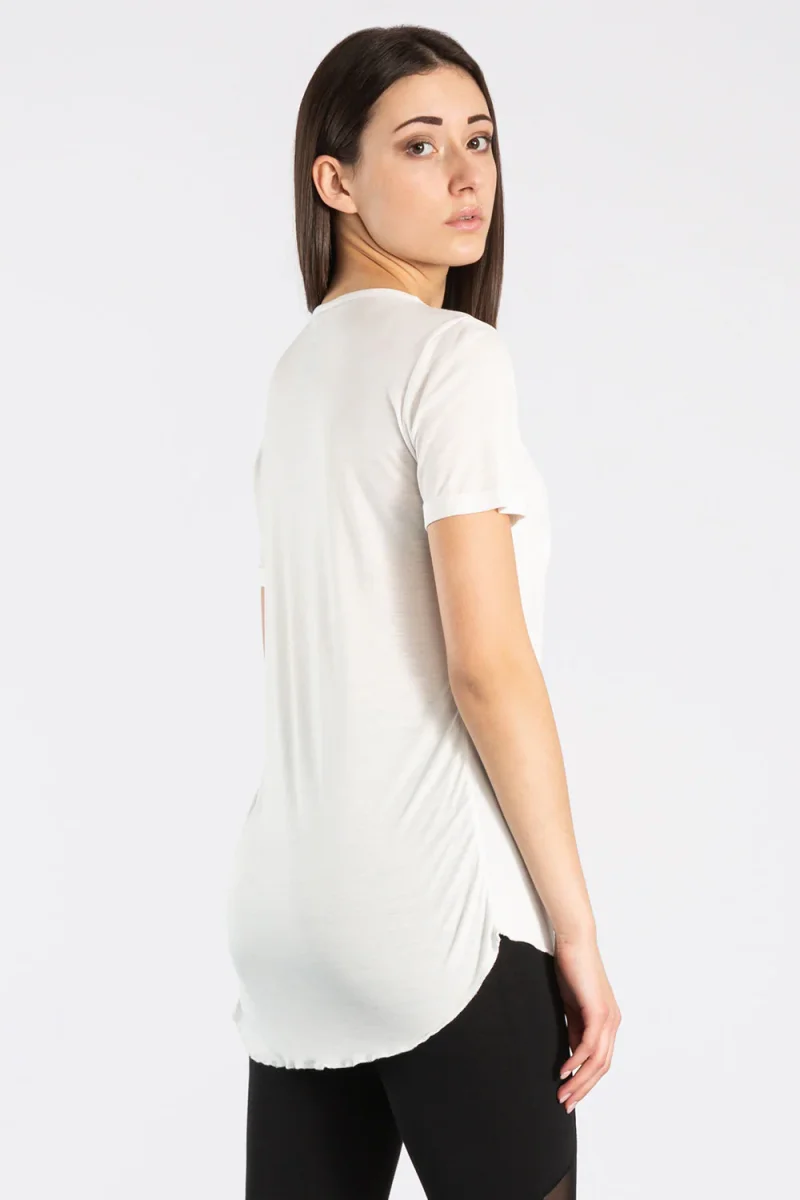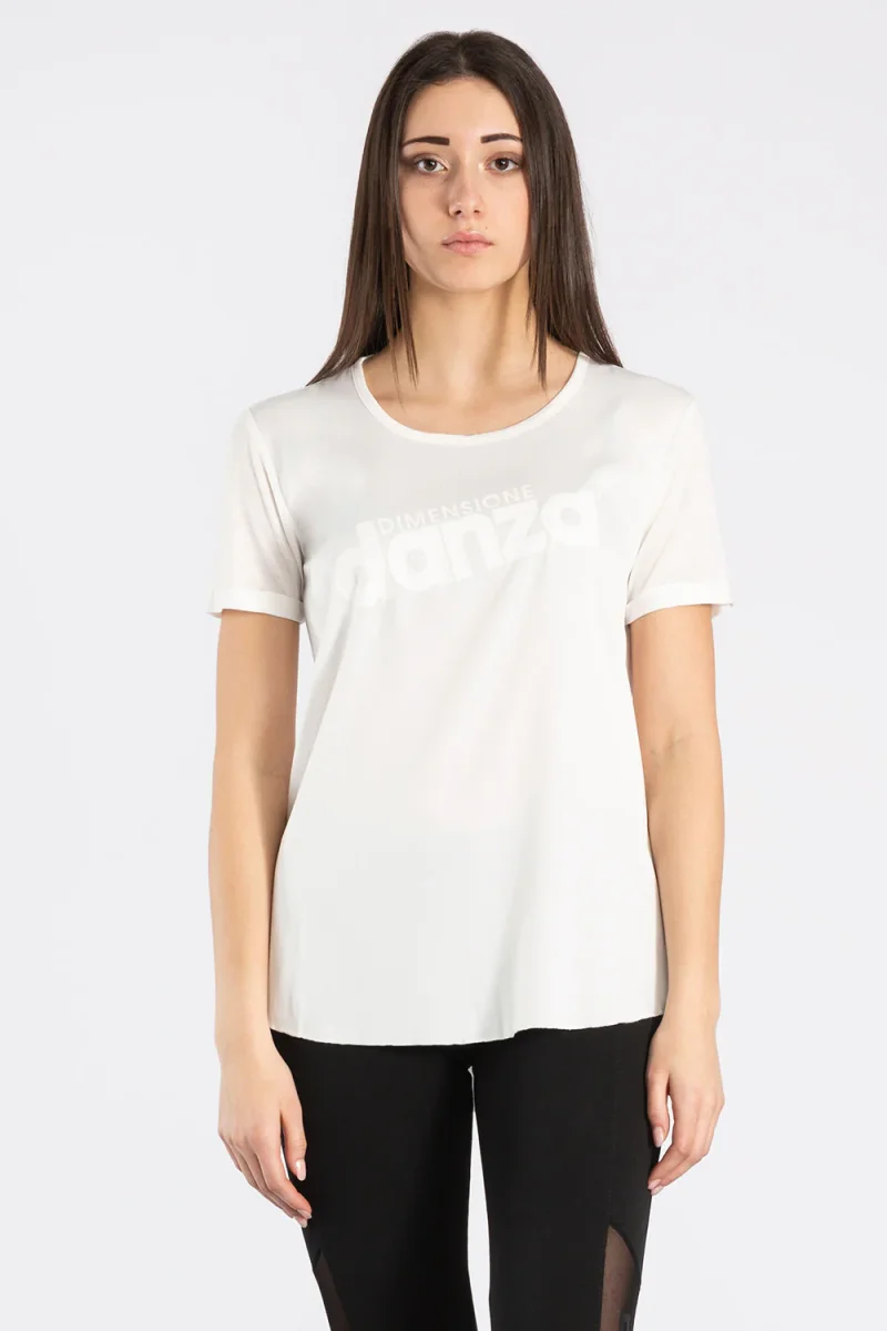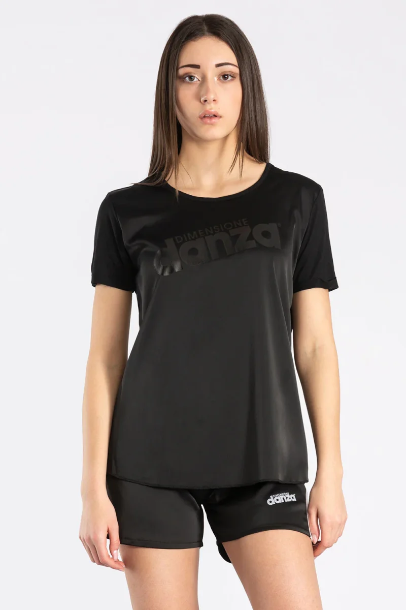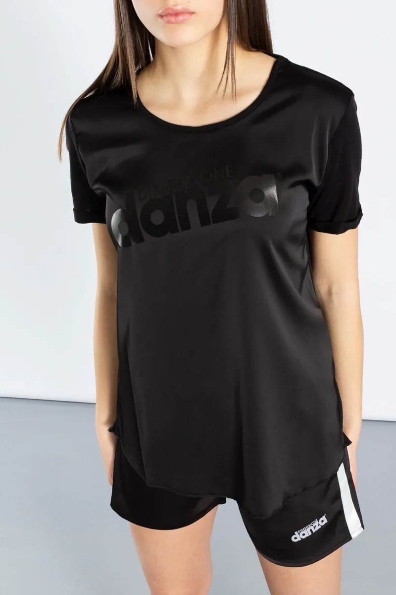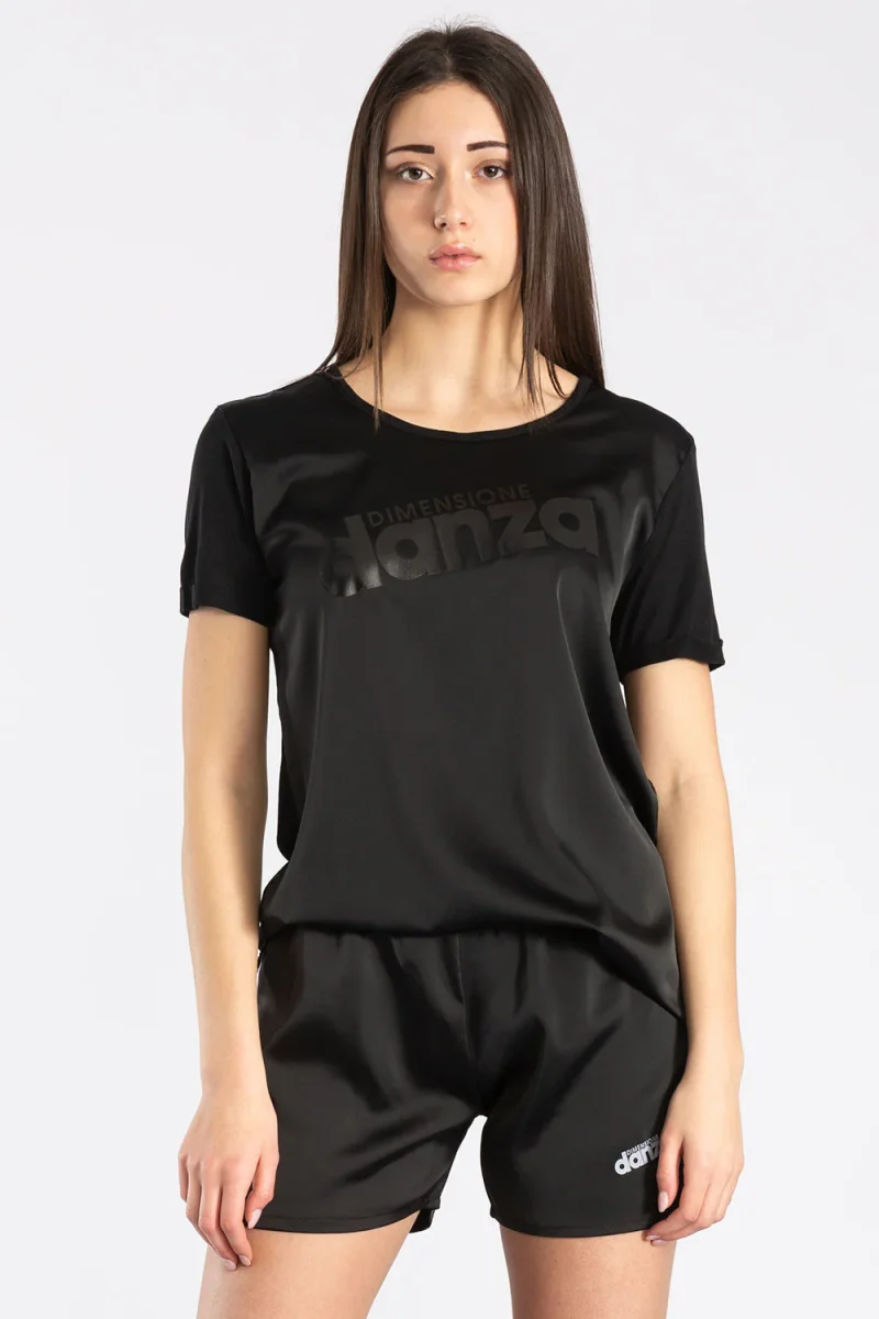 T-shirt a maniche corte in doppio tessuto: il raso sul davanti dona eleganza e raffinatezza, mentre il jersey modal sul retro garantisce comfort e morbidezza. Il logo Dimensione Danza tono su tono crea un contrasto tra la brillantezza della stampa e la opacitร del tessuto.
